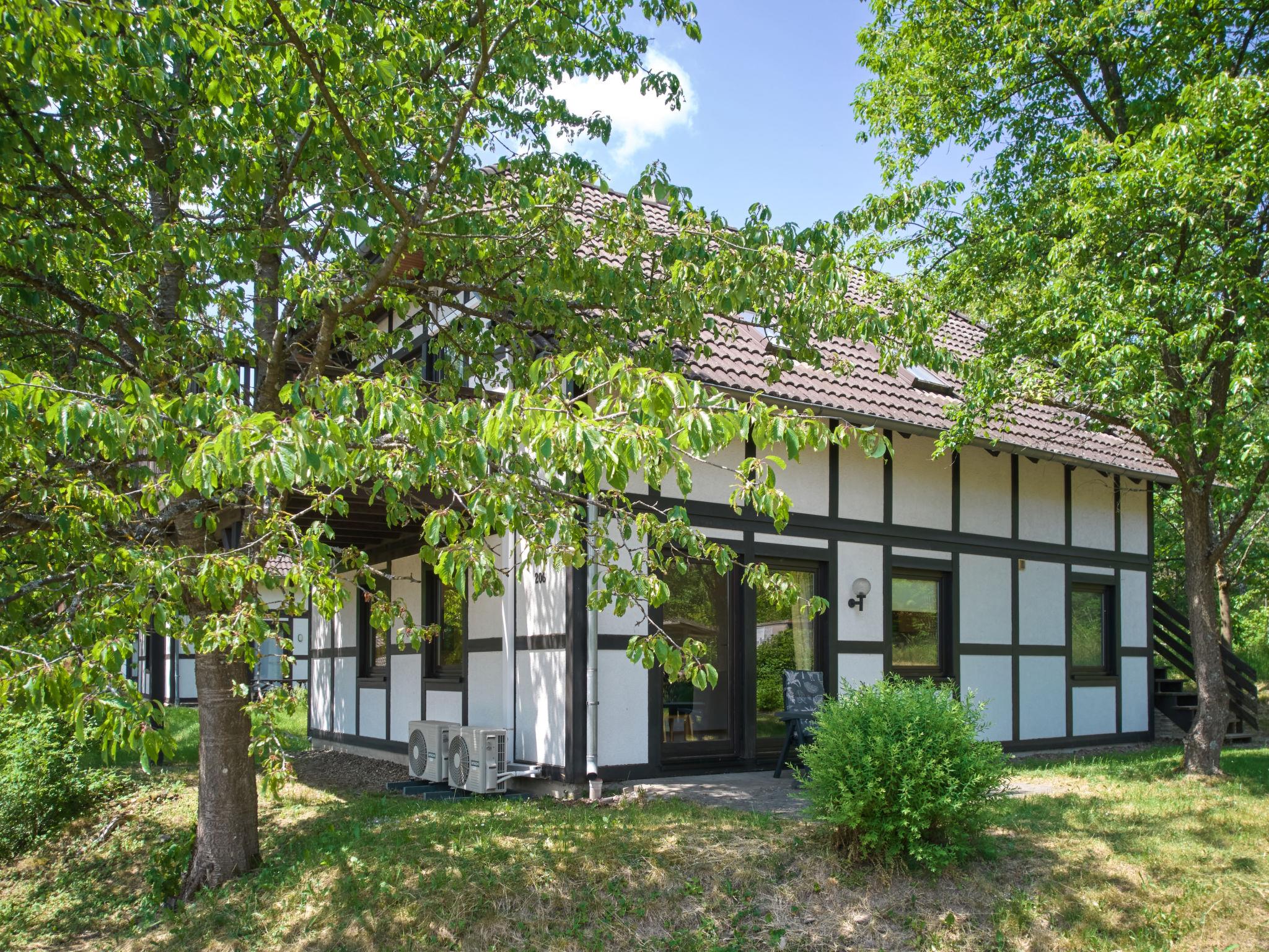 Holiday village "Frankenau", surrounded by trees and meadows. Outside the resort, 2 km from the centre of Frankenau, in the district Nationalpark Kellerwald, on a slope, 28 km from the lake. For shared use: natural state property, pond. In the complex: restaurant with TV, kiosk, sun terrace. Bread roll service. Grocery 8 km, restaurant 2 km, bakery 2 km, bicycle rental 15 km, bus stop 400 m, railway station "Frankenberg" 15 km, outdoor swimming pool 6 km, indoor swimming pool 15 km, thermal baths "Bad Wildungen-Reinhardshausen" 20 km, bathing lake 12 km. Golf course (18 hole) 25 km, tennis, indoor tennis centre 400 m, walking paths from the house 100 m, cycle lane 500 m, gondola lift 27 km, fishing possibilities 700 m. Nearby attractions: KellerwaldUhr 500 m, Schloss Waldeck 27 km. Well-known ski regions can easily be reached: Winterberg 45 km, Willingen 50 km. Well-known lakes can easily be reached: Edersee - Herzhausen 13 km. Hiking paths: Nationalpark Kellerwald 500 m. Please note: suitable for families. Neighbourhood highly sensitive to noise. Quietness and good behaviour expected. Some of the holiday homes can be reached via steps. At the park entrance there is a bistro/café with a sun terrace, Sunday breakfast buffet, children's cinema, table football (limited opening times outside of the season). There is also the option of using a washing machine and dryer for a fee.