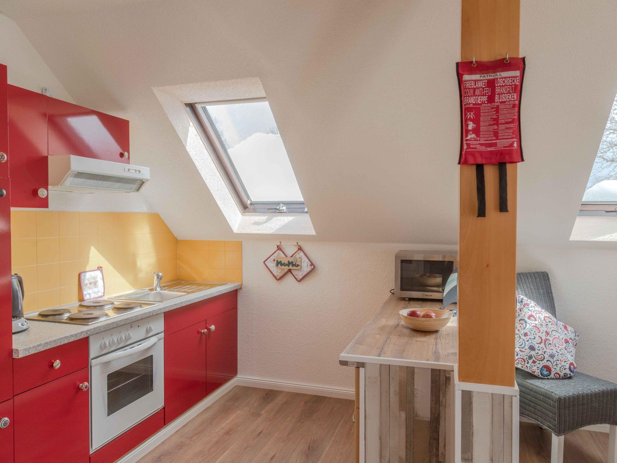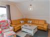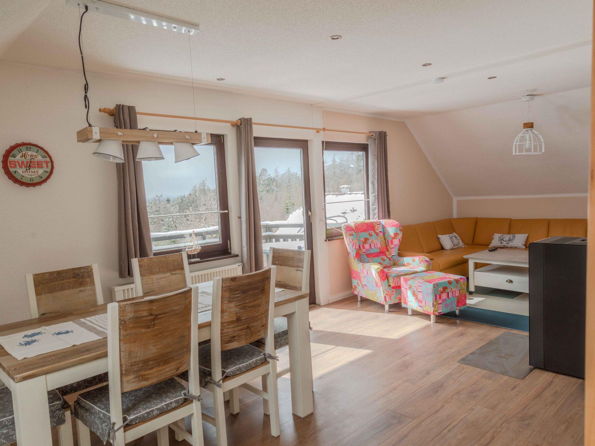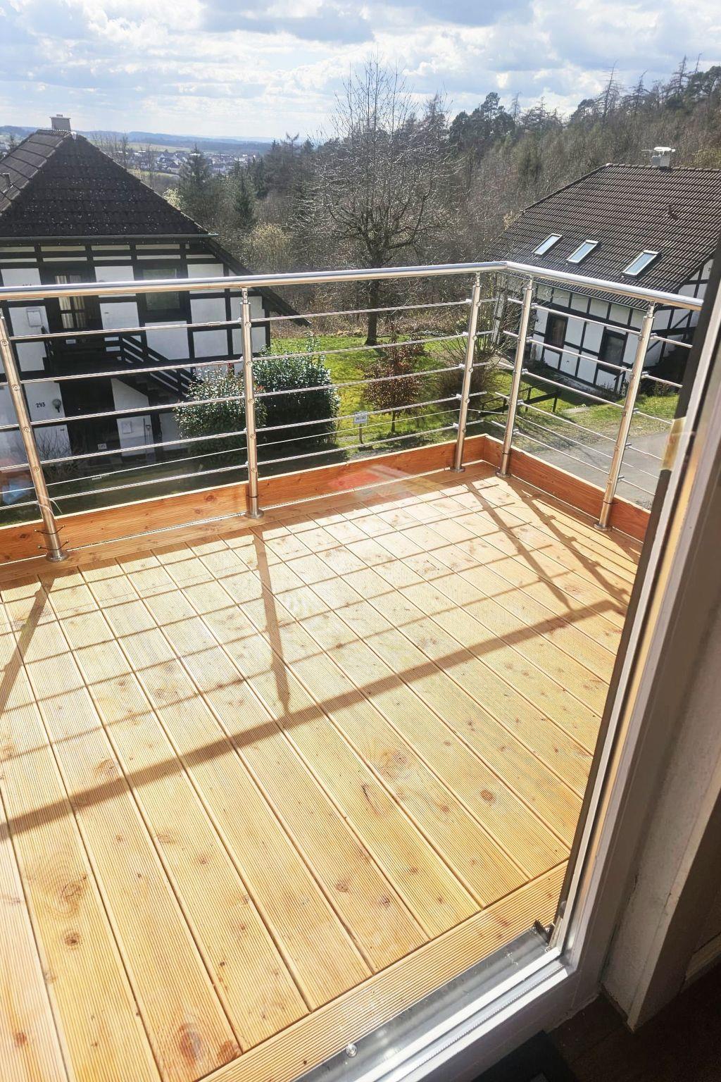 Inside, the 85 m² holiday flat, located on the first floor of a characterful half-timbered house, offers all the amenities for a comfortable stay. You enter the flat via a separate entrance, which is accessed via an external staircase. The flat has a cosy bedroom with a double bed (180 x 200 cm), a large wardrobe and another bedroom with two single beds. A modern daylight bathroom and a fully equipped open-plan kitchen with adjoining dining and living area, including a large panoramic balcony, round off the offer. A large leather living area with sleeping function, a TV, internet radio and a new pellet stove ensure cosy evenings.