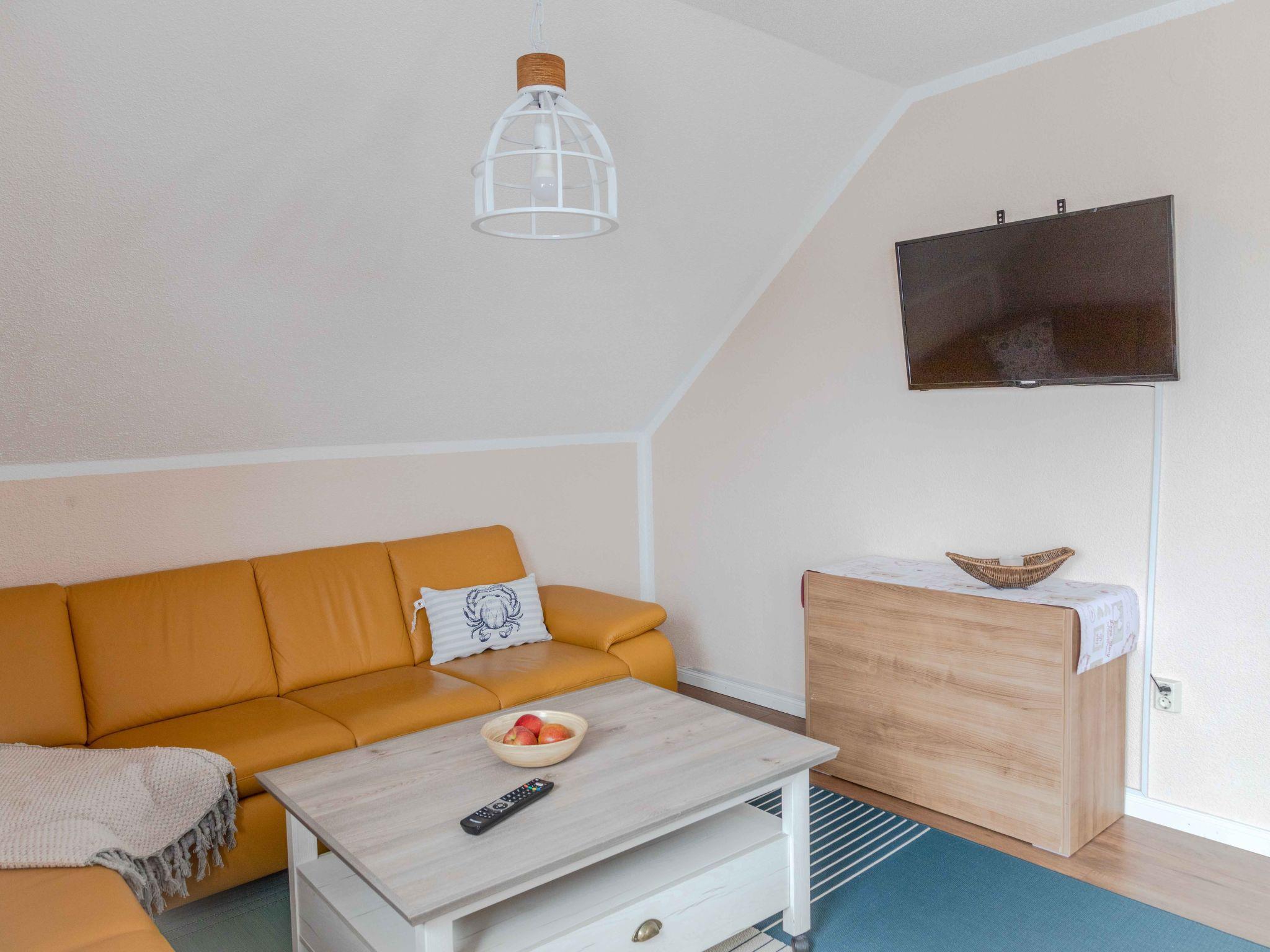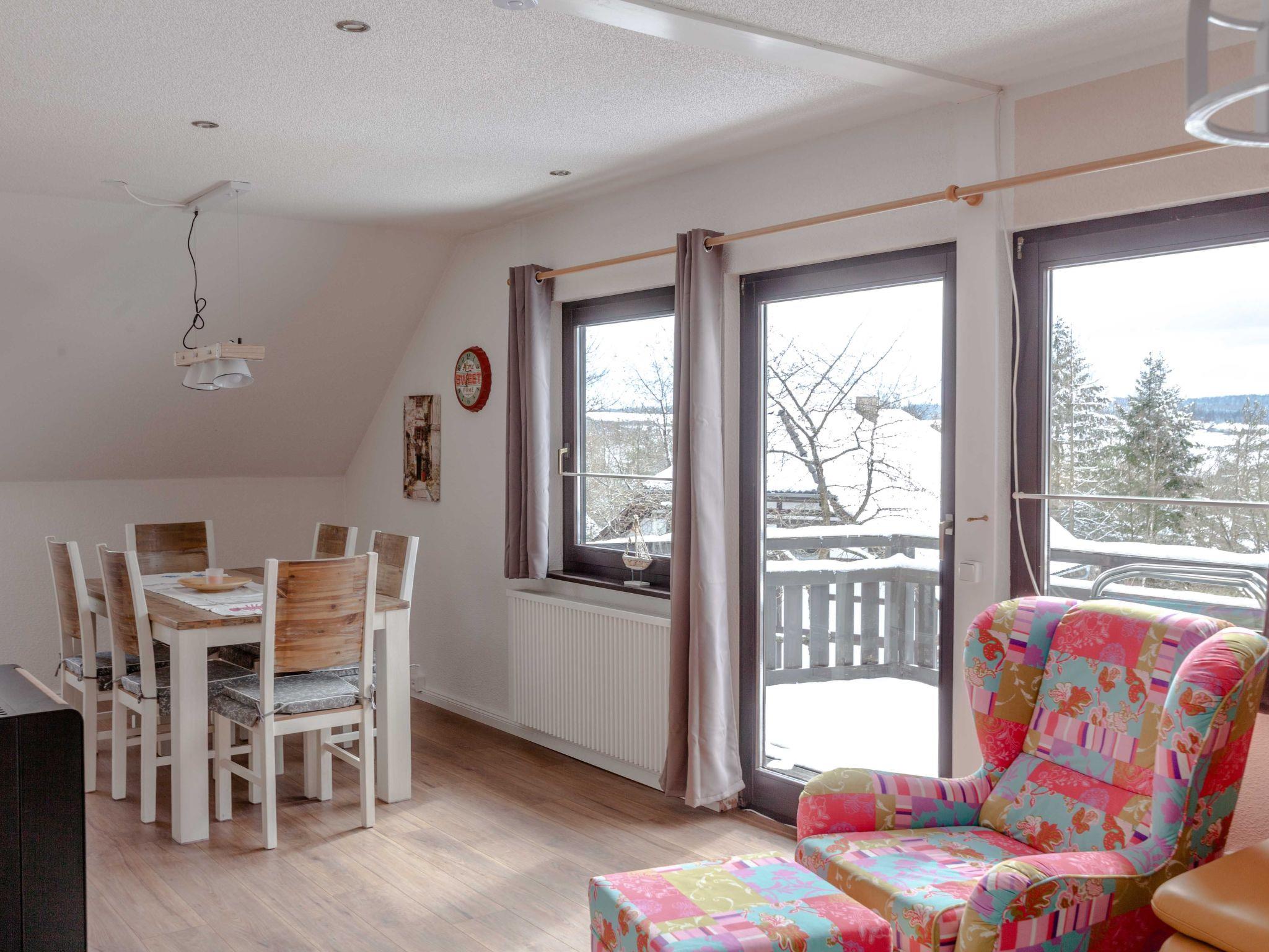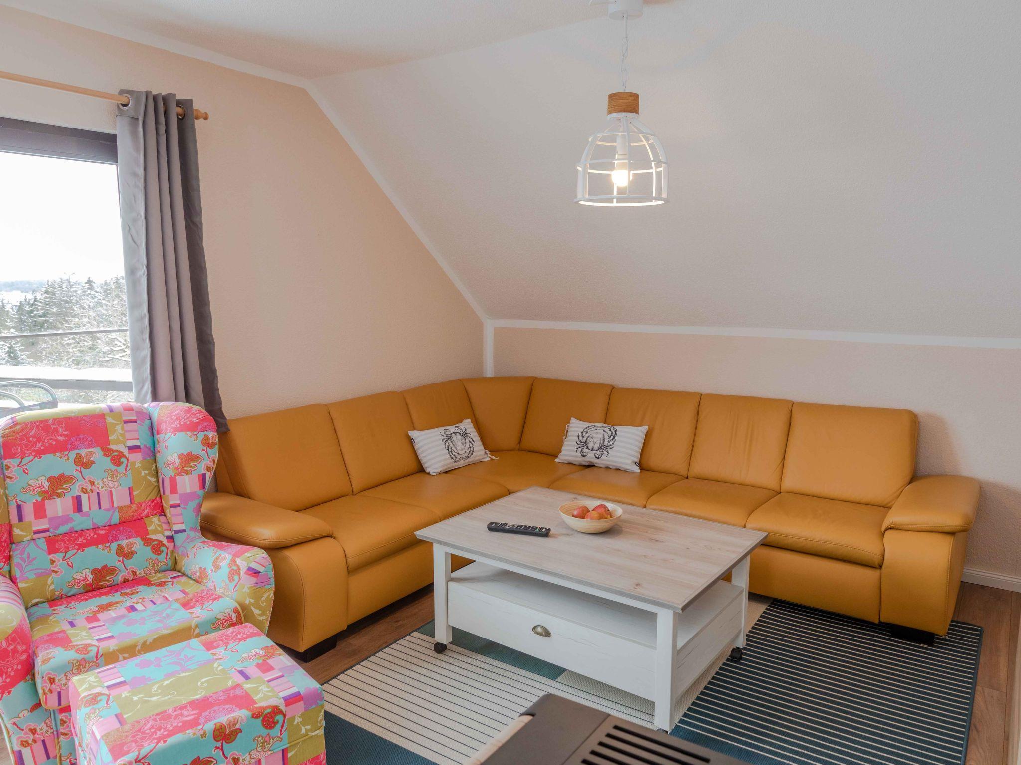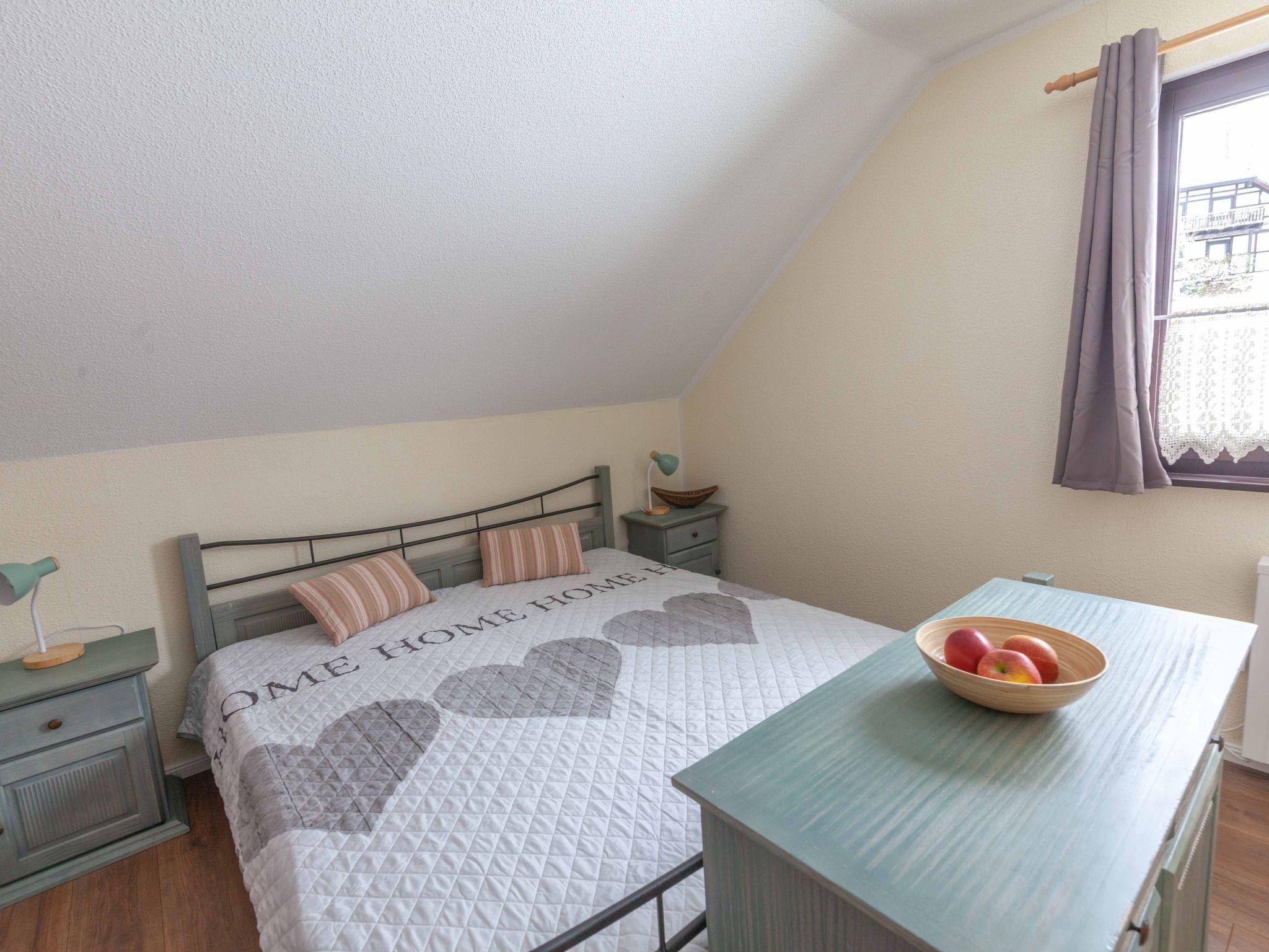 Inside, the 85 m² holiday flat, located on the first floor of a characterful half-timbered house, offers all the amenities for a comfortable stay. You enter the flat via a separate entrance, which is accessed via an external staircase. The flat has a cosy bedroom with a double bed (180 x 200 cm), a large wardrobe and another bedroom with two single beds. A modern daylight bathroom and a fully equipped open-plan kitchen with adjoining dining and living area, including a large panoramic balcony, round off the offer. A large leather living area with sleeping function, a TV, internet radio and a new pellet stove ensure cosy evenings.