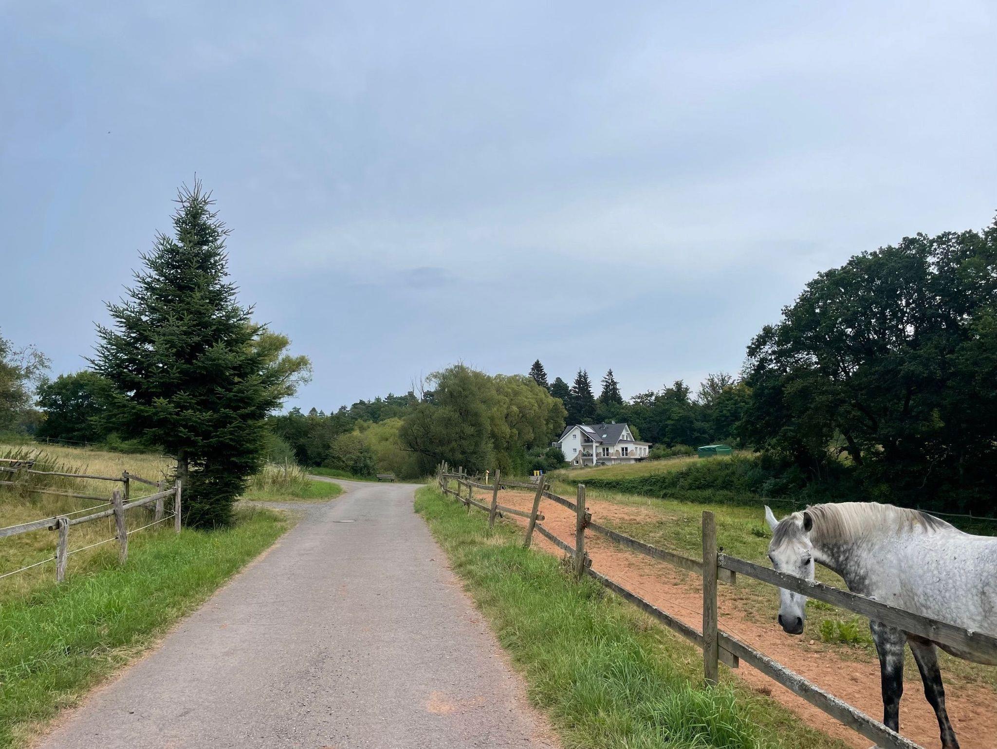 Man hat einen schönen Ausblick über Wiesen bis hin zum Waldrand.