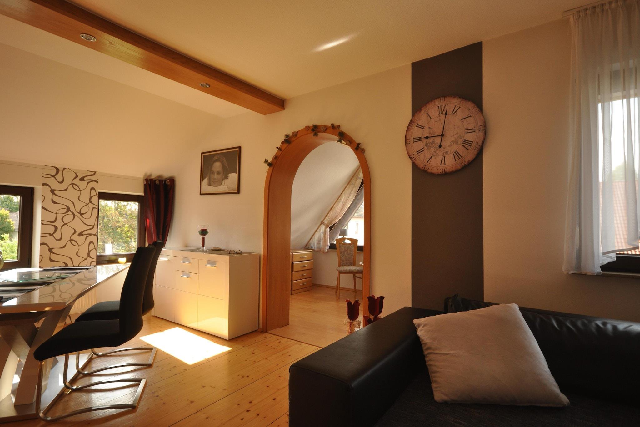 Denne hyggelige ferielejlighed i Frankenberg (Eder) er idyllisk beliggende i den naturskønne Ederbergland-region, perfekt til naturelskere og cykelentusiaster. Lejligheden ligger på første sal i et velholdt hjem og tilbyder moderne bekvemmeligheder og en varm, personlig velkomst fra udlejeren, der bor i stueetagen og gerne hjælper under dit ophold. Nyd at lave mad i det fuldt udstyrede køkken og spisestue med en fantastisk udsigt. Den lyse opholdsstue inviterer dig til at slappe af efter en dag med udforskning. I haven tilbyder et dejligt opholdsområde det perfekte sted at slappe af i den friske luft. Tildelt ADFC-kvalitetsmærket er lejligheden specielt velegnet til cyklister med en sikker garage til opbevaring og opladning af cykler. Udlejeren kan endda ledsage dig på en guidet cykeltur, hvis tiden tillader det. Nærliggende attraktioner omfatter den historiske Liebfrauenkirche, charmerende bindingsværkshuse, Ederberglandbad, dyrepark og vandrestier. Dagsture til Korbach, Bad Wildungen, Kassel eller Winterberg tilføjer kulturel og rekreativ variation til dit ophold.