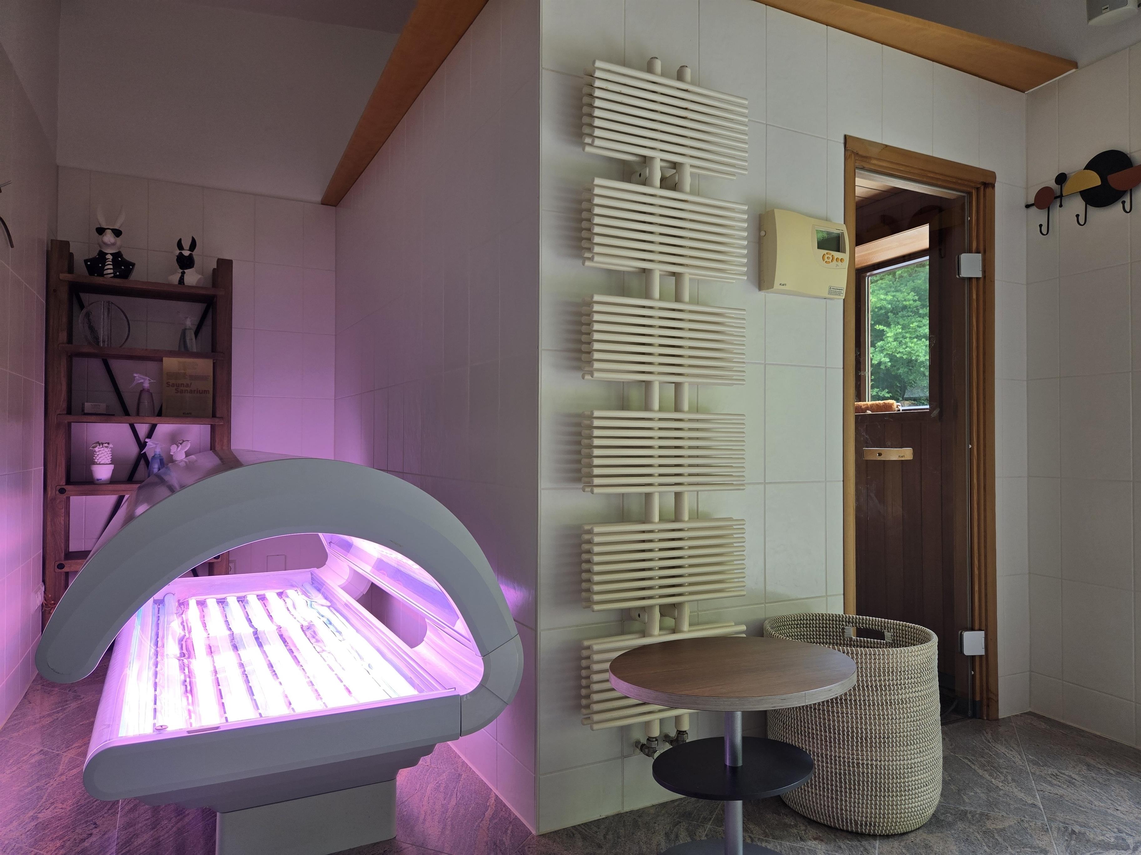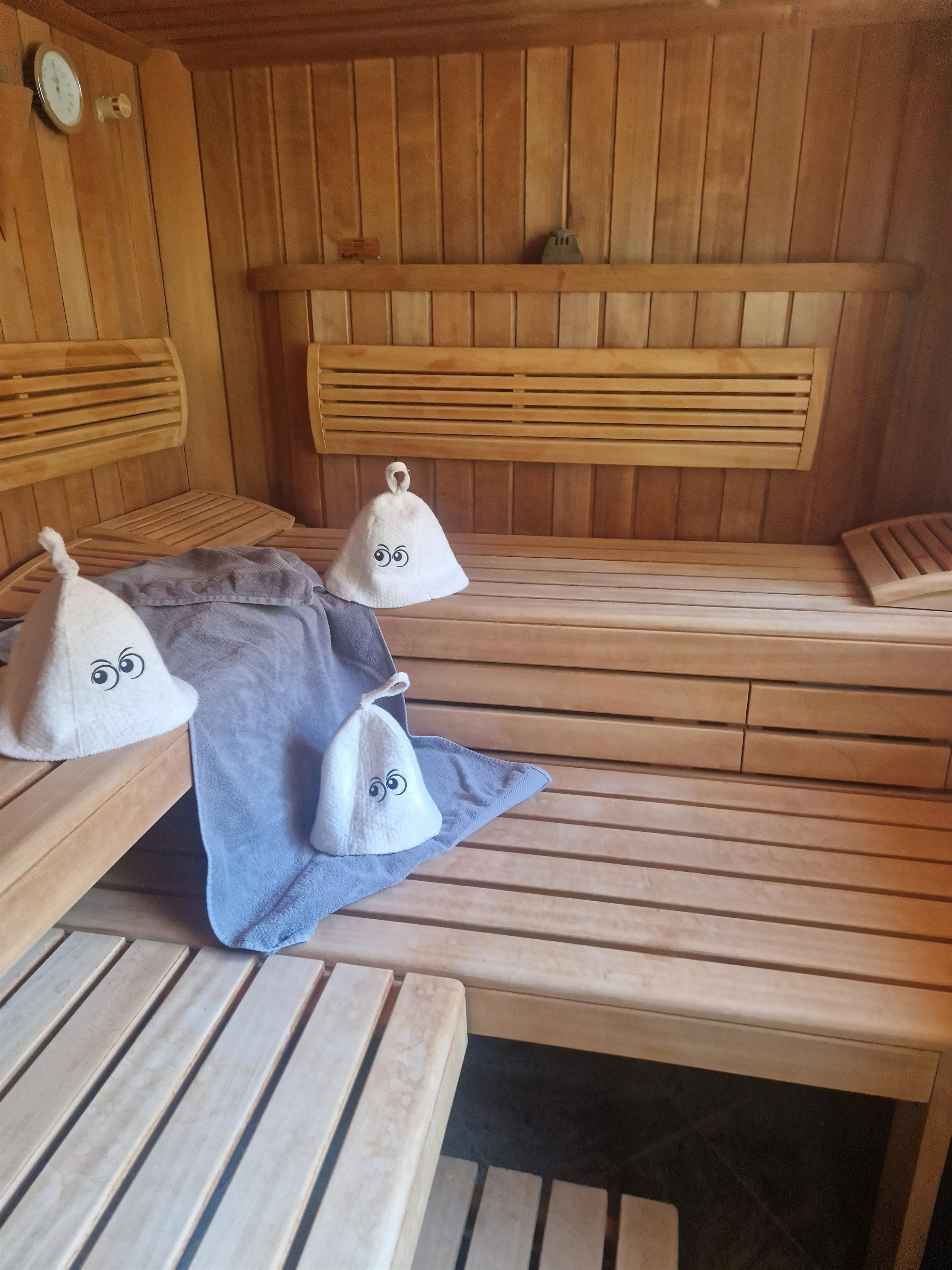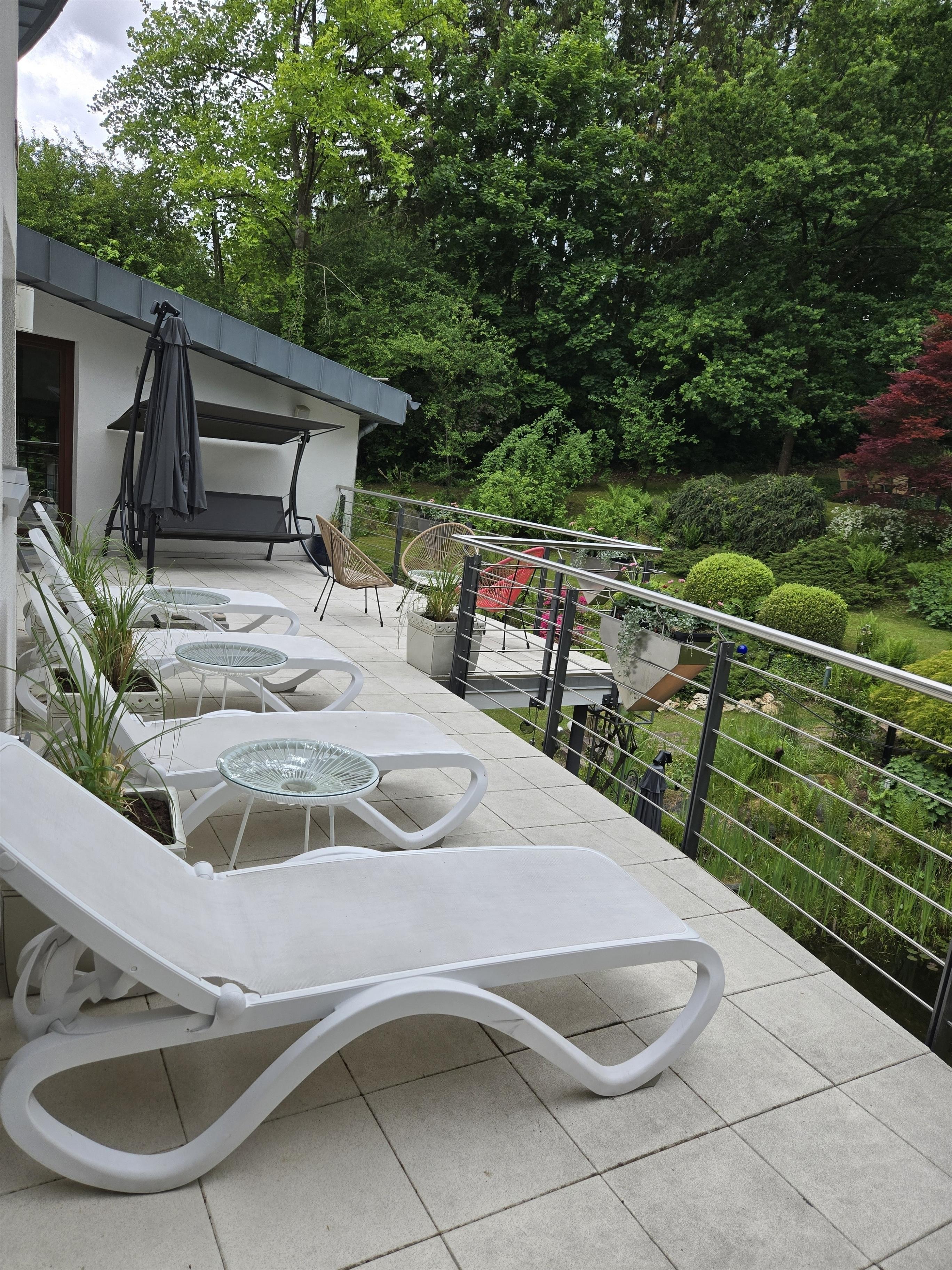 Erholung pur: Villa Ralf mit großem Garten und Teich, große überdachte Terrasse, 5 Schlafzimmer , 3 Bäder, Sauna, Solarium, Fitnessraum, Galerie mit Bücherregal und viel mehr. Die Villa Ralf befindet sich auf einem 8000 m² großen, schön angelegten Garten mit verschiedenen Ebenen und einem Teich mit Goldfischen sowie 3 Parkplätzen im Hof. Das Ferienhaus verfügt über 5 Schlafzimmer, 3 Bäder, eine Küche, einen Wohnbereich mit Holzkamin und ein Esszimmer sowie eine große überdachte Terrasse. Im 2. Stock befindet sich ein Wellnessbereich mit Sauna für 4 Personen, einem Solarium und einem Fitnessraum. Im 1. Stock gibt es eine Galerie mit Bibliothek.