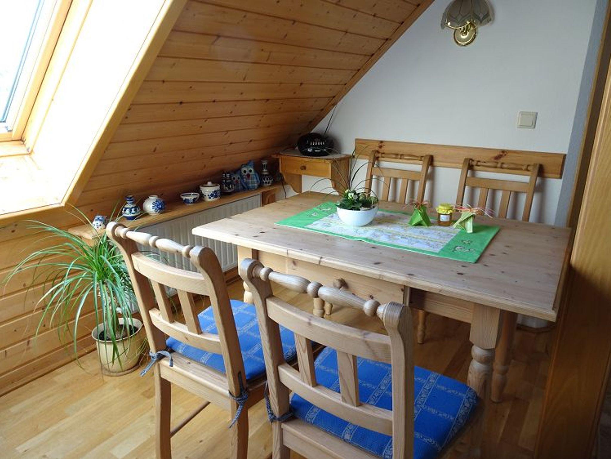 Die 75qm große Ferienwohnung befindet sich in der 2. Etage und bietet Platz für bis zu 4 Personen. Die helle Ferienwohnung verfügt über einen kombinierten Wohn- und Essbereich mit Küchenzeile, zwei Schlafzimmer sowie ein Badezimmer. Der Wohnbereich verfügt Sofa und TV, der Essbereich über einen Esstisch mit Stühlen. Die Küchenzeile ist mit Backofen, Kühlschrank, Geschirrspüler, Mikrowelle, Kaffeemaschine und Toaster voll ausgestattet. Ein Schlafzimmer verfügt über ein Doppelbett. Ein Schlafzimmer ist mit zwei Einzelbetten ausgestattet und kann als Leseraum und Spielzimmer für Kinder genutzt werden. Einige Bücher und Spiele sind vorhanden. Bettwäsche und Handtücher sind kostenfrei vorhanden. Das Badezimmer ist mit Dusche, Badewanne, Wachbecken, WC, Fön und Kosmetikspiegel ausgestattet. Das WLAN können Sie während Ihres Aufenthaltes kostenfrei nutzen. Auch ein eigener Parkplatz steht Ihnen kostenfrei zur Verfügung. Sie haben Zugang zum Garten mit Liegeweise, Gartenmöbeln und Grillmöglichkeit.