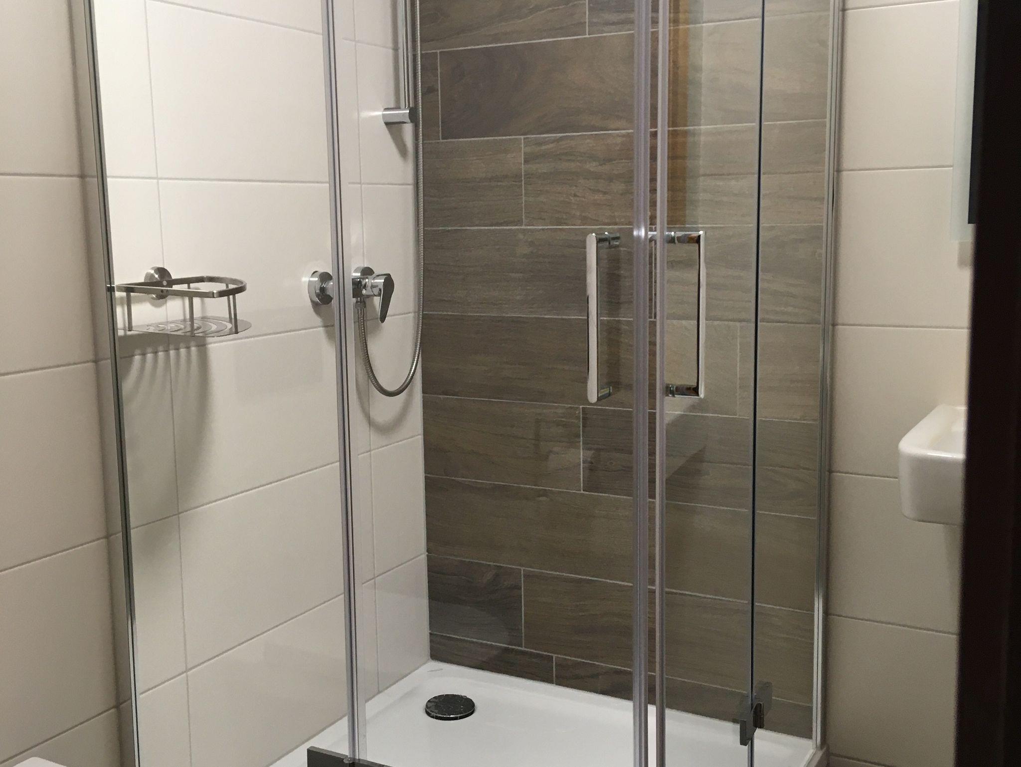 Das Bad mit großer Dusche, Waschtisch mit berührungsloser Armatur, Wand-WC, beleuchtetem Spiegel.