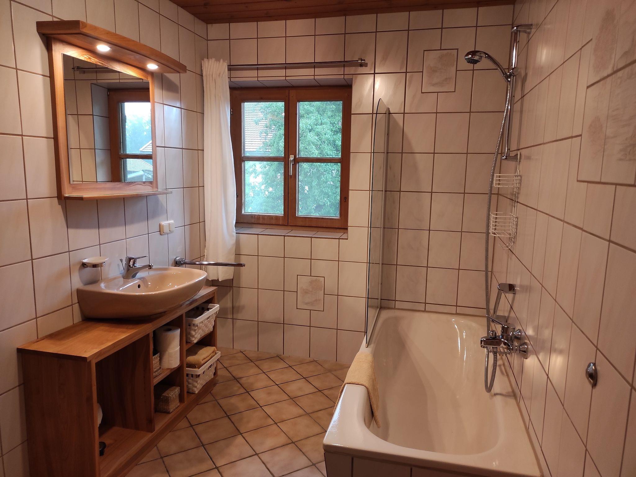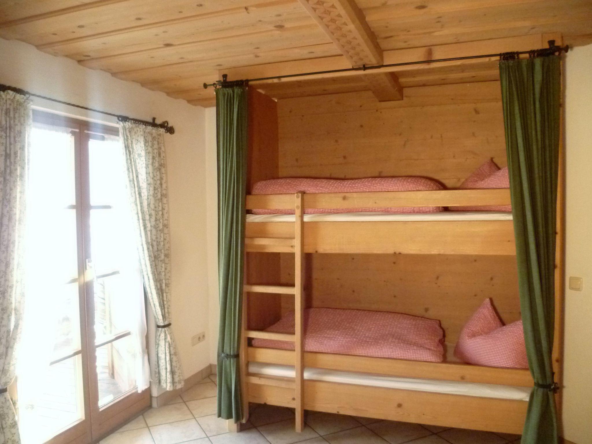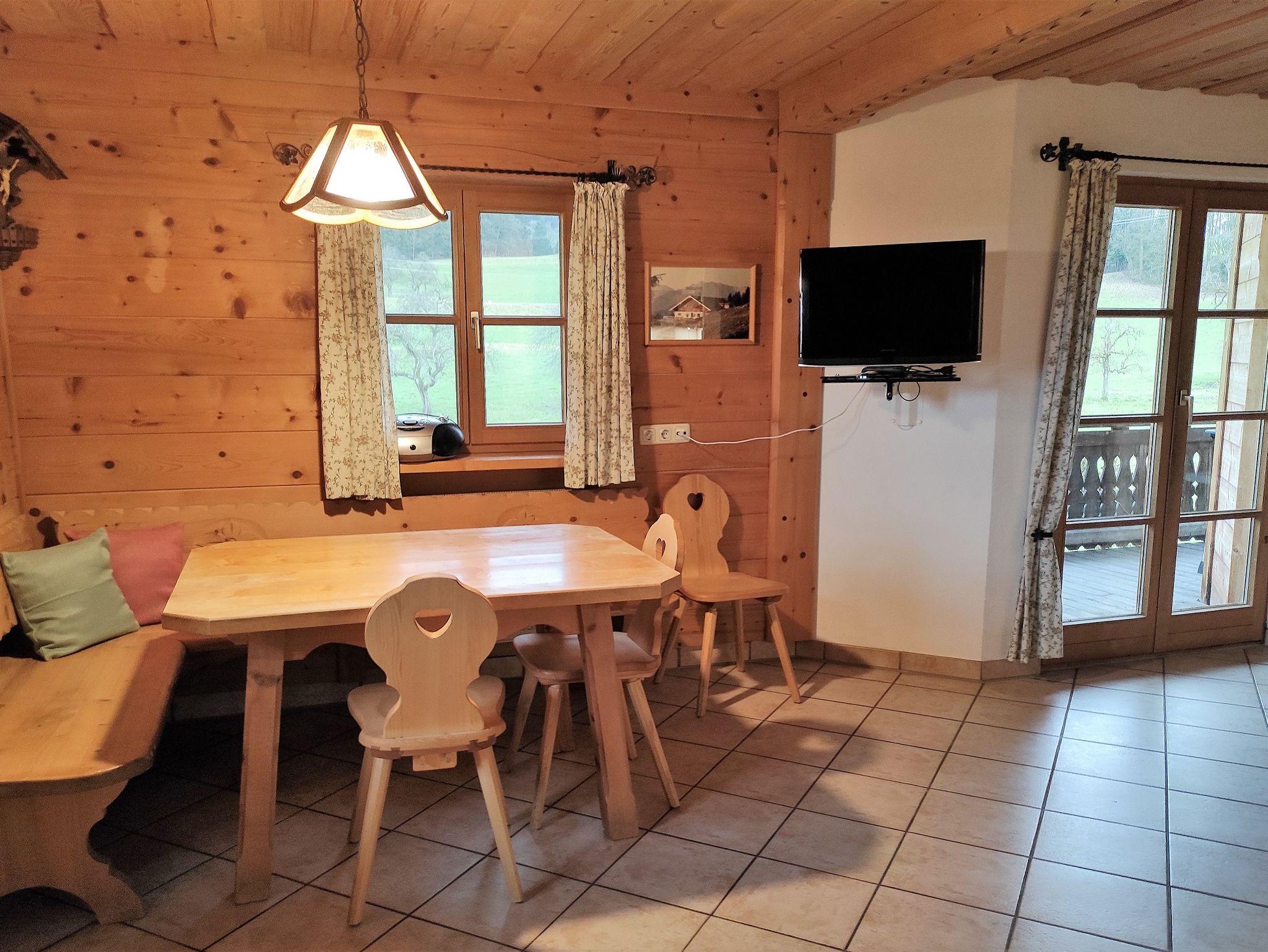 Gemütliche Ferienwohnung im bayerischen Stiel eingerichtet mit Kachelofen, eigener Eingang, großer Wohn-Schlafraum mit Etagenbetten, Schlafchouch ausziehbar, 1 separates Schlafzimmer, Bad DU/WC und großer Südbalkon.