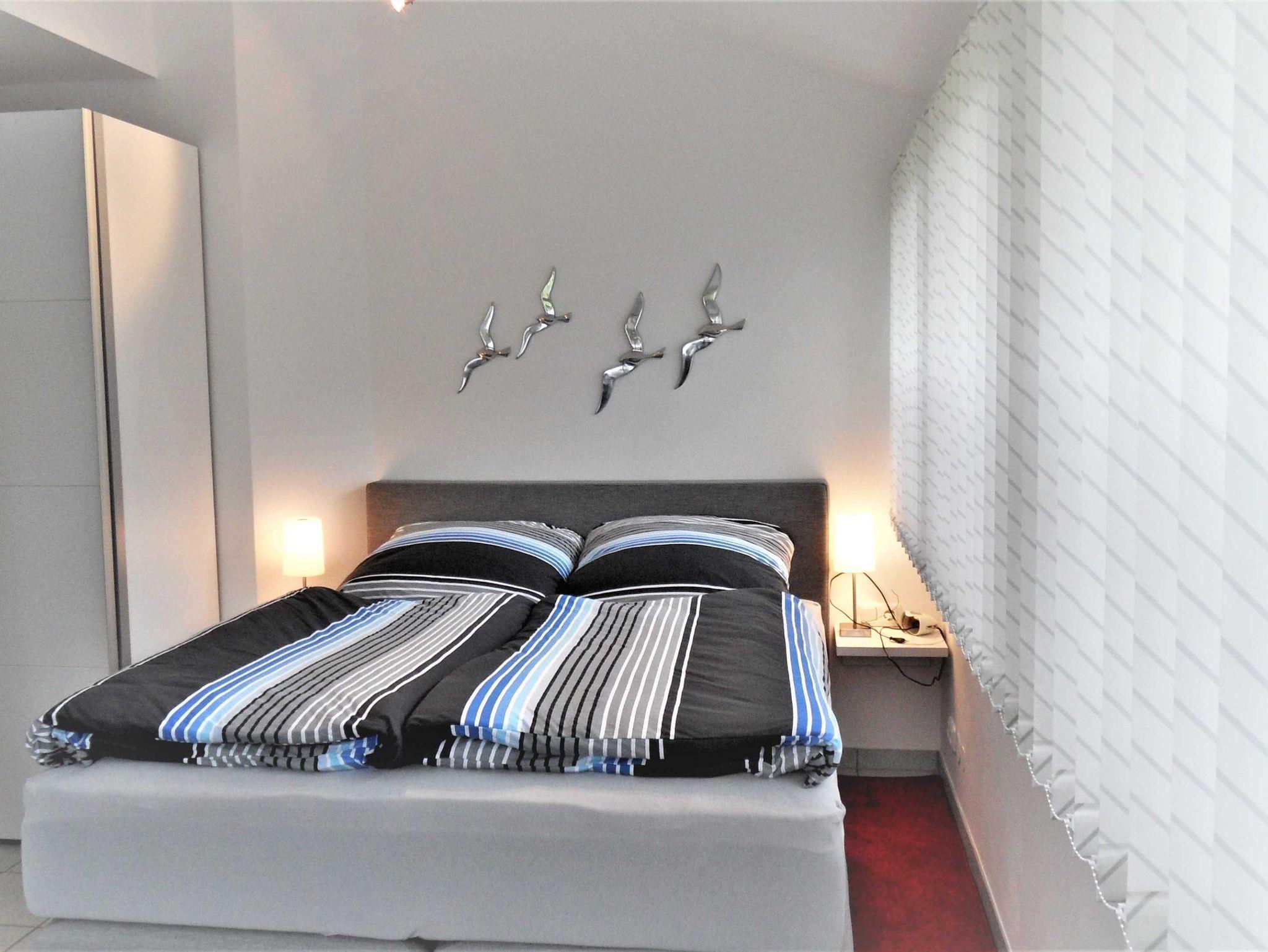 ebenerdige,komfortable, moderne Ferienwohnung mit Küchenzeile, Bad, kombiniertem Wohn/Schlafbereich ( Boxspringbett) und überdachter Terrasse; eigener PKW-Stellplatz vor separatem Ferienwohnungseingang; abschließbare Fahrradgarage mit E-Bike Ladestation; E-Tankstelle ( Wallbox); kostenlos bereitgestellte Bettwäsche und Handtücher