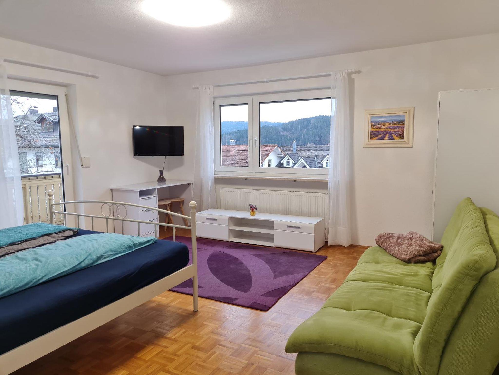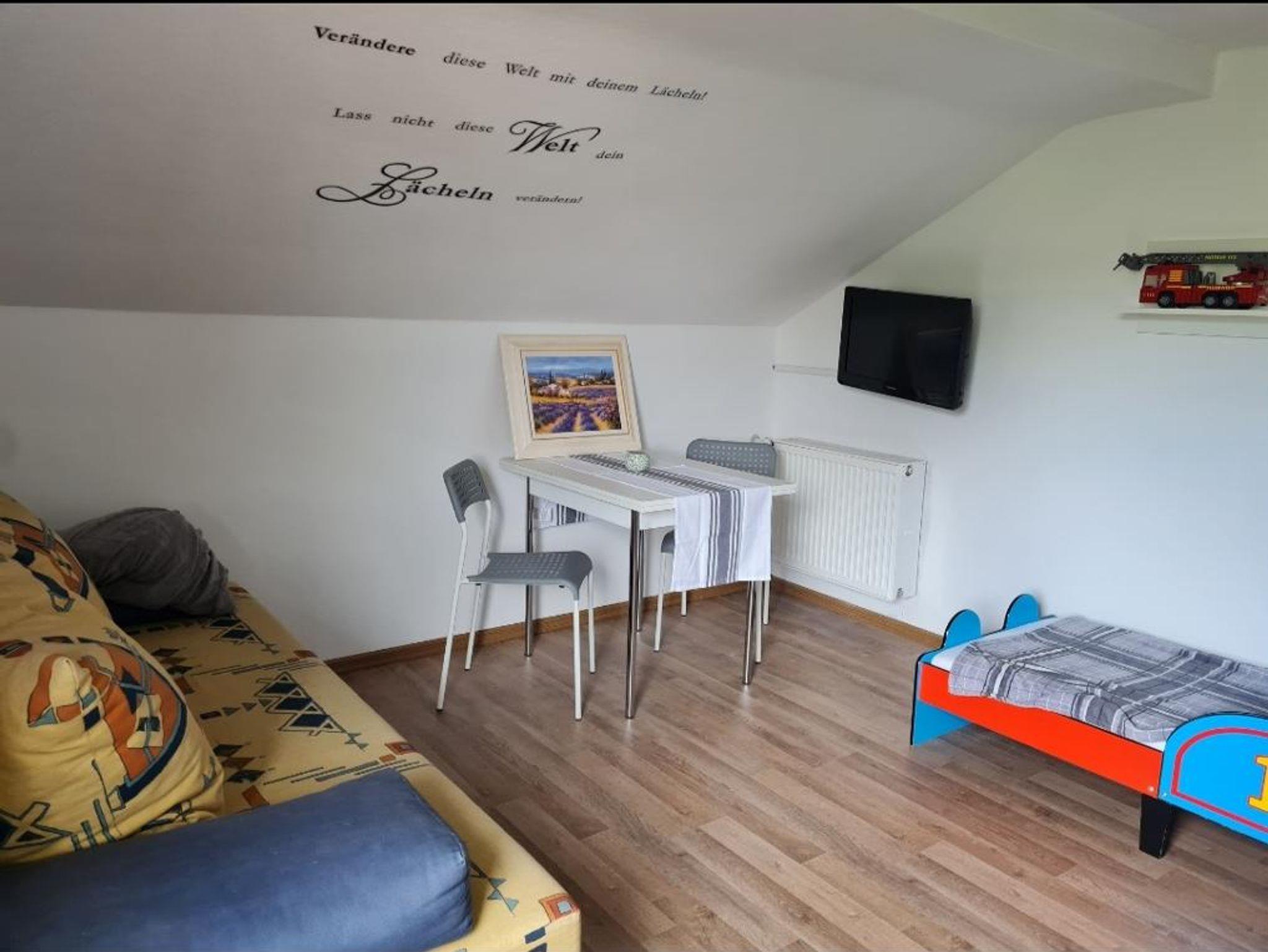 In der Wohnung im 1. OG erwartet sie ein Wohn/Schlafraum mit einem Doppelbett (1,80x2,00), eine Ausziehcouch (1,40x1,90), ein Schreibtisch, TV und Kleiderschrank. Vom Balkon aus haben sie einen wunderschönen Blick in den eigenen Garten und den Nachbargarten mit Obstbäumen. Die komplett ausgestattete Küche mit Geschirrspüler, Kühlschrank, Herd, Backofen, Eierkocher, Toaster, Kaffeemaschine mit Kaffee lässt keine Wünsche offen. In der gemütlichen Essecke in der Küche können Sie entspannt mit Blick ins Tal ihr Frühstück oder ihr zubereitetes Mahl zu sich nehmen. Im Kinderzimmer finden sie ein Stockbett (0,90x2,00), ein Autobett (0,90x2,00), viele verschiedene Spiele, Spielsachen, Kinderbücher und ein Kinderkicker. Im Badezimmer finden sie eine Badewanne, ein Waschbecken und ein WC mit Duschgel, Haarshampoo, Föhn, Handcreme, Bodylotion und genügend frische Handtücher für alle Gäste.