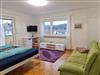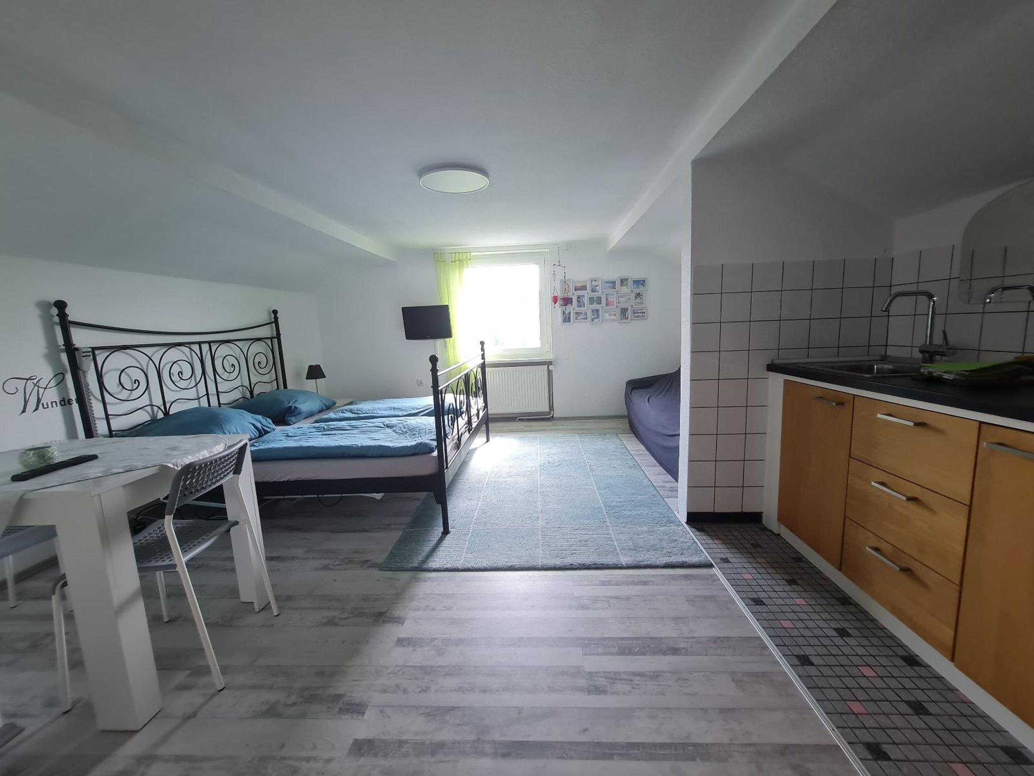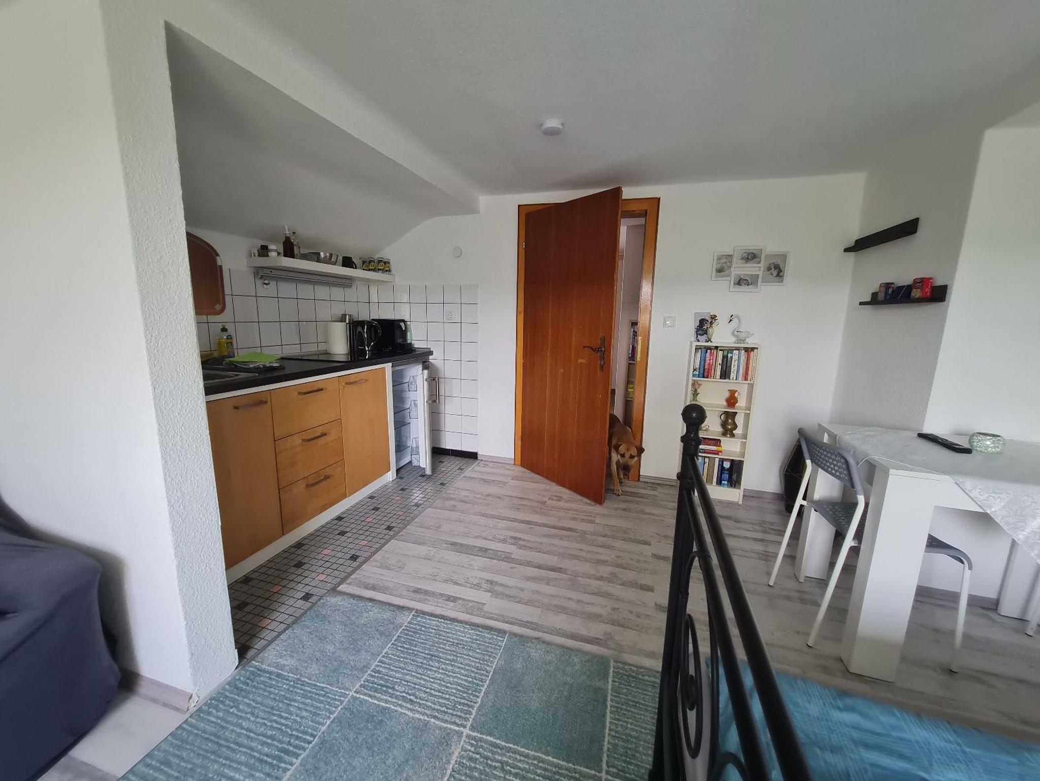 In der Wohnung im DG erwartet sie ein grosser Wohn/Schlafraum mit einem Doppelbett (1,80x2,00), eine Coch zum ausklappen (1,40x2,00), ein Esstisch für 2 Personen, eine Küchenzeile mit Herd und Geschirr, Kaffeemaschine mit Kaffee, Wasserkocher, verschiedene Teesorten, Kühlschrank,TV. Im kleinen Zimmer neben dem Eingang finden sie eine ausziehbare Couch (1,60x2,00), ein Kinderbett (0,70x1,40), Tisch und Stühle für 2 Personen und einen TV zum entspannten Tag oder Tagesausklang. Ein separates WC mit Waschbecken befindet sich ebenfalls in der Wohnung. Im Gang der Wohnung finden sie auch Kinderbücher und Spiele.