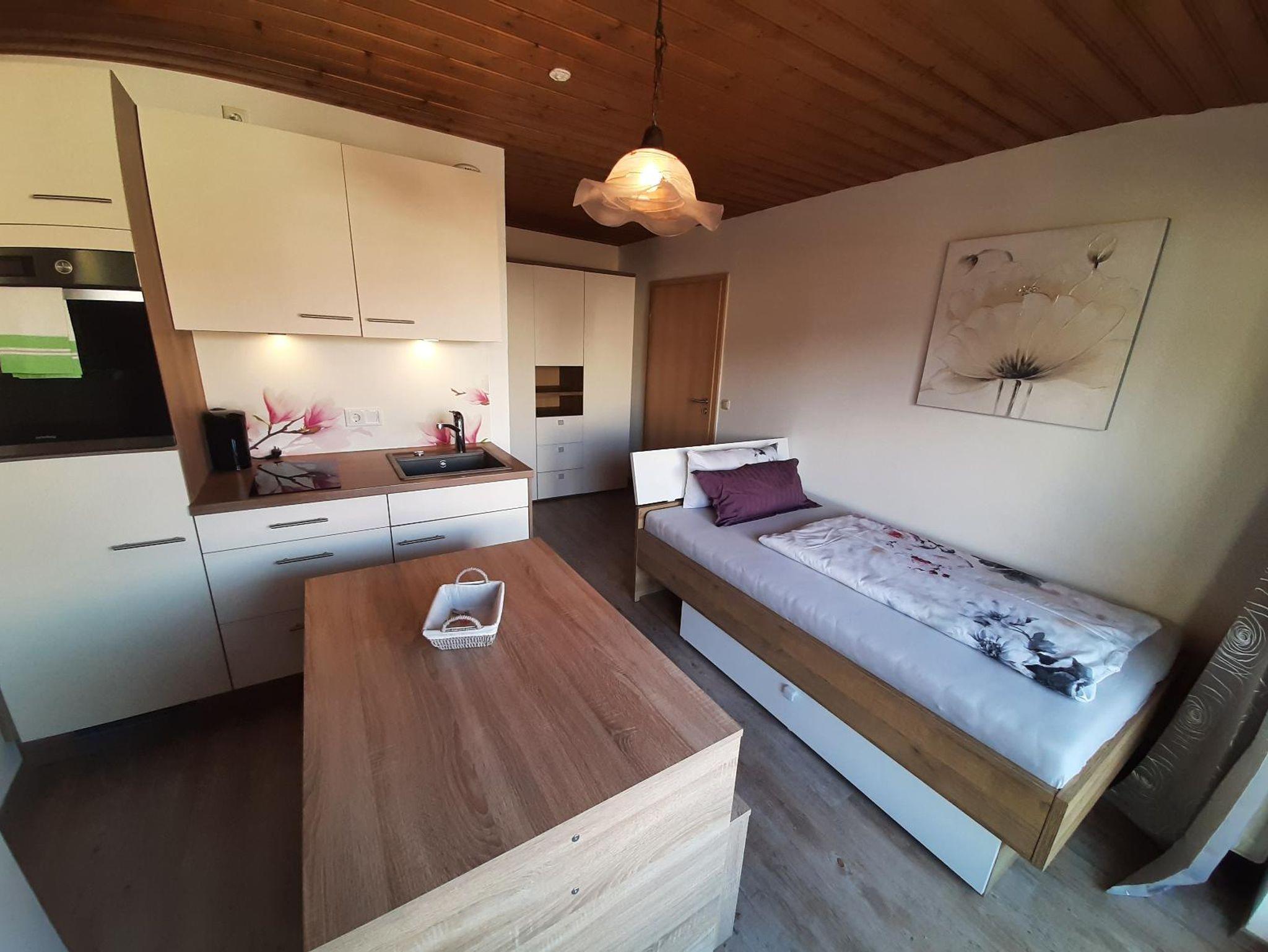 1 Zimmer Appartement OG mit sonnigen West-Balkon mit Blick zum großen Arber sowie mit barrierefreier Duche/WC.