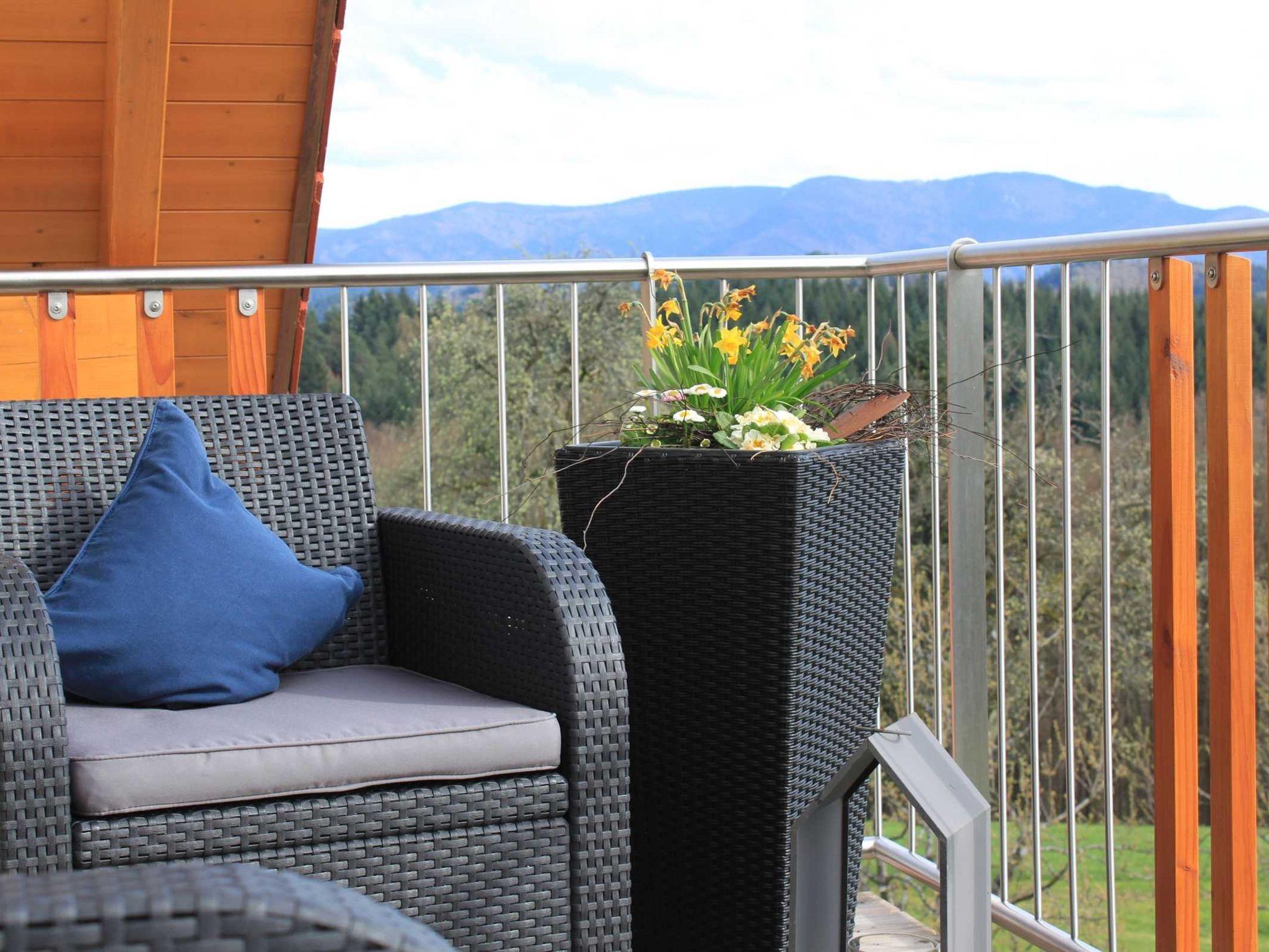 Von dem gemütlich eingerichteten Balkon können sie die wunderbare Aussicht in den Schwarzwald und die Vogesen genießen.