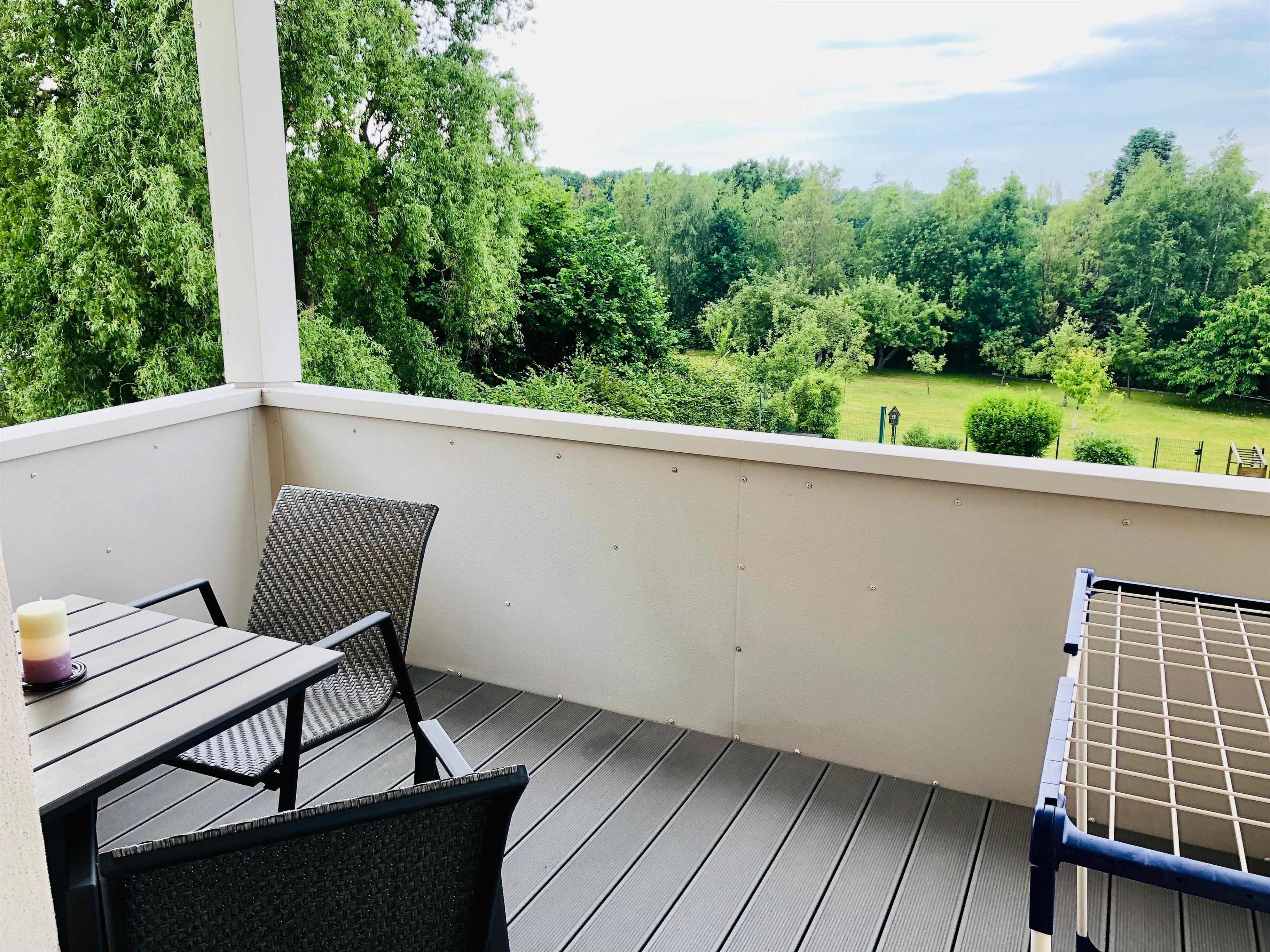 Für den großzügigen Balkon zur Gartenseite sind Tisch und Stühle vorhanden.
