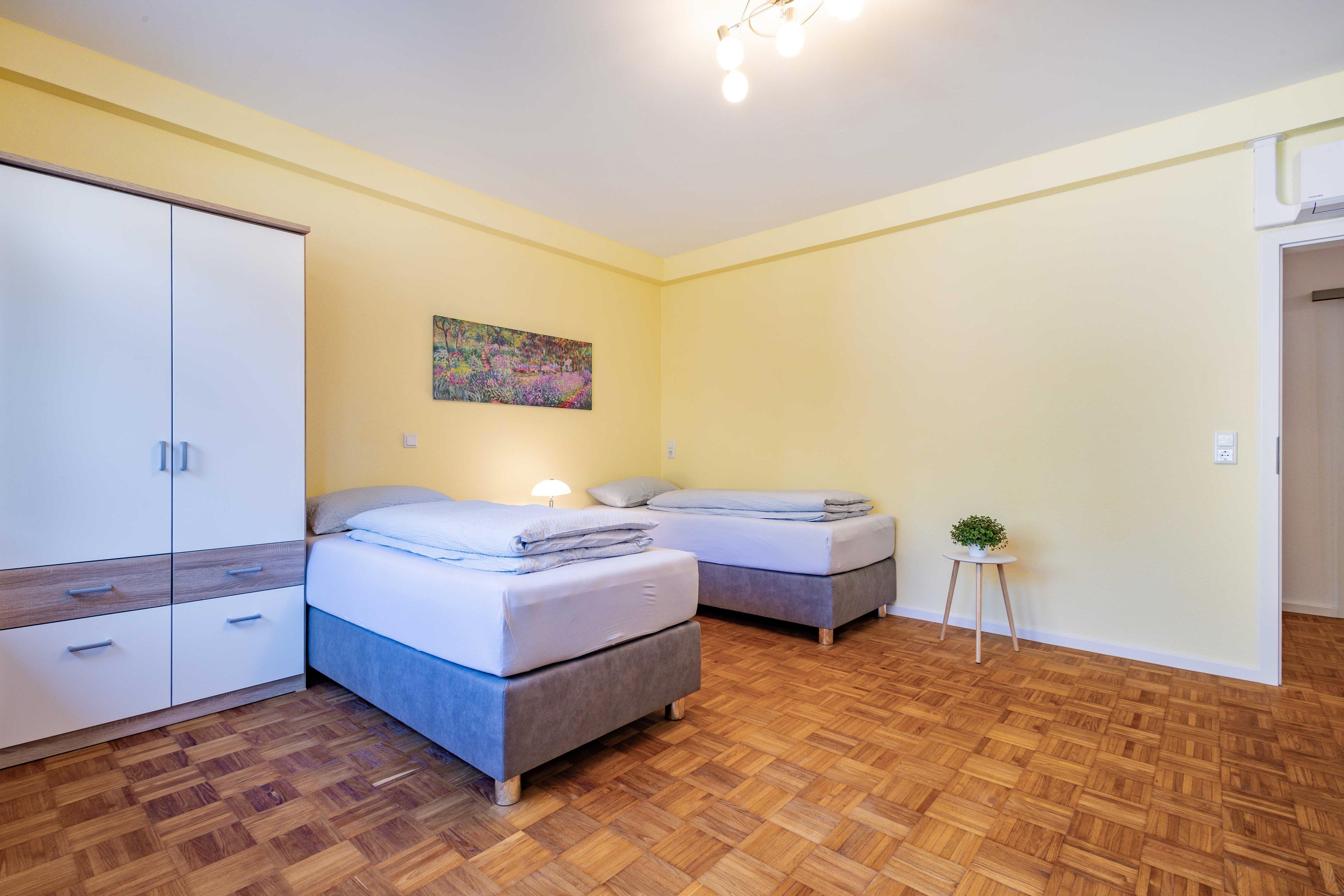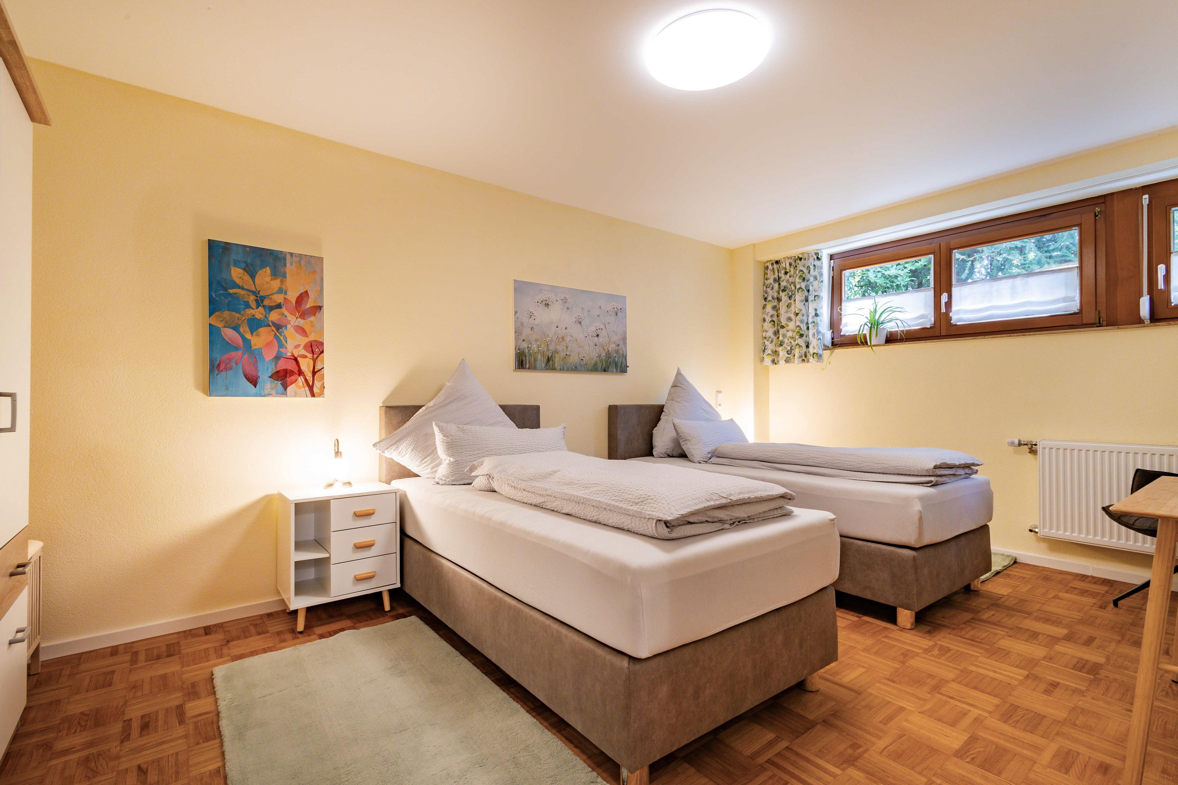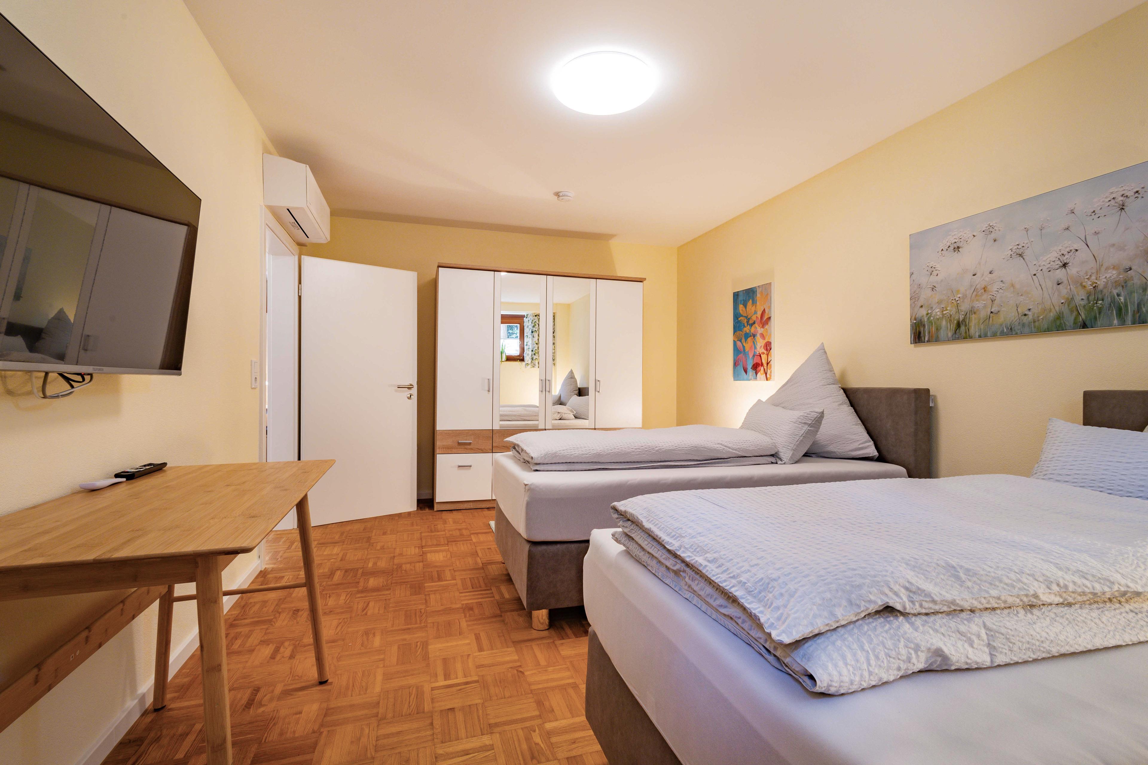 Das Schlafzimmer und das Wohnschlafzimmer verfügen jeweils über 2 komfortable Boxspringbetten, die einzeln oder zusammen gestellt werden können, mit je einem Schreibtisch, TV und LAN-Anschluss.