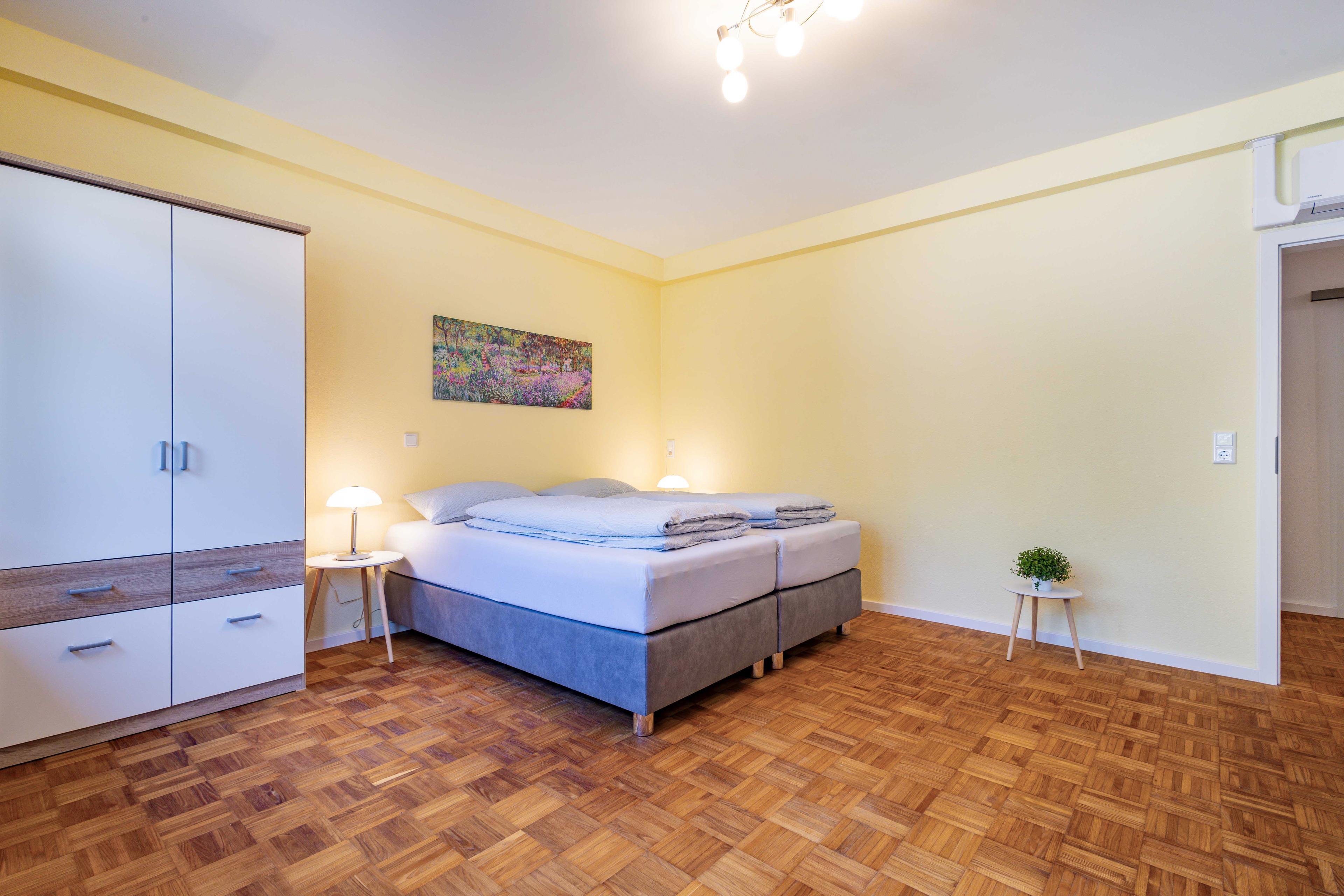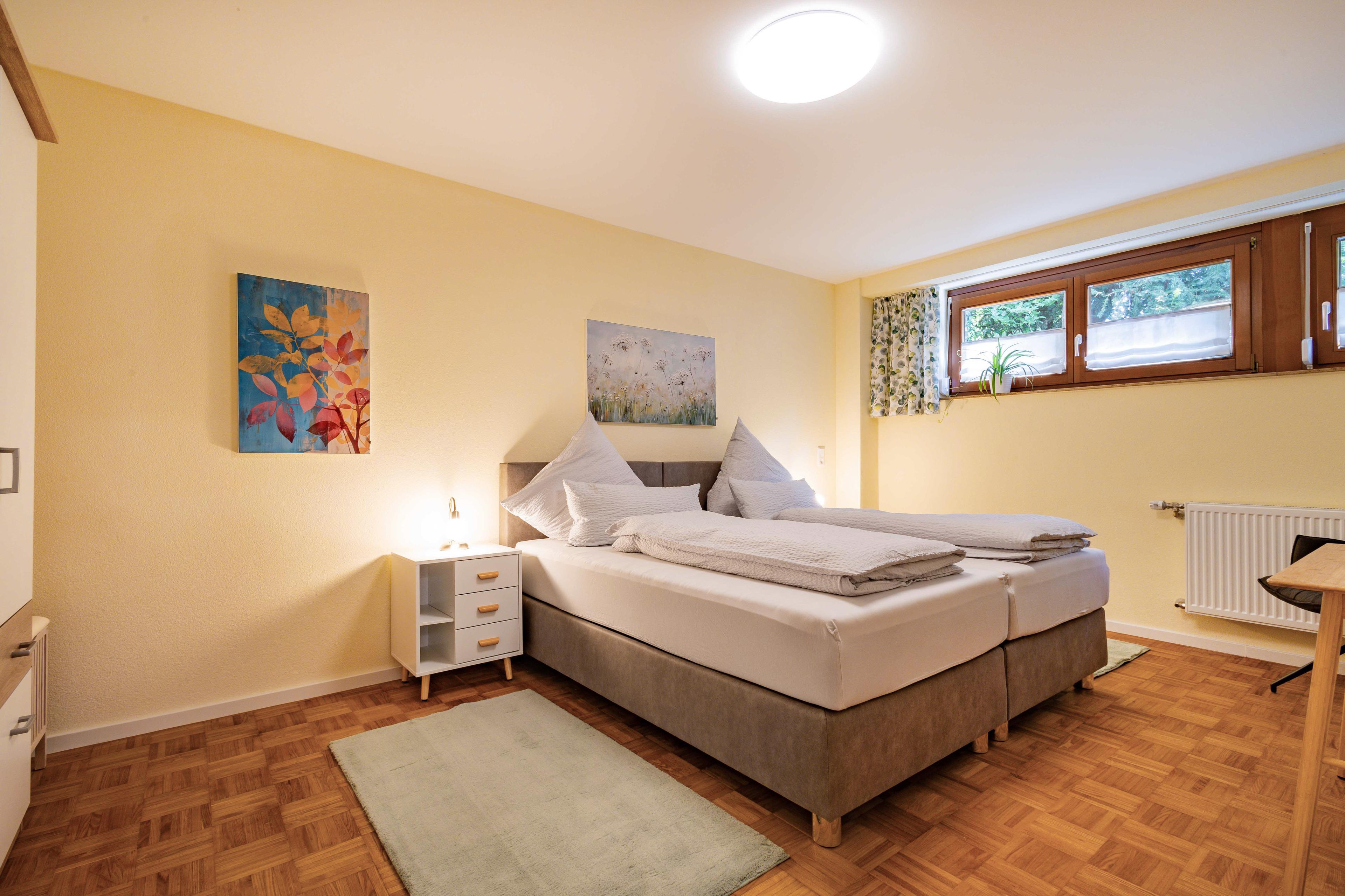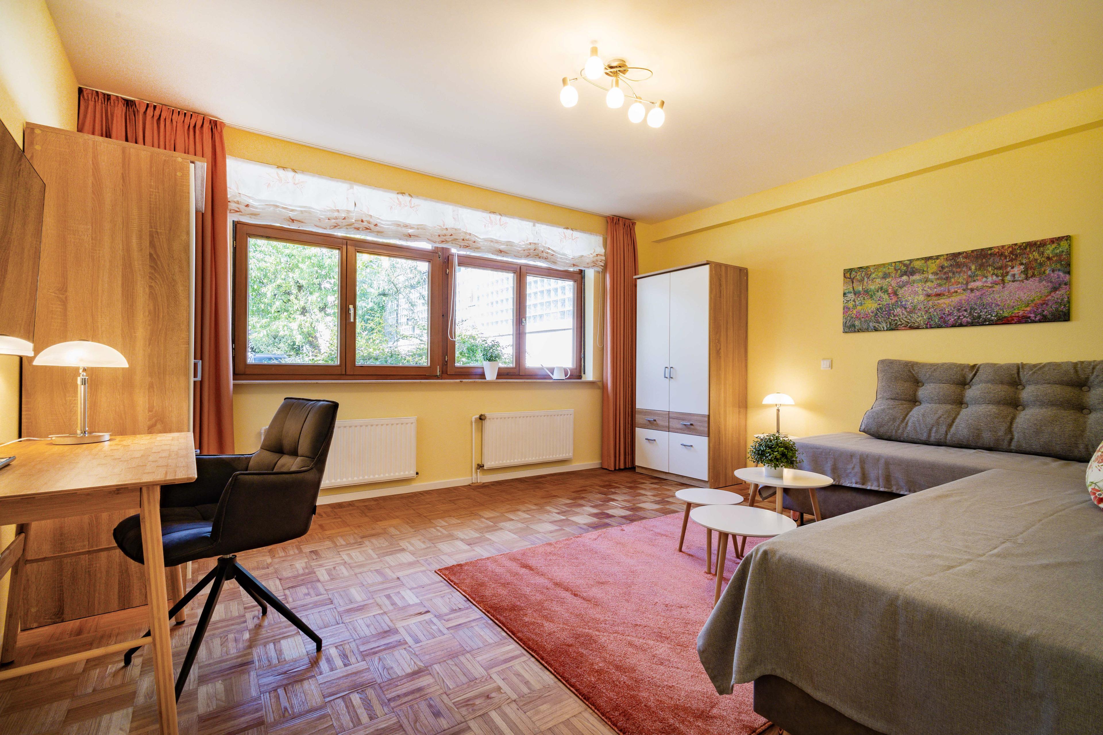 Das Schlafzimmer und das Wohnschlafzimmer verfügen jeweils über 2 komfortable Boxspringbetten, die einzeln oder zusammen gestellt werden können, mit je einem Schreibtisch, TV und LAN-Anschluss.