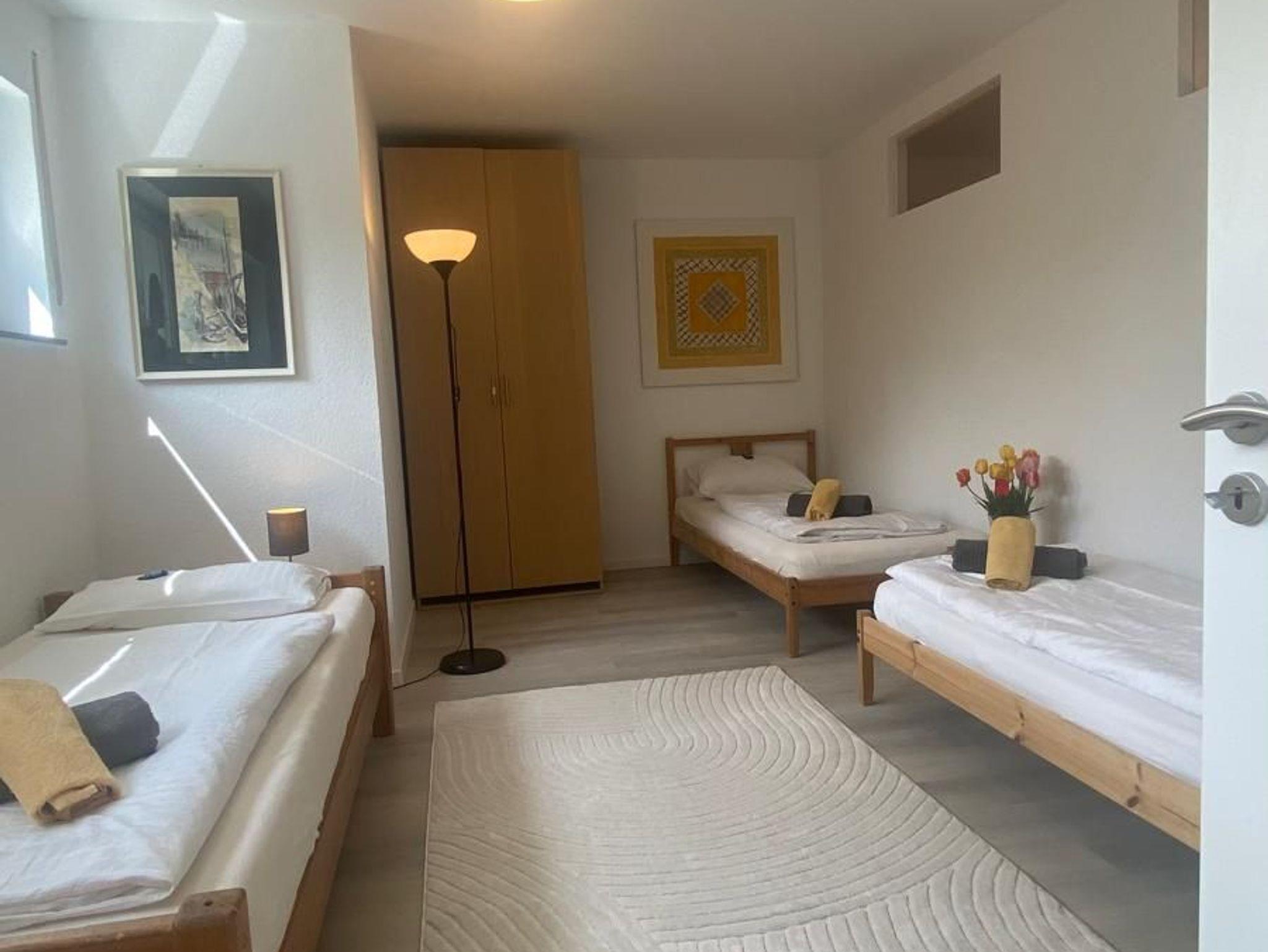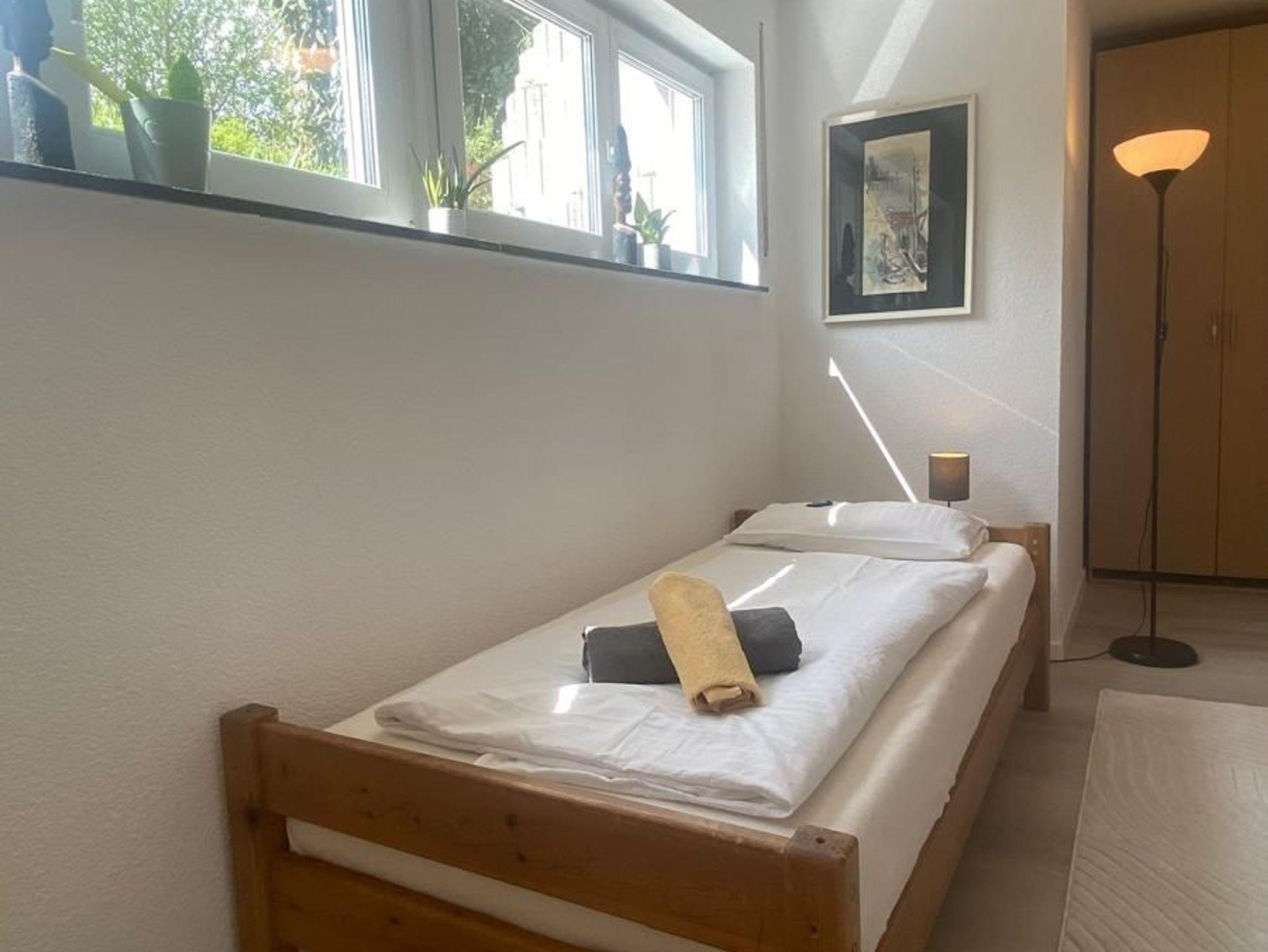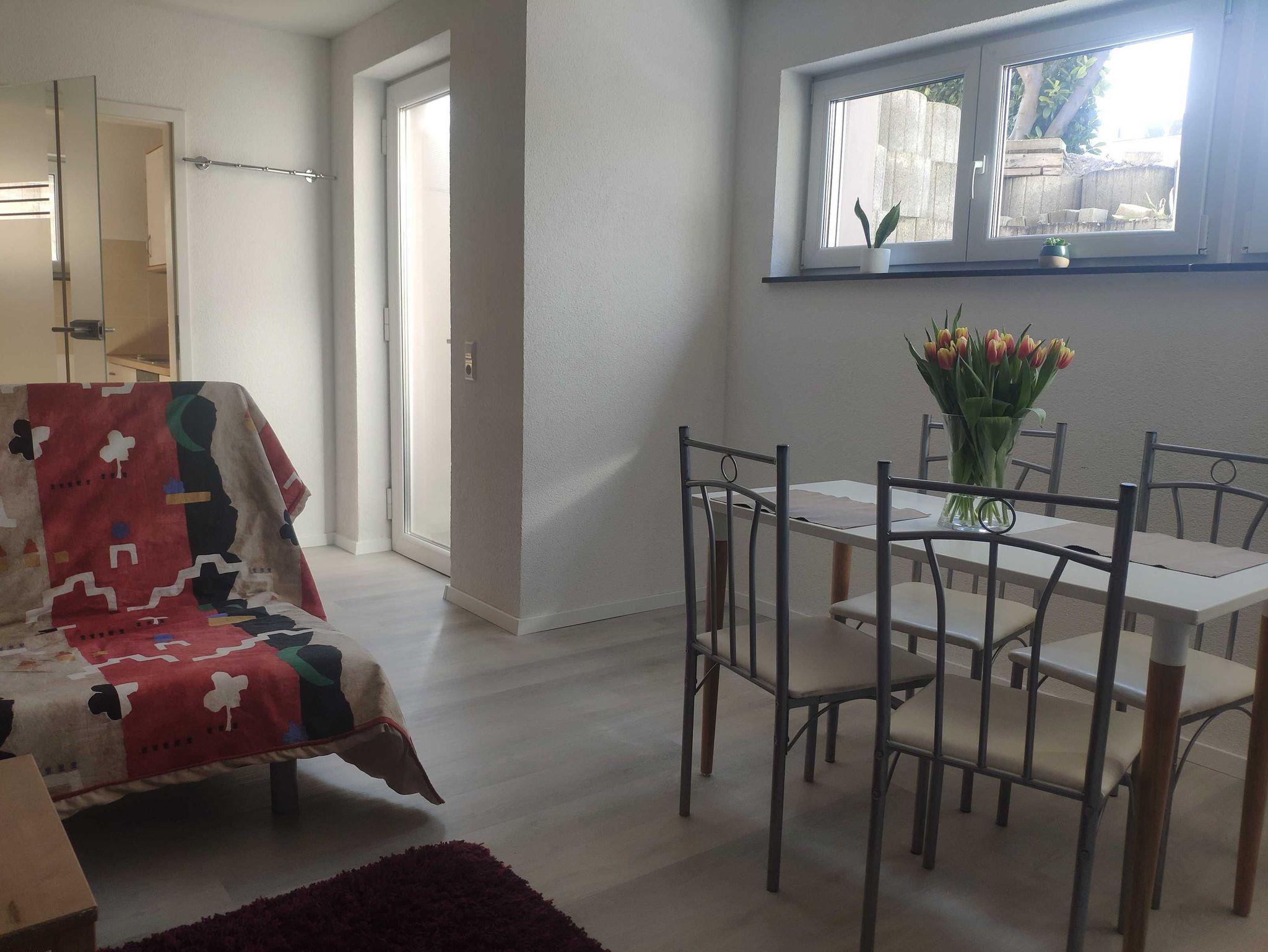 Das Nichtraucher- 2 Zimmer Apartment liegt verkehrsgünstig in der Nähe der Autobahnabfahrt Freiburg-Süd im Souterrain einer Einfamilienhaus am Stadtrand von Freiburg. Das Nichtraucher- 2 Zimmer Ferienwohnung ist optimal für die Belegung von 5 Personen geeignet. Die Ferienwohnung ist 60 qm groß, hat eine voll ausgestattete Küche mit Elektroherd und Backofen, Essecke, Spülmaschine, Kaffeemaschine, Toaster und Mikrowelle. Das Bad ist mit Dusche/ WC, Fön ausgestattet. Der Wohn- und Schlafbereich verfügt neben fünf Einzelbetten und Kleiderschrank, Internetanschluss, Schreibtisch und Sitzgelegenheiten. Fußbodenheizung im Wohn-und Badbereich sorgen für angenehme Wärme im Winter. Waschmaschine/Trockner befinden sich vor der Wohnung und können gegen Gebühr genutzt werden. Nur Übernachtung, keine Verpflegung. Handtücher und Bettwäsche vorhanden.