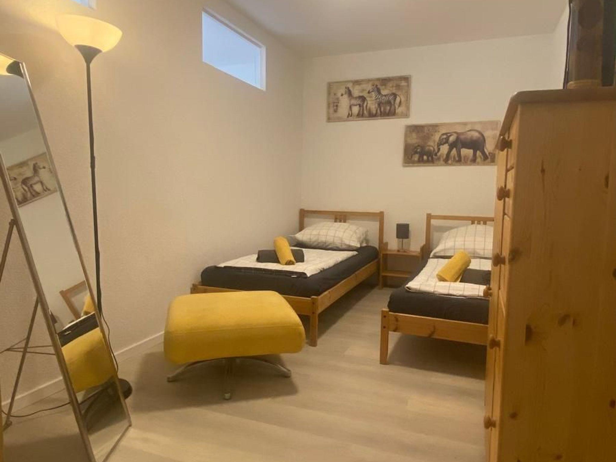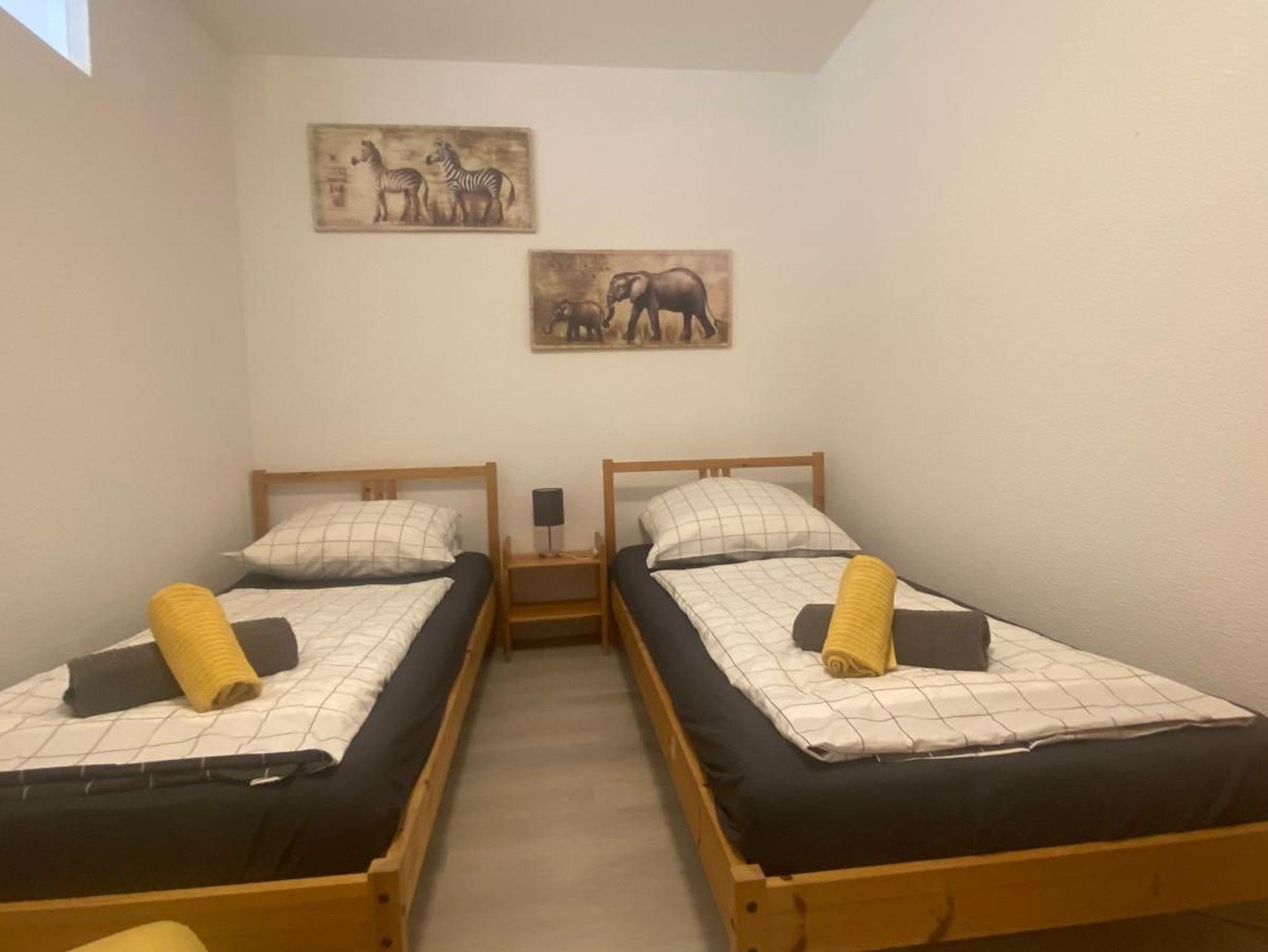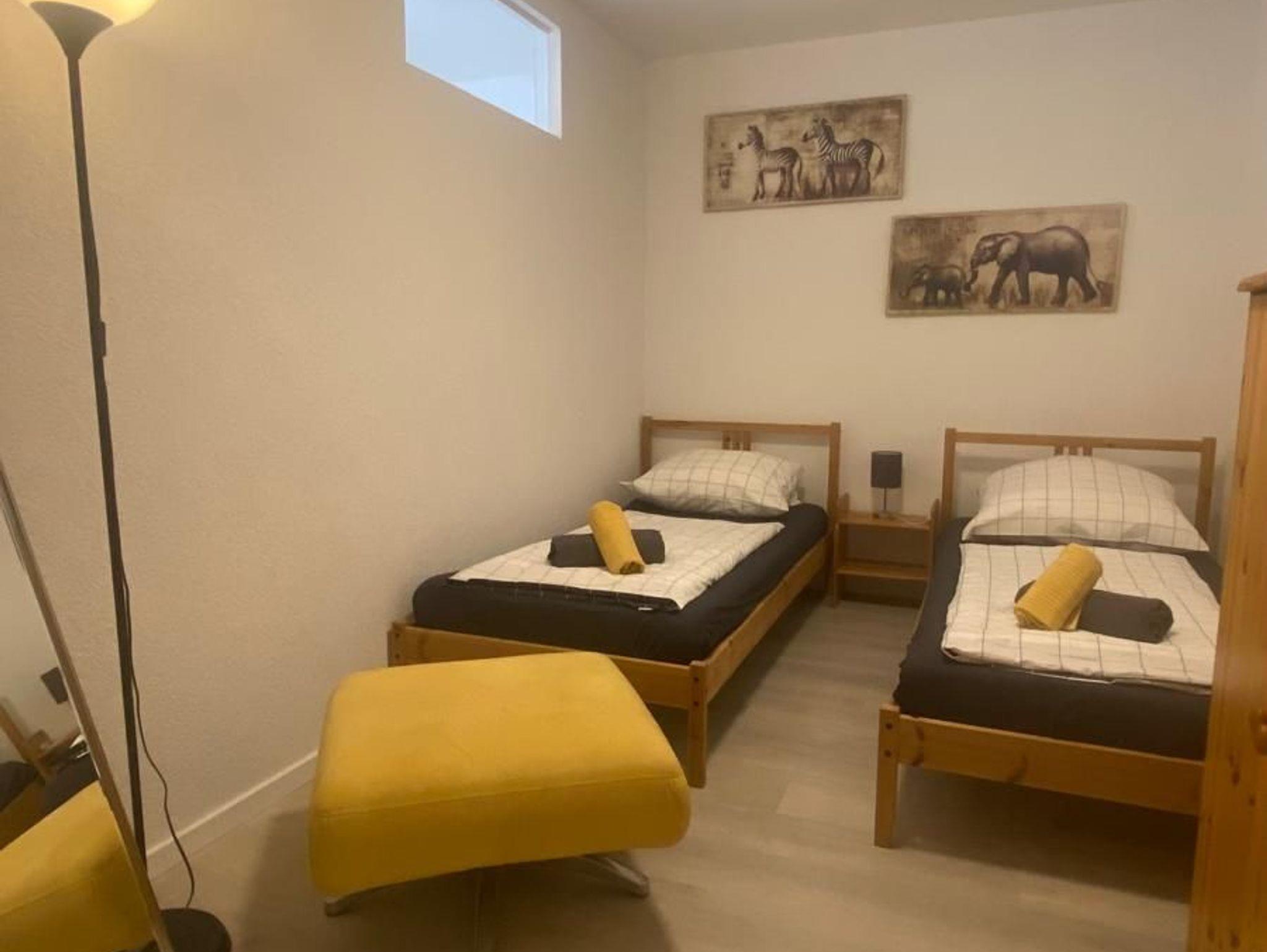 Das Nichtraucher- 2 Zimmer Apartment liegt verkehrsgünstig in der Nähe der Autobahnabfahrt Freiburg-Süd im Souterrain einer Einfamilienhaus am Stadtrand von Freiburg. Das Nichtraucher- 2 Zimmer Ferienwohnung ist optimal für die Belegung von 5 Personen geeignet. Die Ferienwohnung ist 60 qm groß, hat eine voll ausgestattete Küche mit Elektroherd und Backofen, Essecke, Spülmaschine, Kaffeemaschine, Toaster und Mikrowelle. Das Bad ist mit Dusche/ WC, Fön ausgestattet. Der Wohn- und Schlafbereich verfügt neben fünf Einzelbetten und Kleiderschrank, Internetanschluss, Schreibtisch und Sitzgelegenheiten. Fußbodenheizung im Wohn-und Badbereich sorgen für angenehme Wärme im Winter. Waschmaschine/Trockner befinden sich vor der Wohnung und können gegen Gebühr genutzt werden. Nur Übernachtung, keine Verpflegung. Handtücher und Bettwäsche vorhanden.