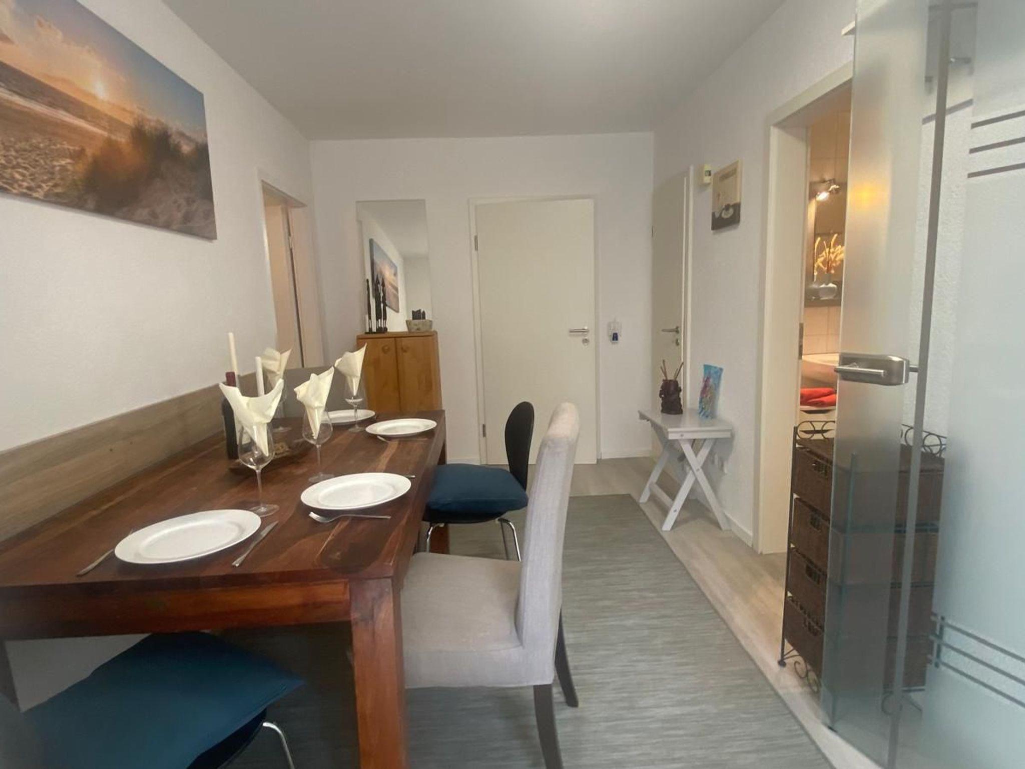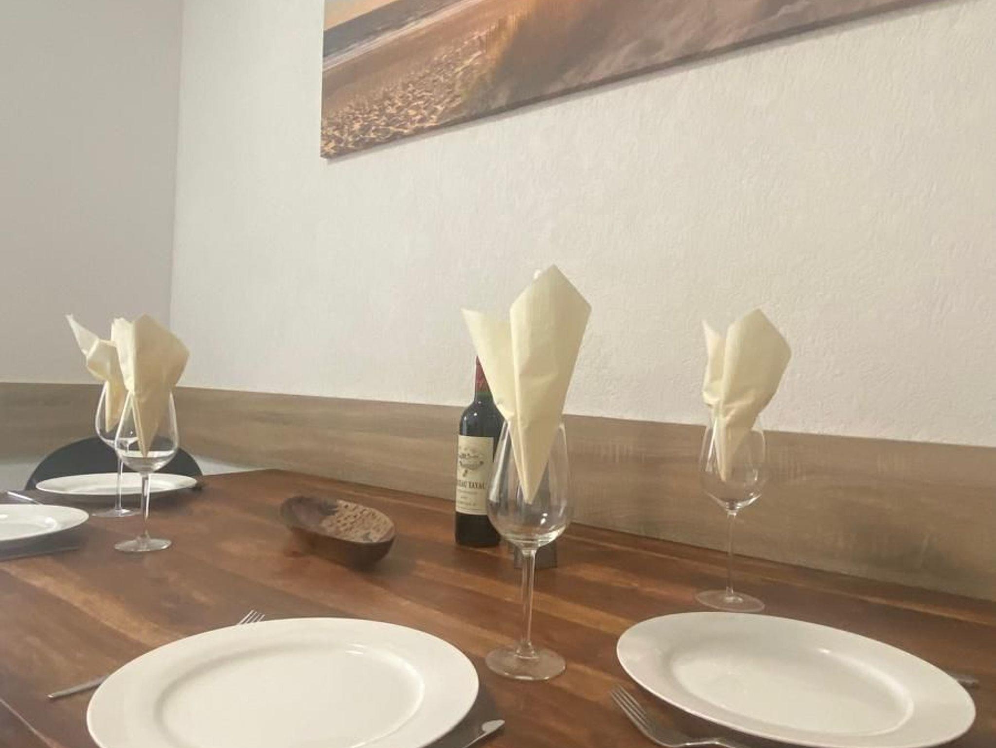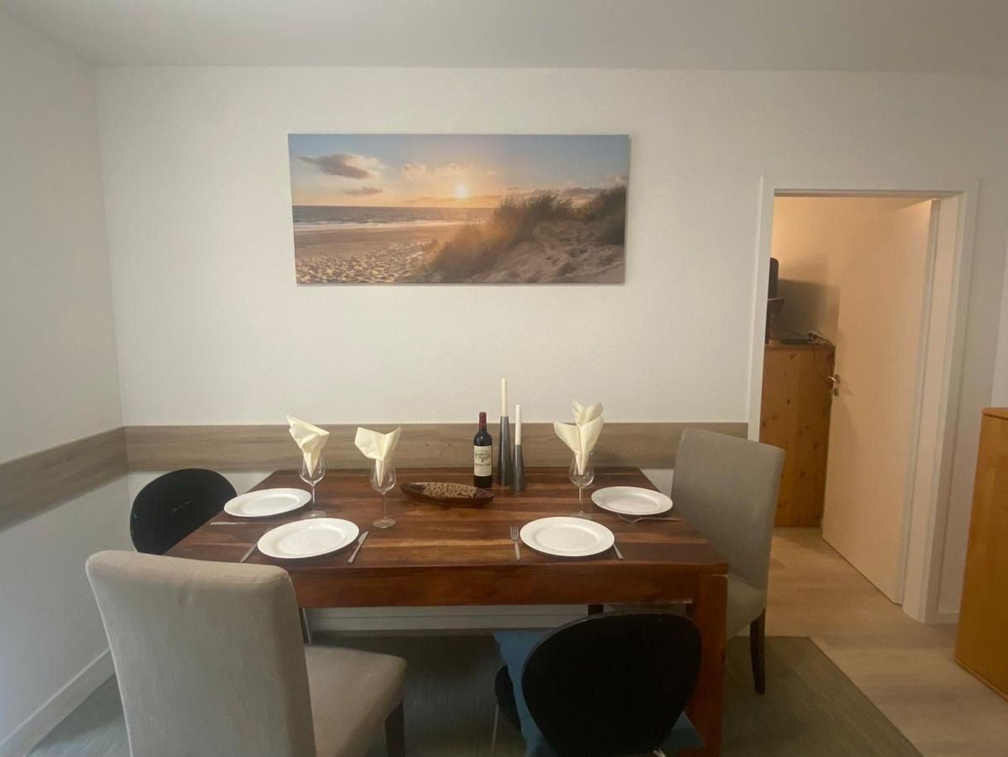 Fernseher im Wohnbereich, große Fensterfront, Jalousien, Mülltrennung, Esstisch mit 4 Stühlen, ausziehbare Couch für 2 Personen, Kinder unter einem Jahr schlafen im Bett der Eltern kostenfrei.