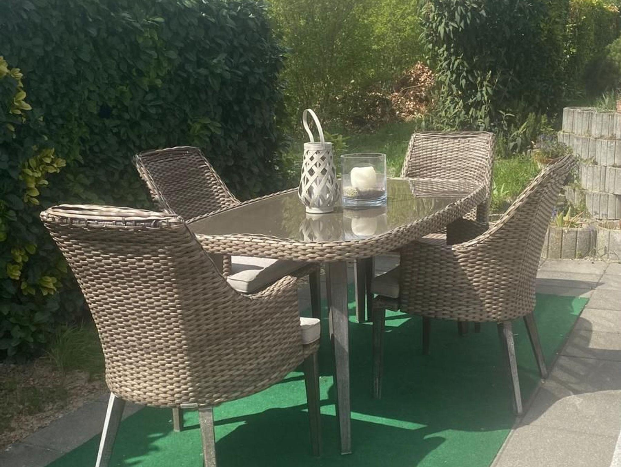 Kücheneinrichtung: Mikrowelle, Toaster, Kaffeemaschine, Pfannen, Töpfe, Geschirr, Gläser (auch Wein-, Bier- und Sektgläser), Geschirrtuch, Besteck, Flaschenöffner, 2 Platten Induktionsherd, Kühlschrank mit Gefrierfach.