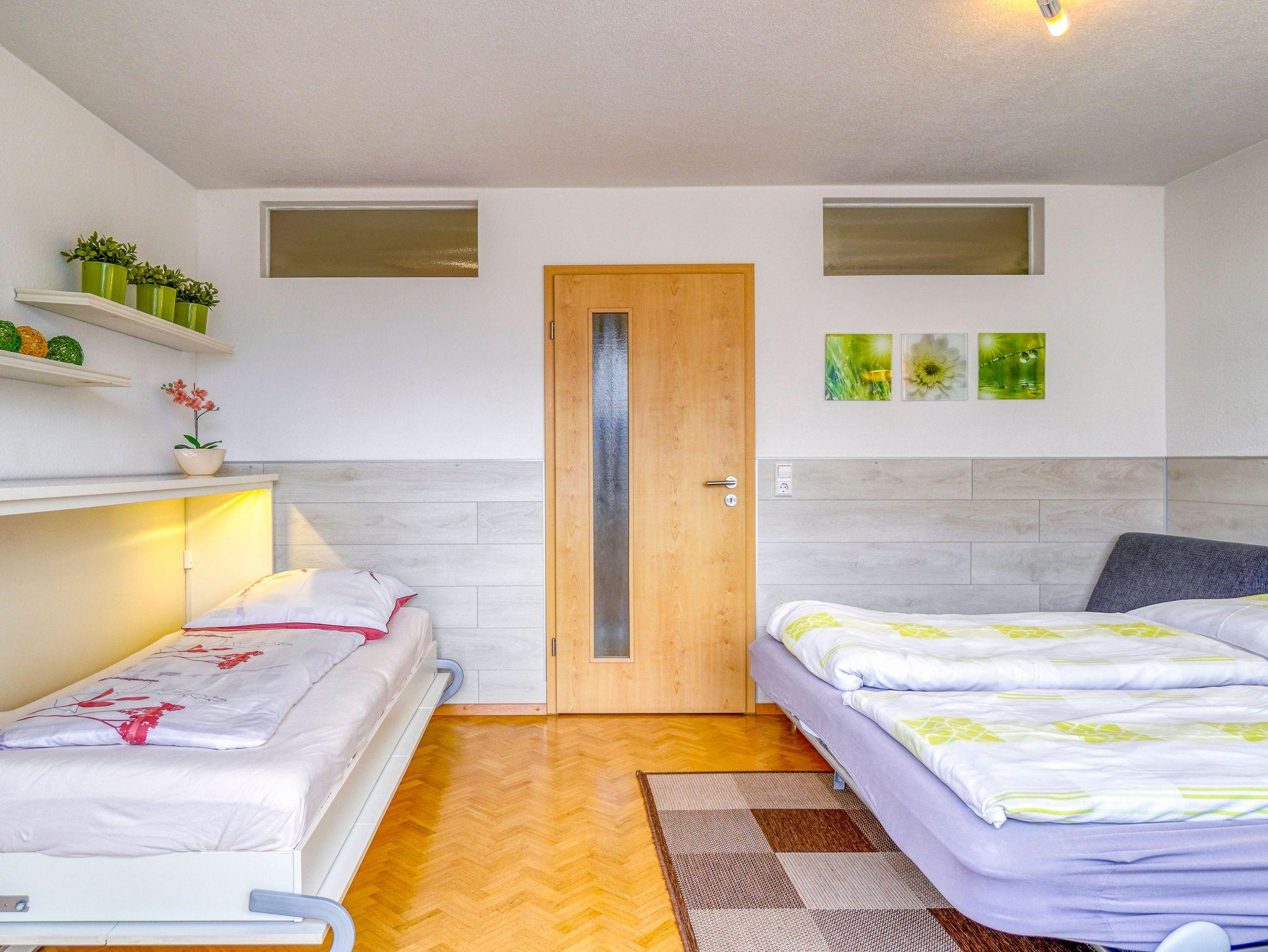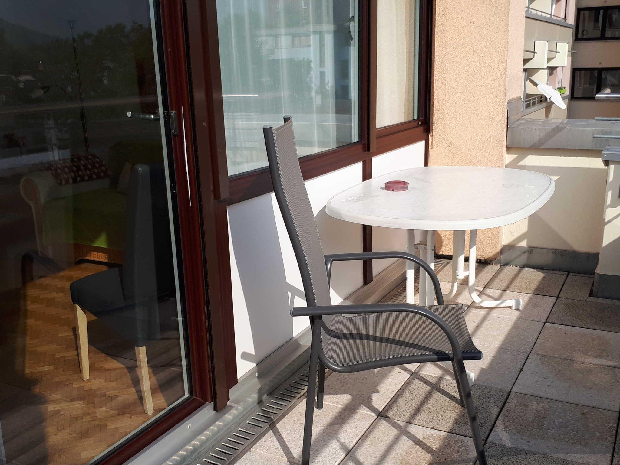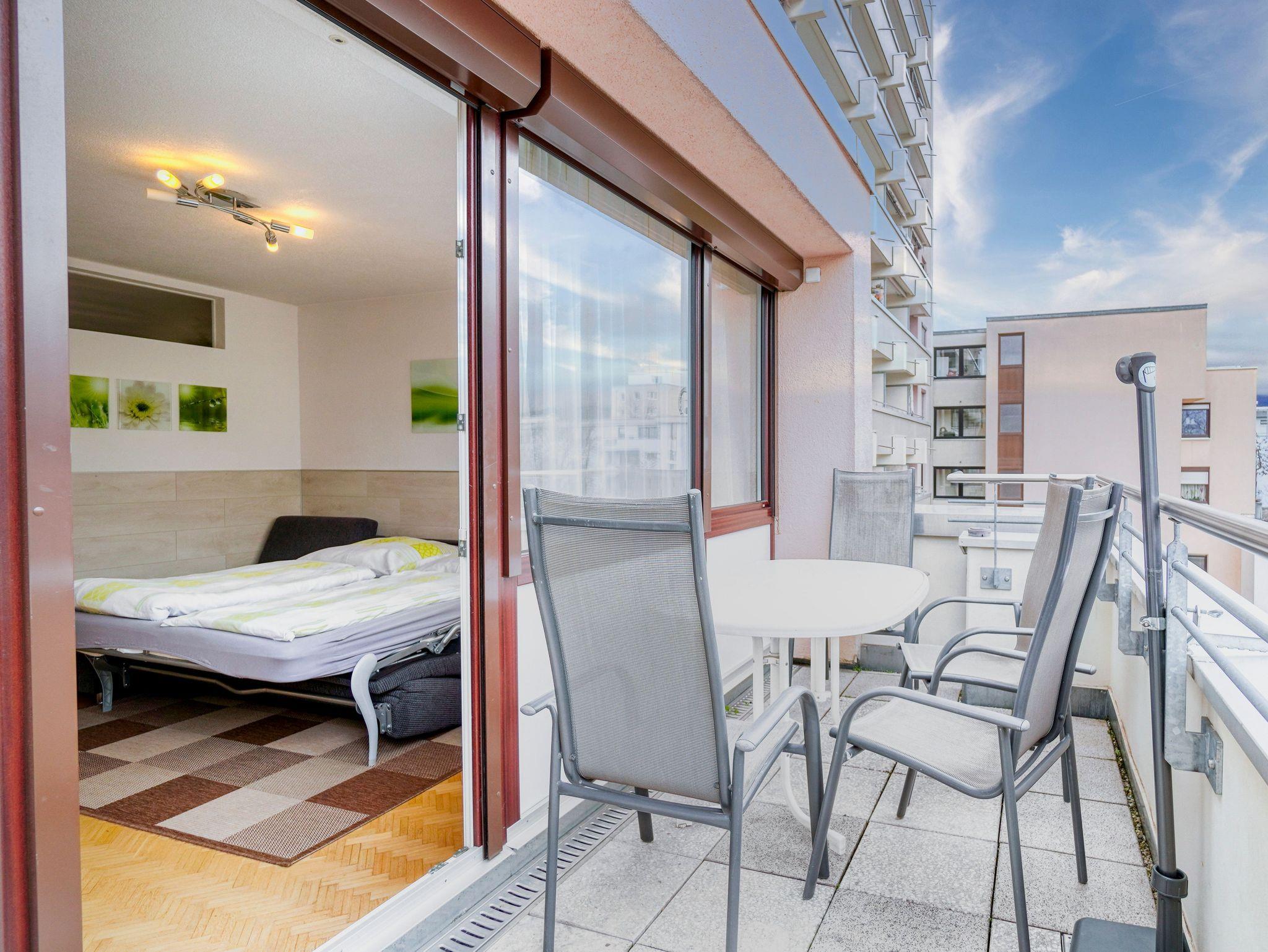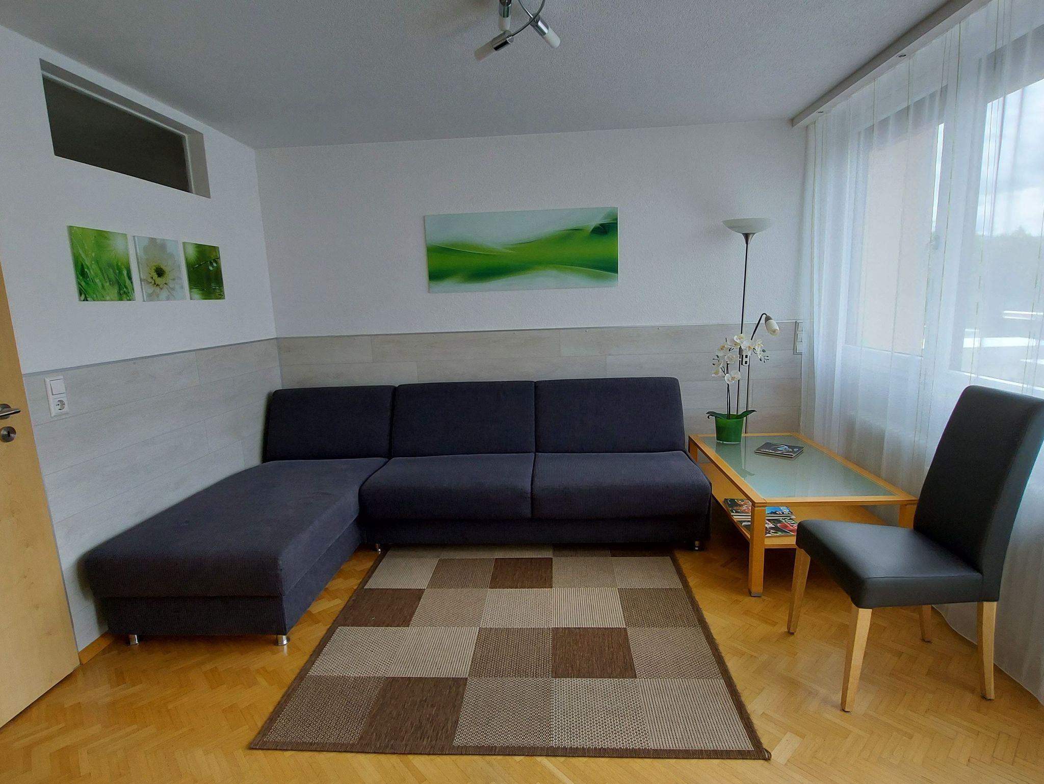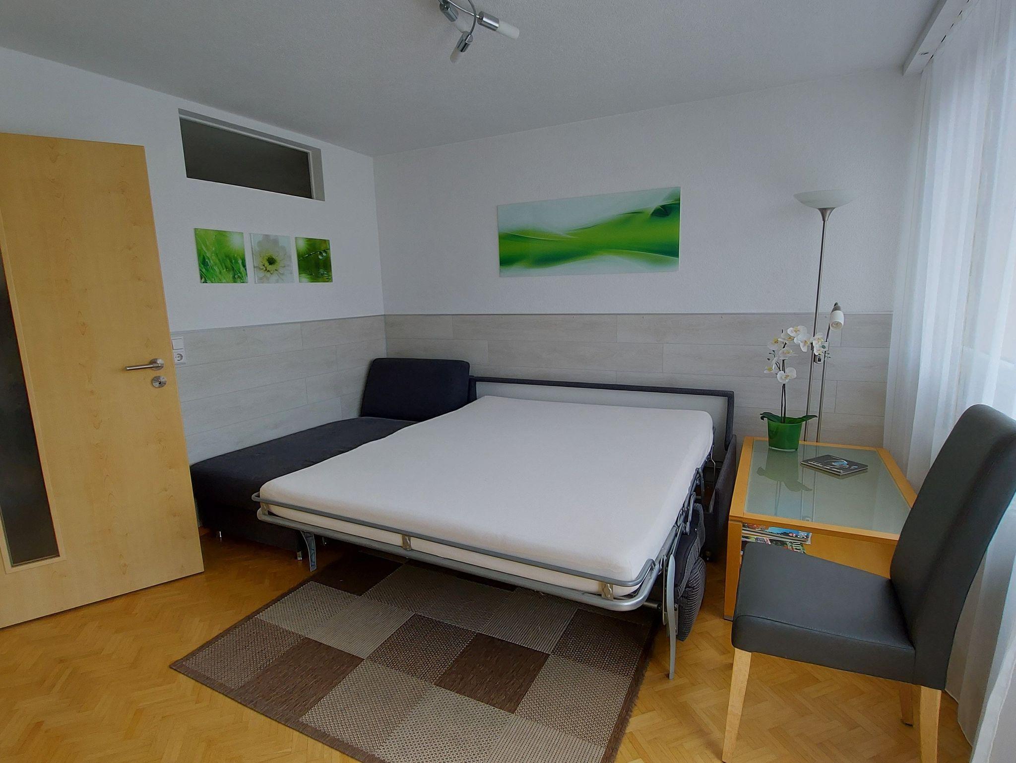 Ruhige 2 Zimmer Ferienwohnung, 1 Schlafraum mit Doppelbett, 1 Wohn-/Schlafbereich mit Schlafcouch und Einzelbett, separate Küche, Bad mit WC und Dusche, Internetanschluß und WLAN. Herrlicher Blick auf die Berge von dem Südbalkon. Kostenlose Tiefgarageplatz. Für Haustiere werden 5,- Euro pro Nacht berechnet. Herrlicher Blick auf die Berge von dem Südbalkon.