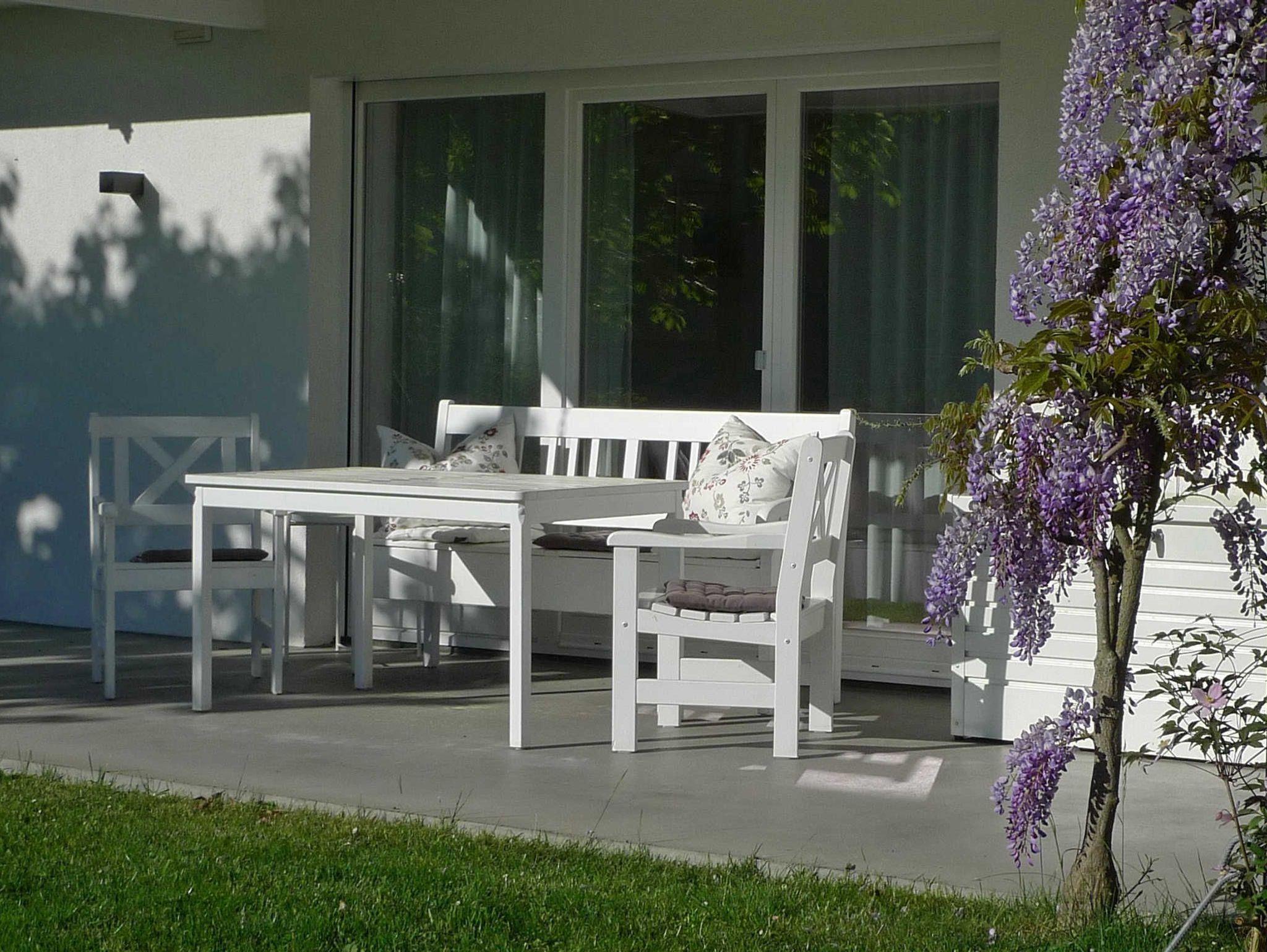Im Aussenbereich gibt es einen Autostellplatz, Terrasse (35 qm), Gartenmöbel, Liegewiese.