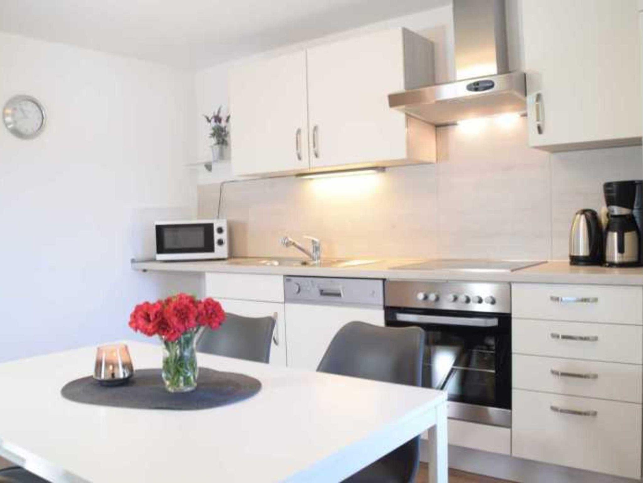 Die modern eingerichtete Ferienwohnung (69 qm, Wohnzimmer, 2 Schlafzimmer, Bad mit Wanne und WC, Küche, Terrasse im Garten, WLAN, Parkplatz) bietet max. 6 Gästen ausreichend Platz.