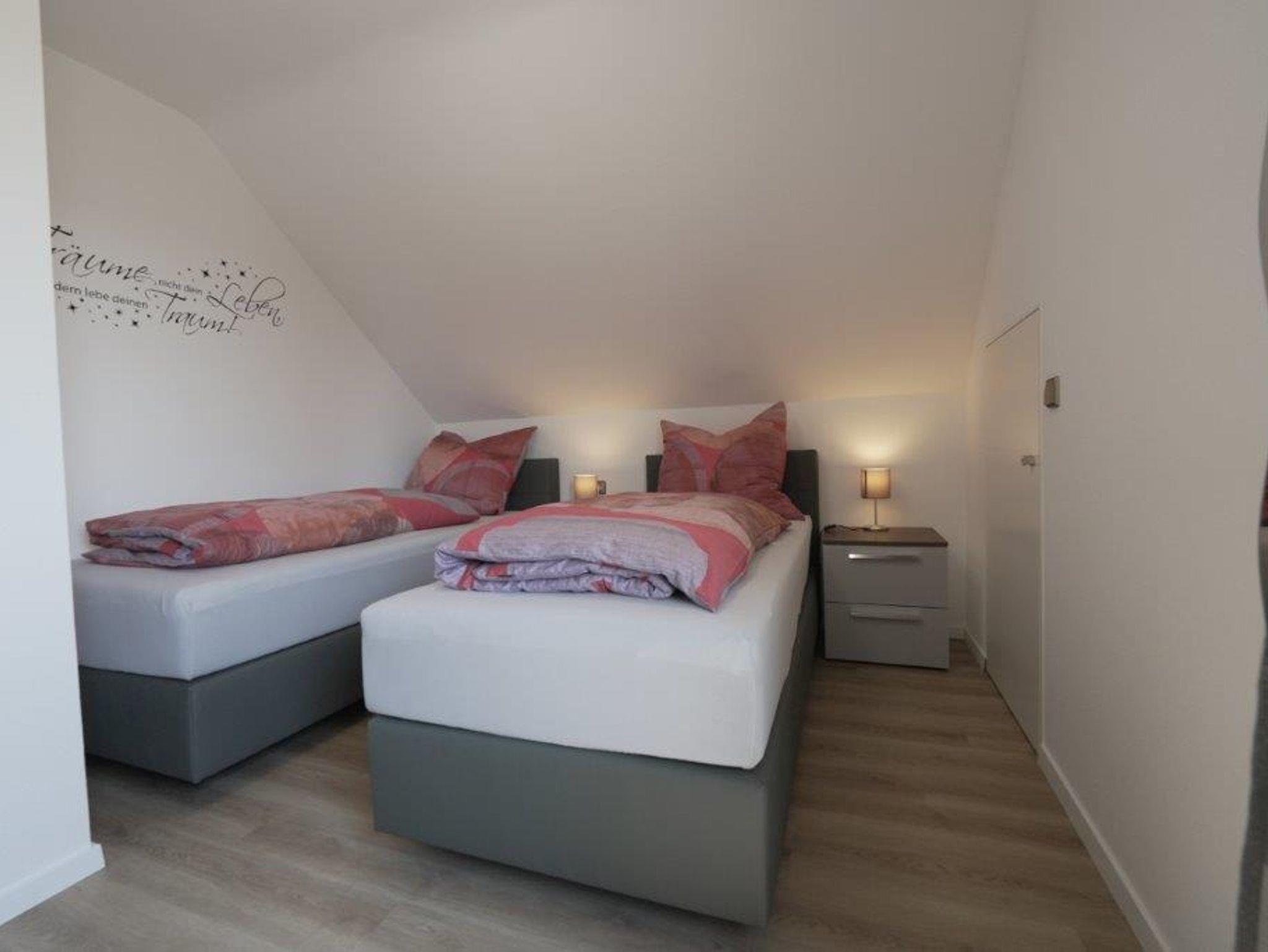 Ein Schlafzimmer ist mit einem Boxspring-Doppelbett, das andere Schlafzimmer mit zwei Boxspring-Einzelbetten ausgestattet. Der eigene Balkon mit Aussicht kann von der Küche aus betreten werden und lädt zum gemütlichen Verweilen ein.