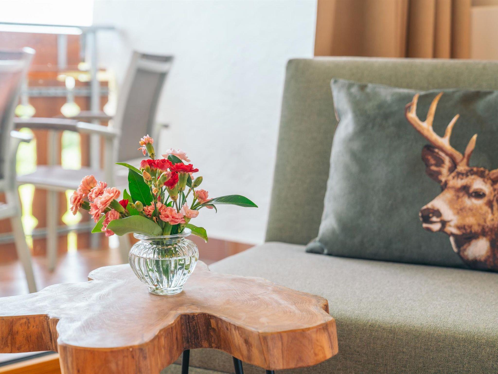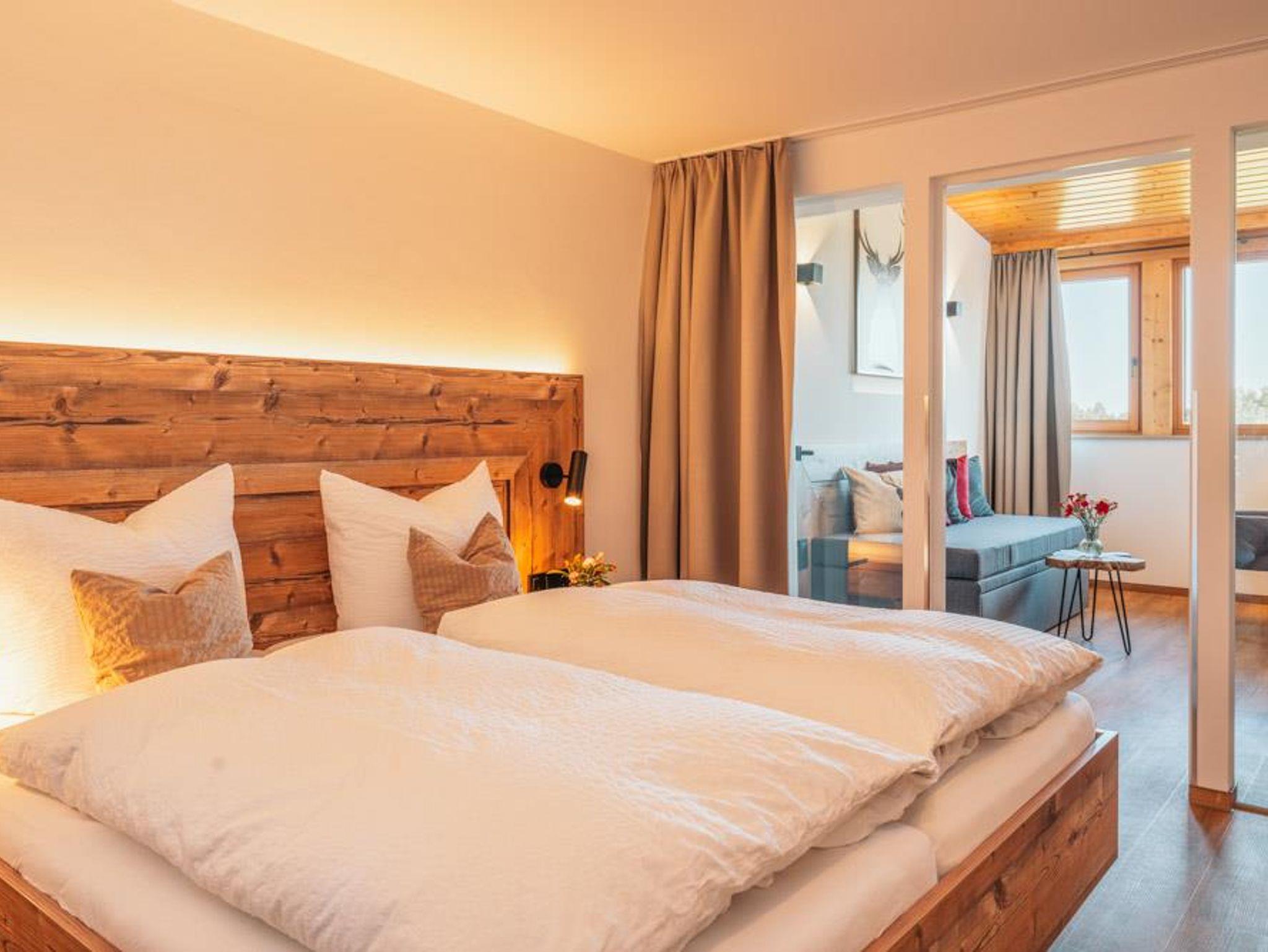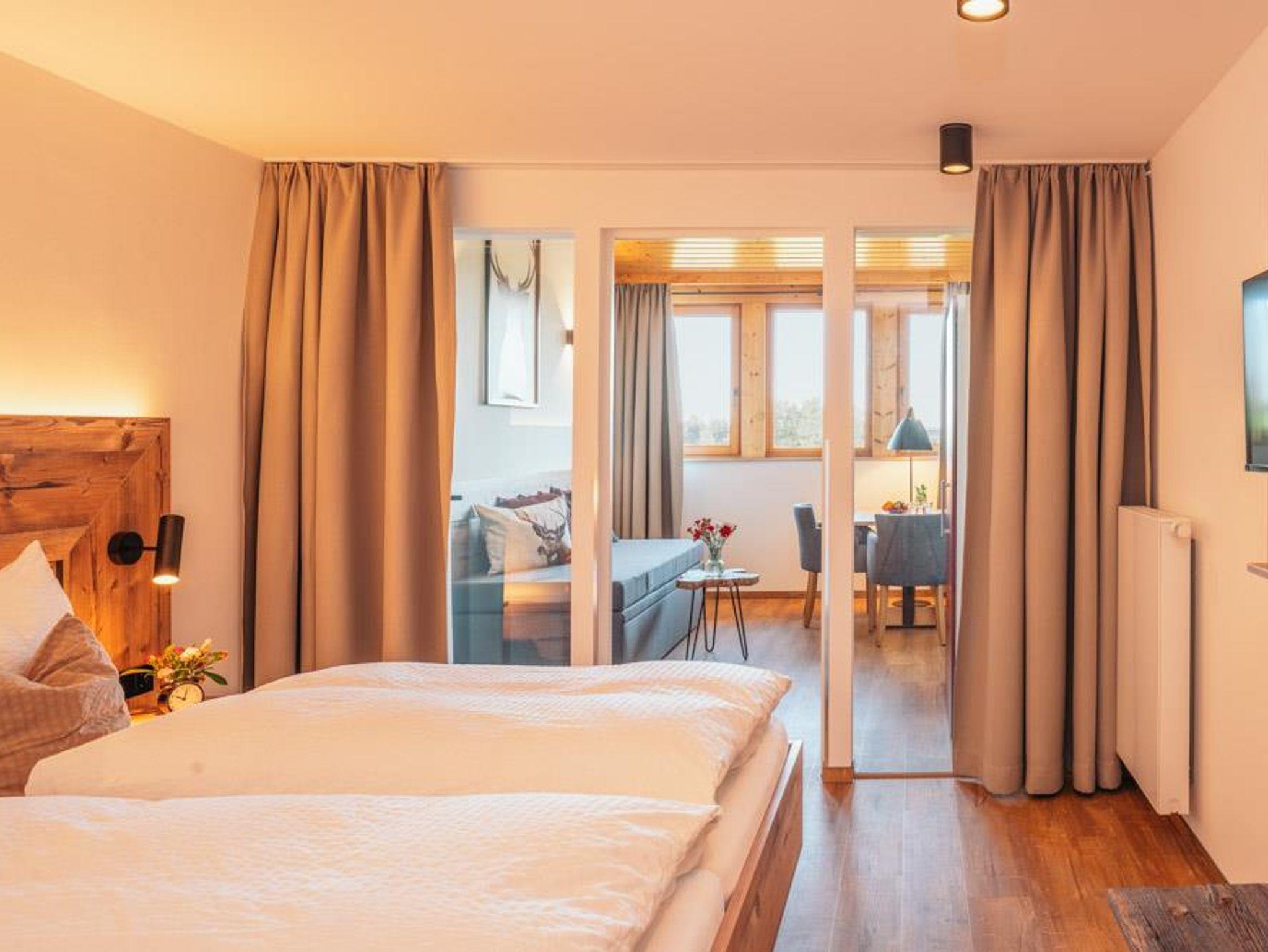 Das Zimmer verfügt auf 31 qm über ein Schlafzimmer mit einem 180 cm x 200 cm großen Doppelbett, ein eigenes Badezimmer, einen TV, einen Kleiderschrank mit Gepäckablage, einen Ganzkörperspiegel sowie über ein Anschlusszimmer mit Schlafsofa und Essecke, TV und gemütlicher Leselampe.