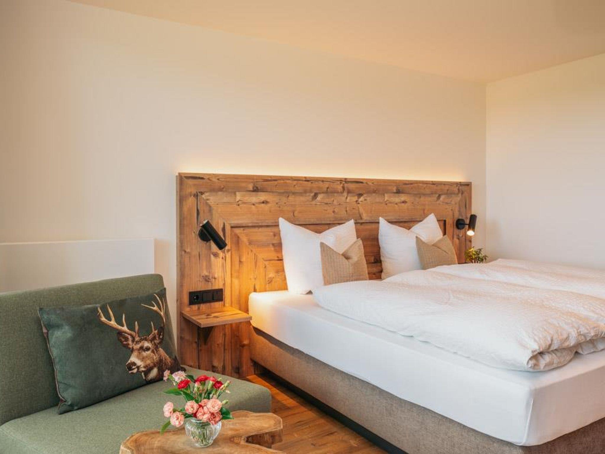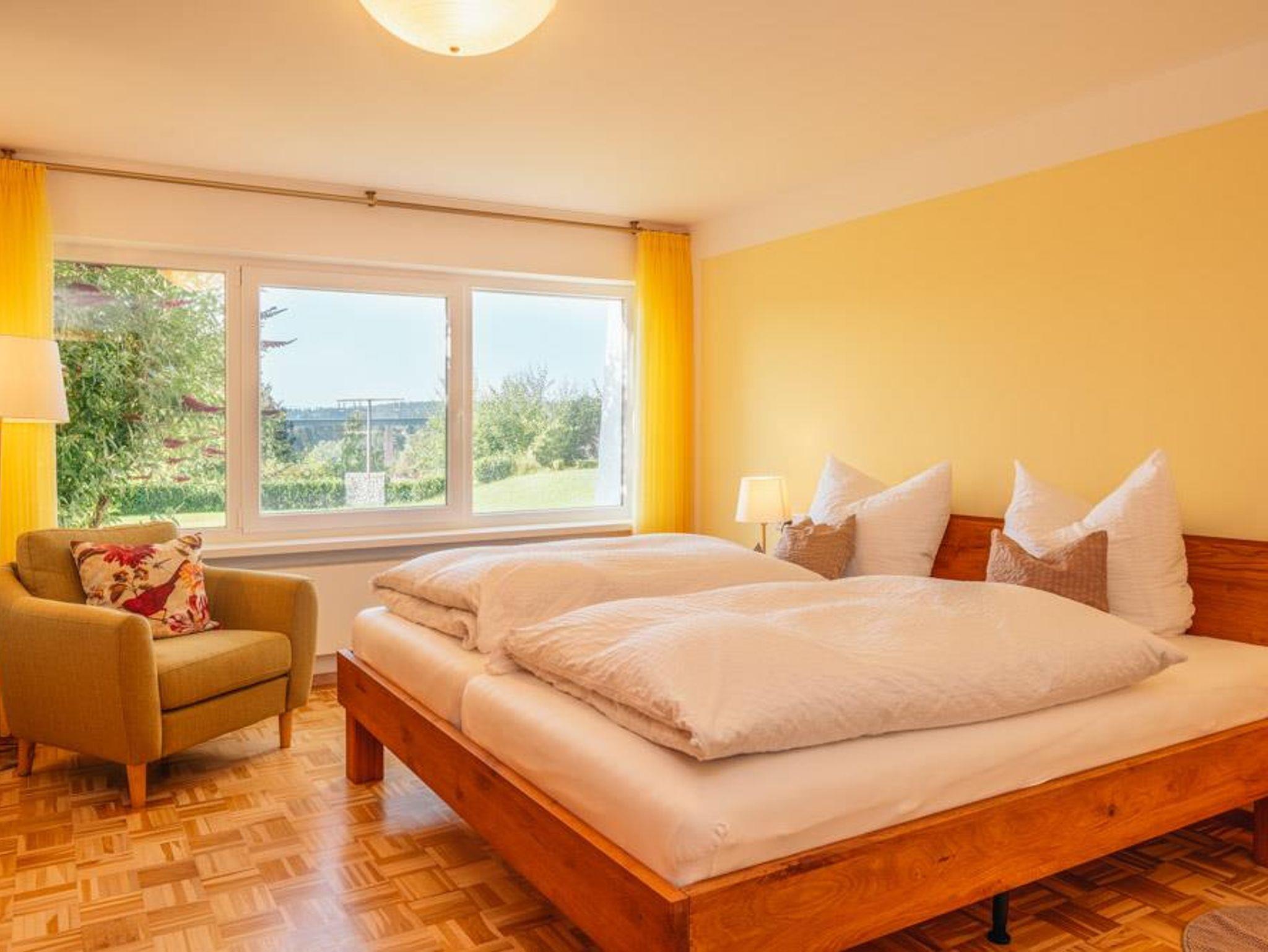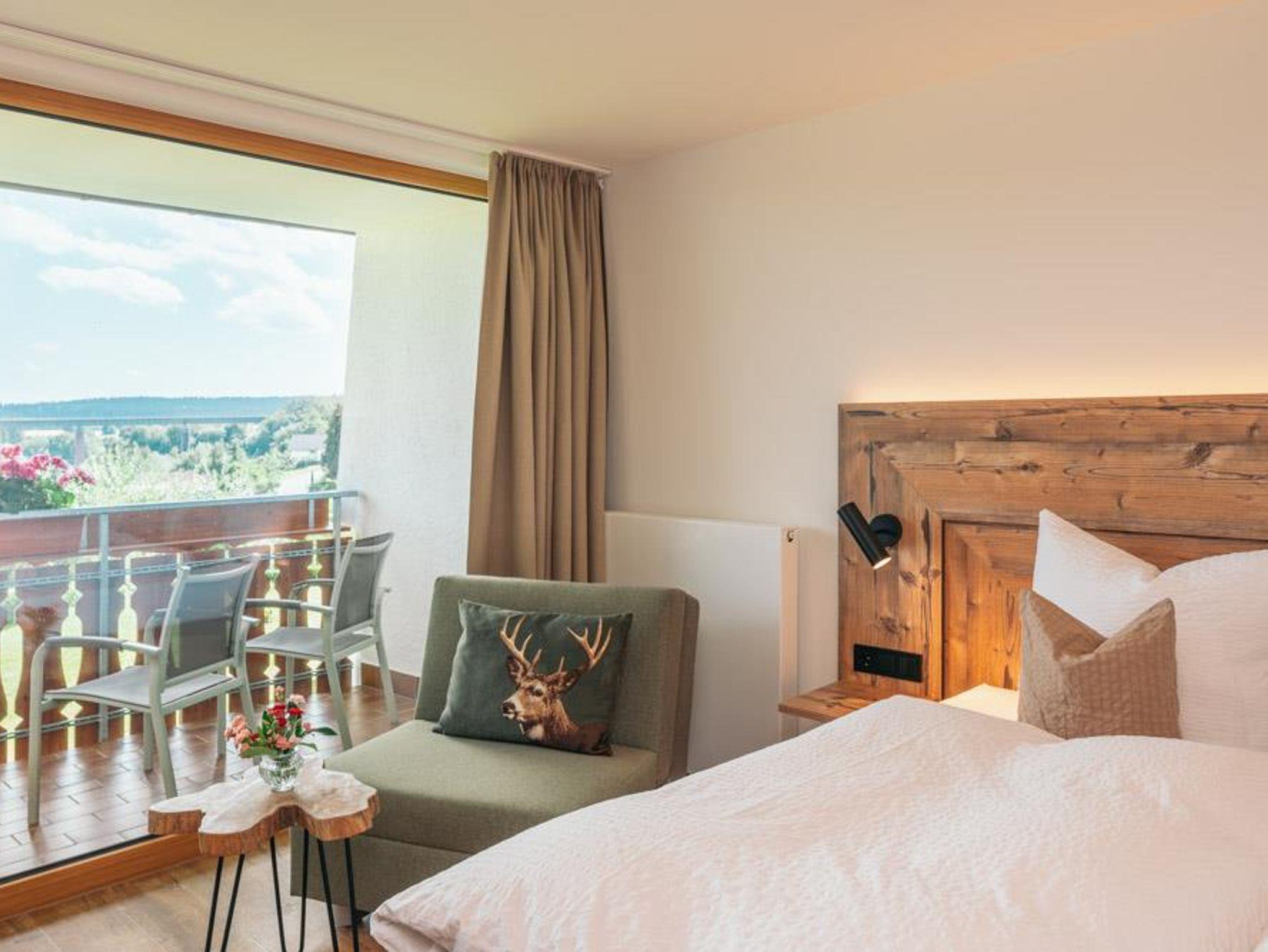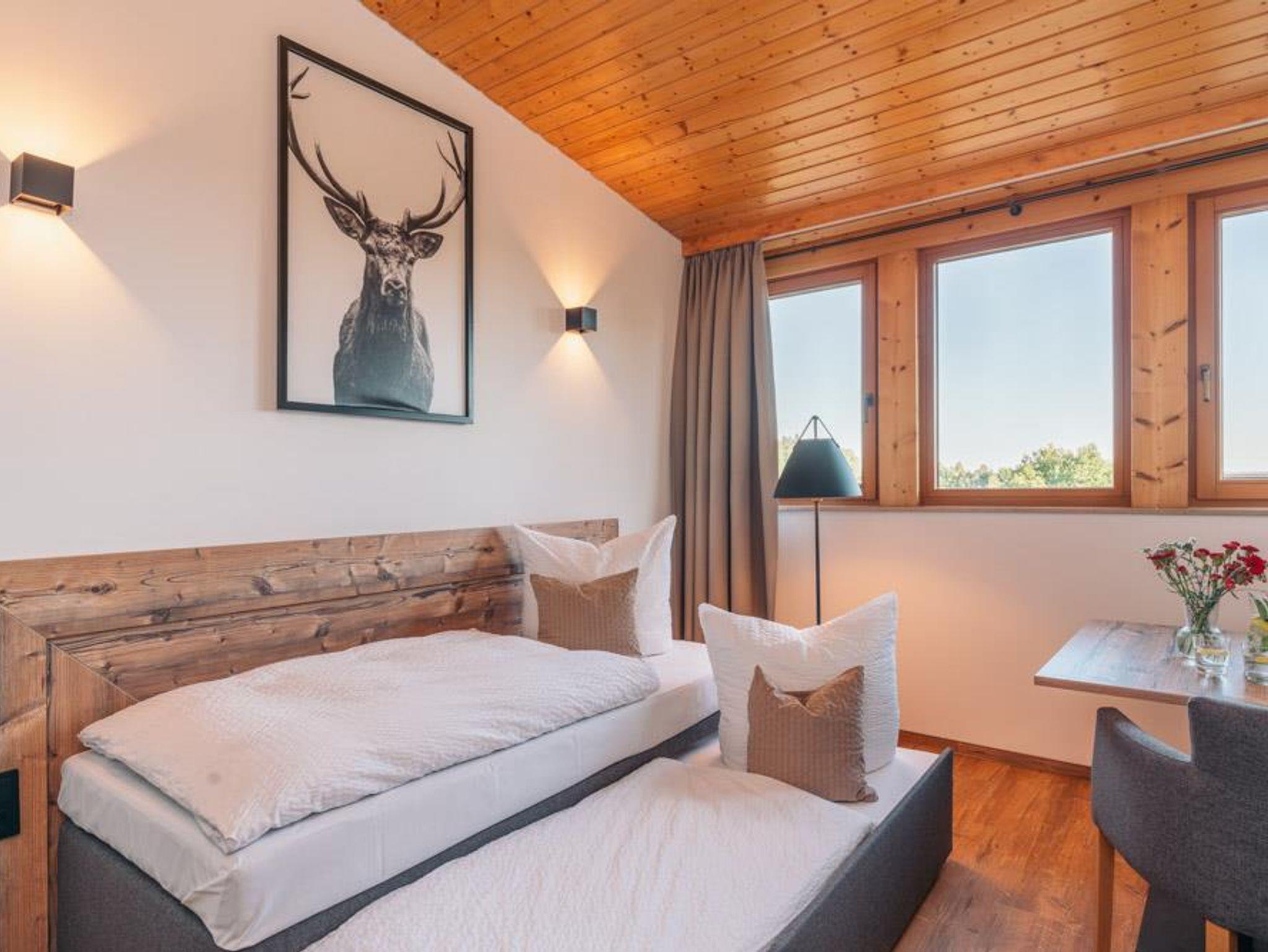 Jetzt wird's wild! Unsere Ferienwohnung für Selbstversorger im modernen Landhausstil und mitheimischem Hirschdesign im Schlafbereich bietet Ihnen einen herrlichen Blick ins Stockerbachtal auf unser wunderschönes Grüntal.