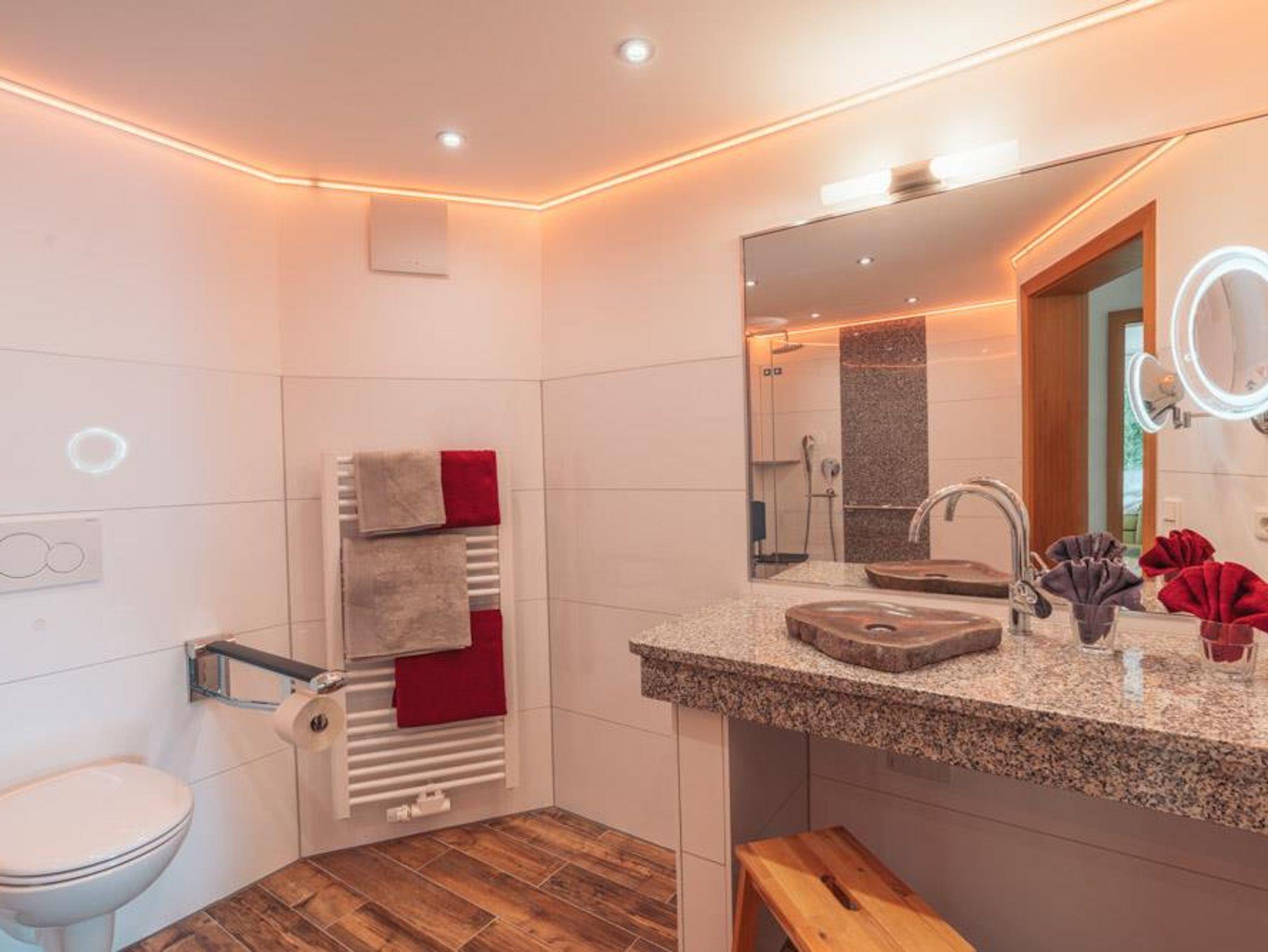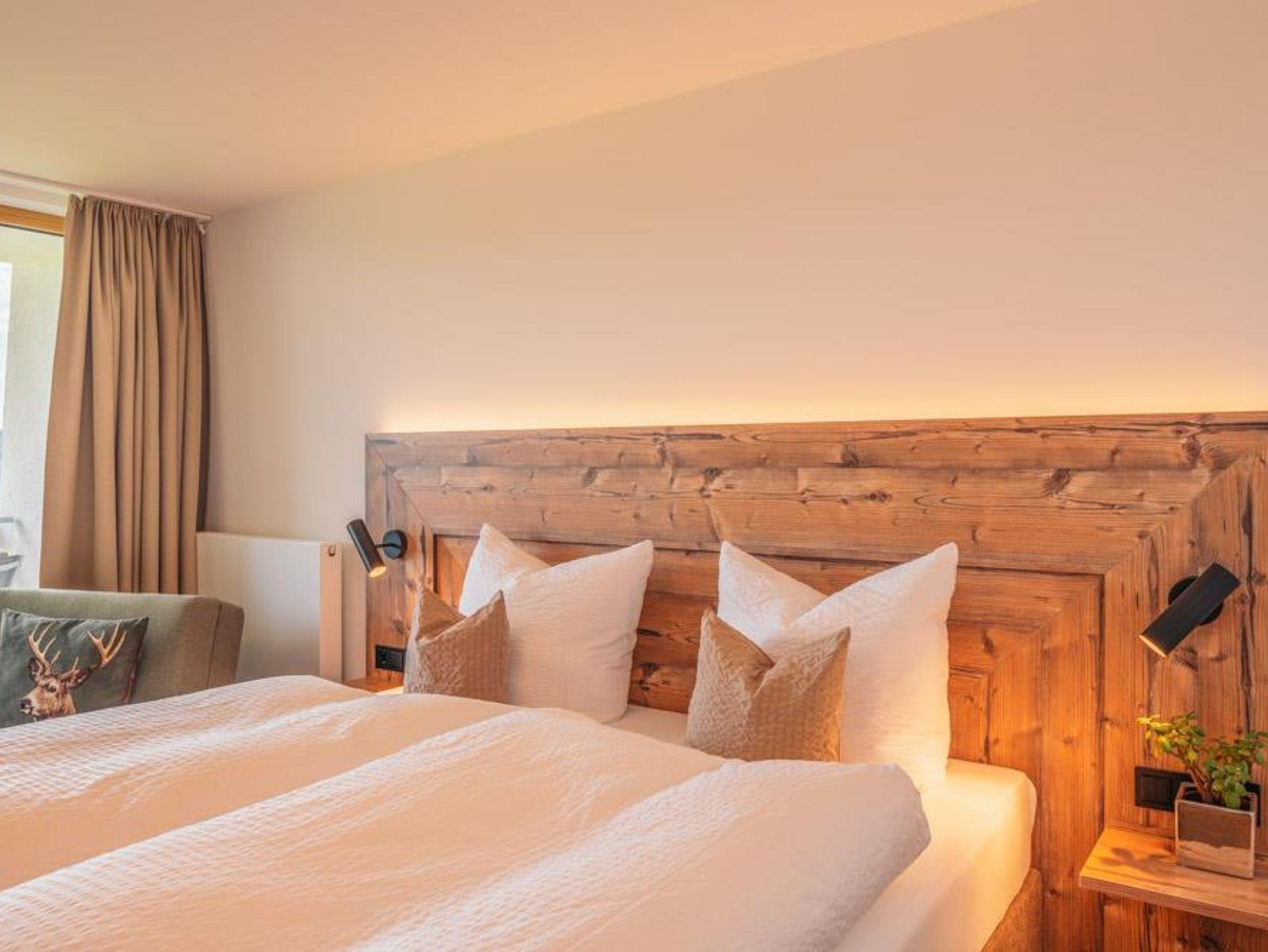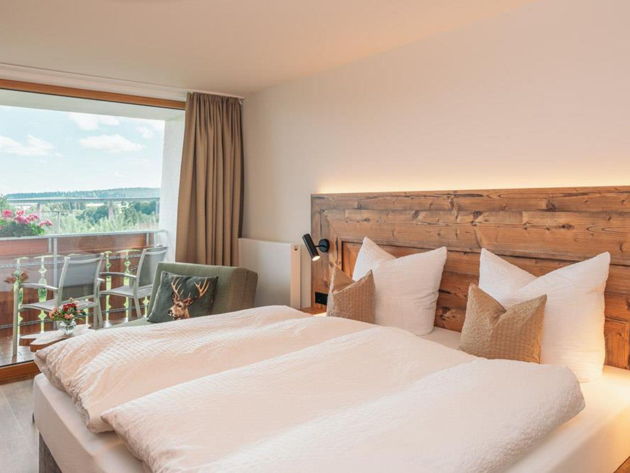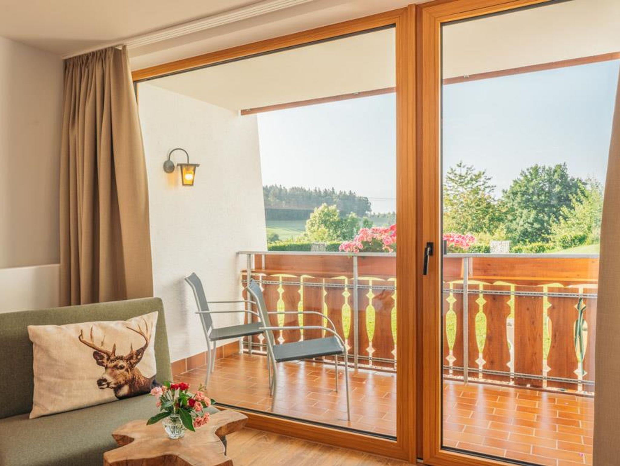 Jetzt wird's wild! Unsere Ferienwohnung für Selbstversorger im modernen Landhausstil und mitheimischem Hirschdesign im Schlafbereich bietet Ihnen einen herrlichen Blick ins Stockerbachtal auf unser wunderschönes Grüntal.