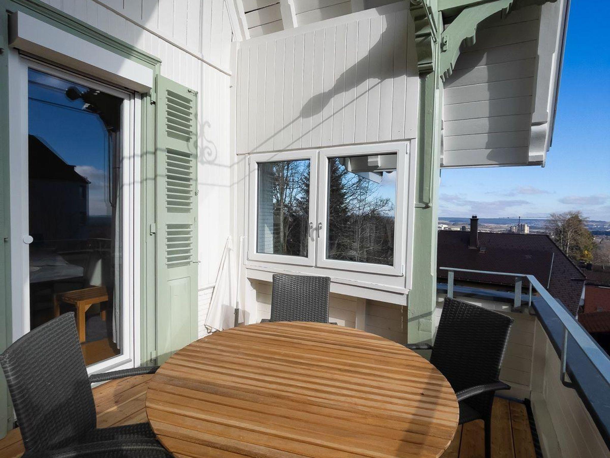 Sie betreten die Wohnung über einen Wohnbereich mit Sofa, Küche und Essbereich. Das Badezimmer mit Dusche und WC sowie das Schlafzimmer sind von dort aus zugänglich . Das Schlafzimmer mit einem Doppelbett verfügt über einen direkten Zugang zum Balkon mit Ausblick auf die Schwäbische Alp und lädt zum gemütlichen Verweilen ein.