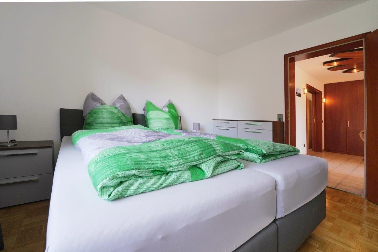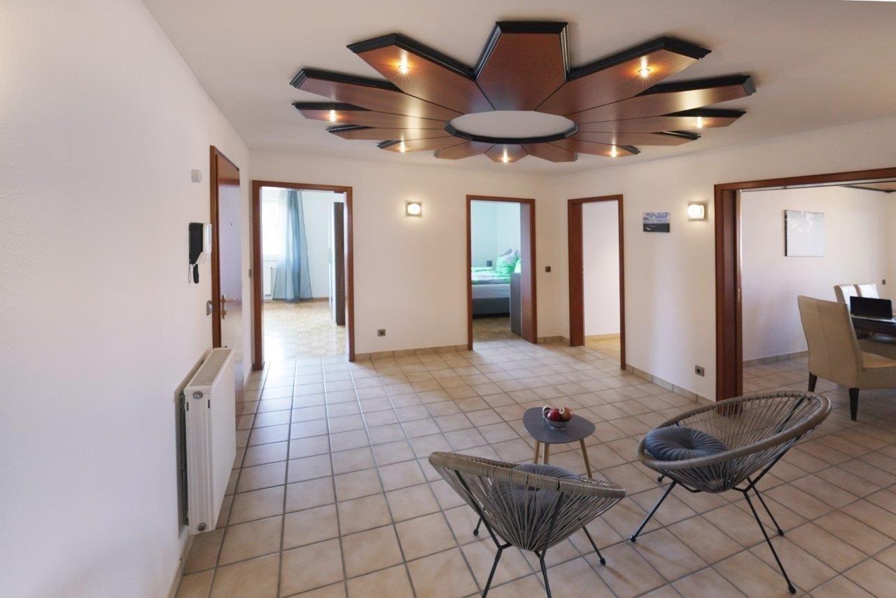 Sie betreten die Wohnung über eine großzügige Diele. Von dort gelangen sie in alle Räume. Die Wohnung hat eine Küche mit einem separaten Esszimmer. Ein Schlafzimmer ist mit einem Boxspring-Doppelbett, das andere Schlafzimmer mit zwei Boxspring-Einzelbetten ausgestattet.