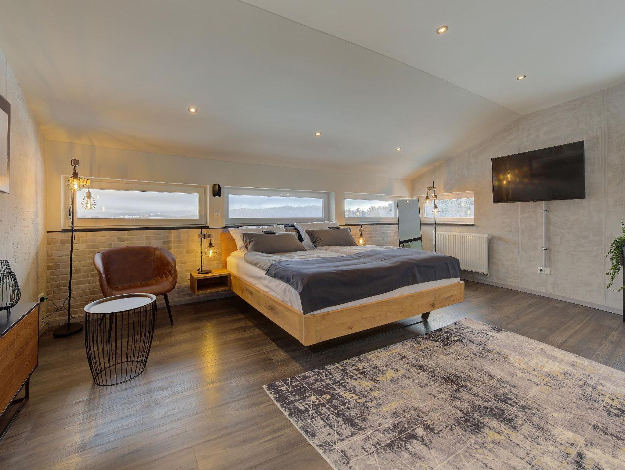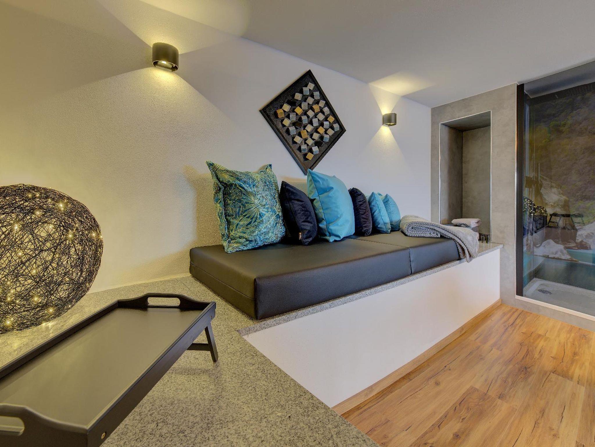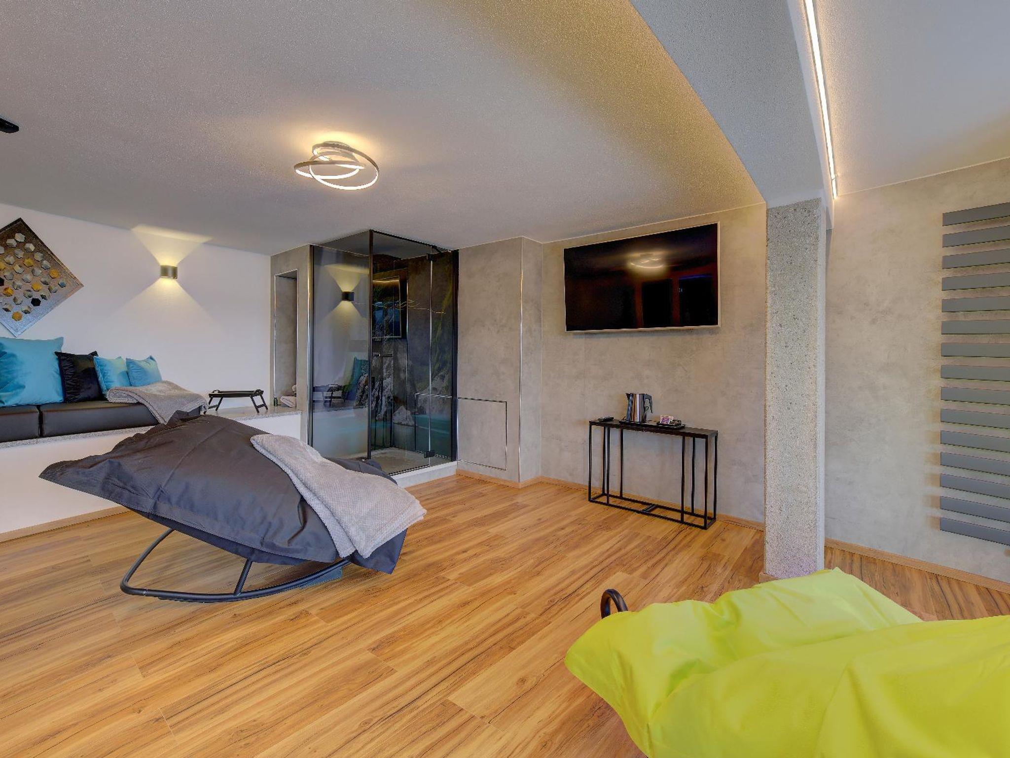 Im Schlafzimmer, Wohnzimmer und Ihrem privaten Wellnessbereich steht Ihnen jeweils ein großer Fernseher zur Verfügung.