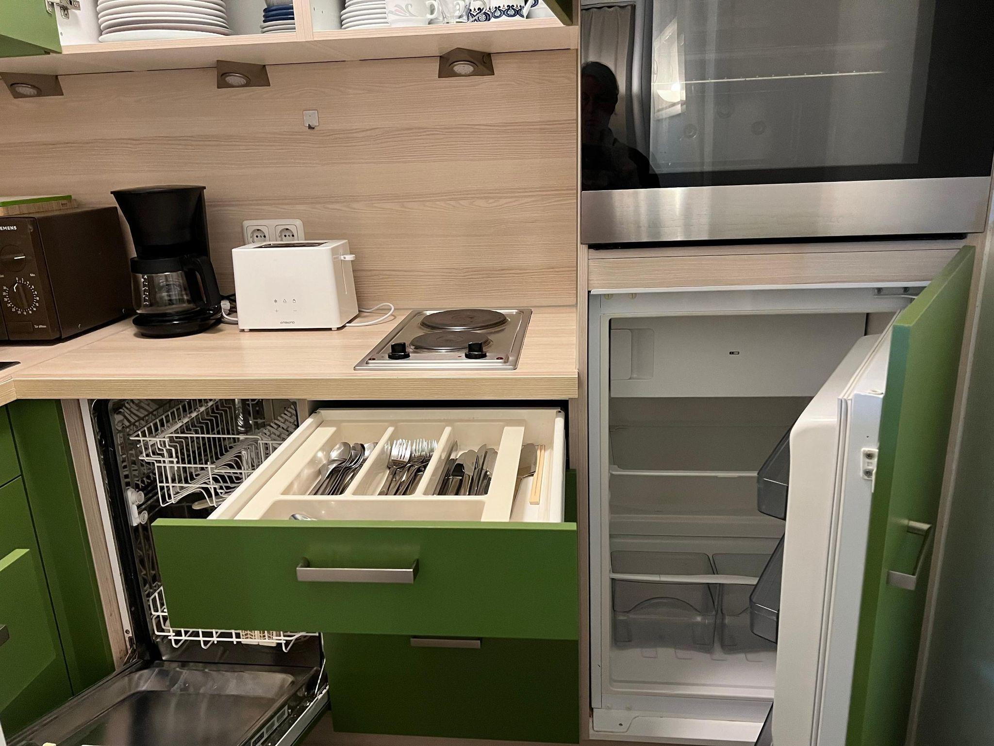 Außerdem bieten wir eine vollausgestattete Küche mit Kaffefiltermaschine, Heißwasserkocher, Toaster, Mikrowelle, Backofen, Spülmaschine und Herd. Optional haben sie die Möglichkeit im Restaurant Geyerei (direkt im Haus) zu frühstücken (Buffet) oder Essen zu gehen (Reservierung notwendig). Waschservice ist buchbar (6 €).
