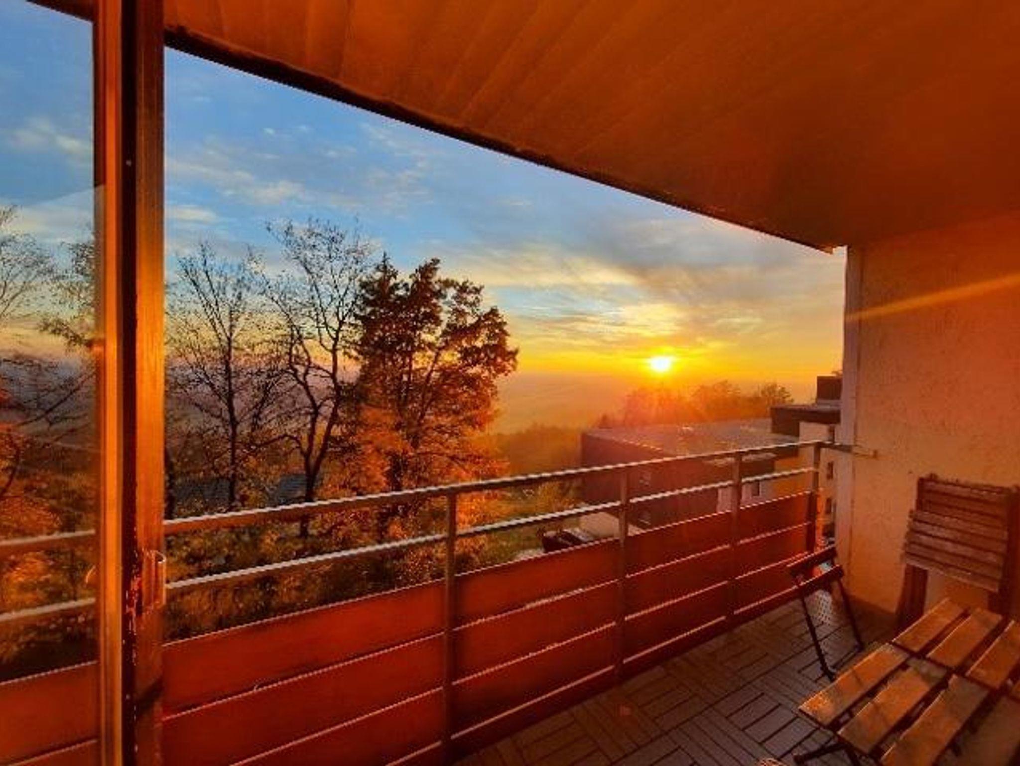 Das 1-Zimmer-Apartment hat einen großen Balkon mit traumhaftem Fernblick. Bei gutem Wetter kann man bis zu den Alpen sehen.
