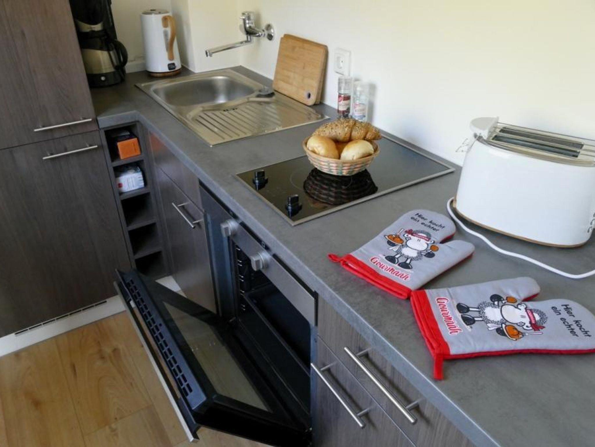 Die separate Küche ist ausgestattet mit Kaffeemaschine, E-Herd, Backofen, Mikrowelle, Toaster, Eierkocher, Wasserkocher und Kühlschrank mit 3*-Gefrierfach.