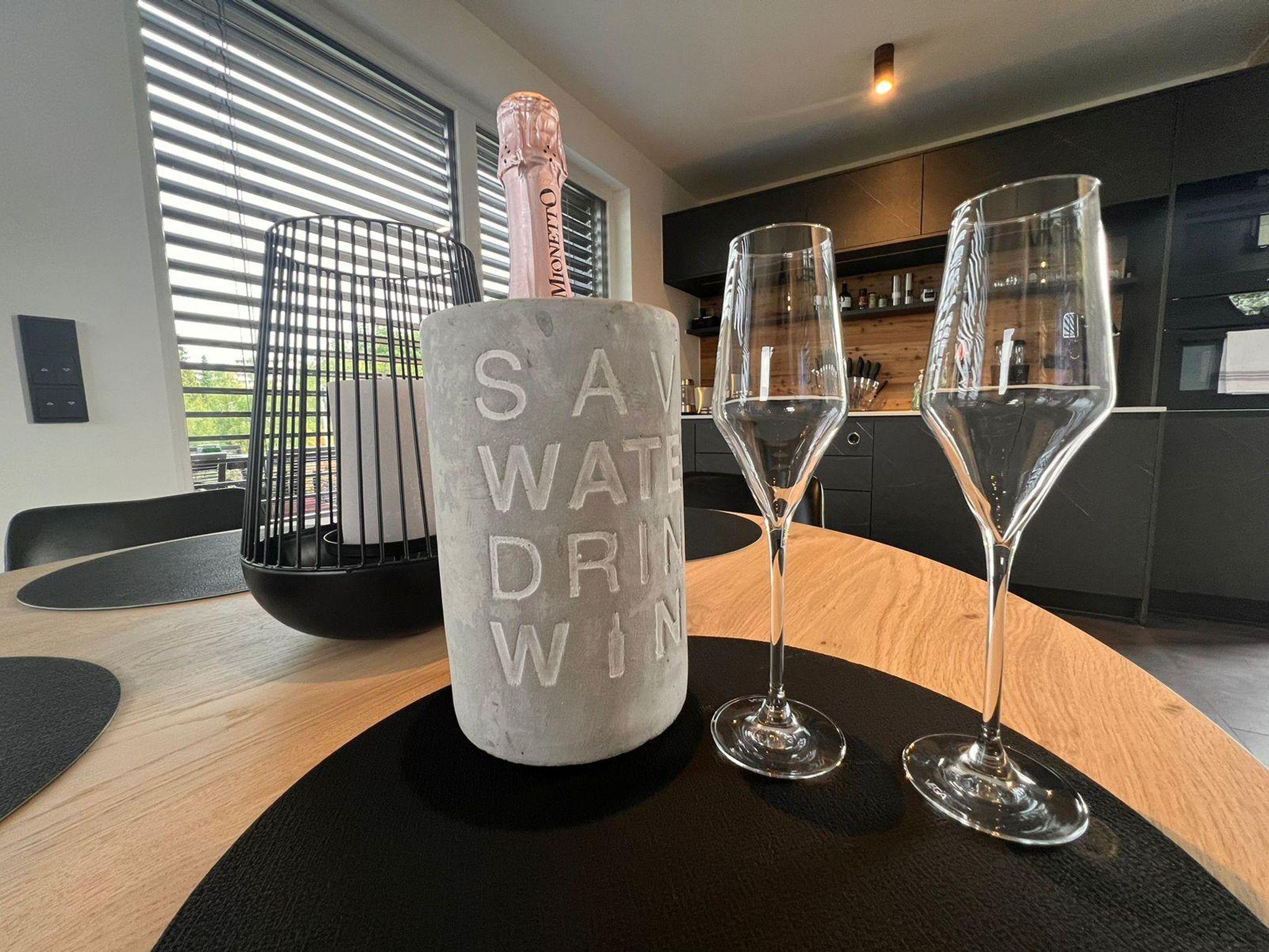 vorhanden. Ein Kaffeevollautomat, Weinkühlschrank, Wasserkocher, Toaster,