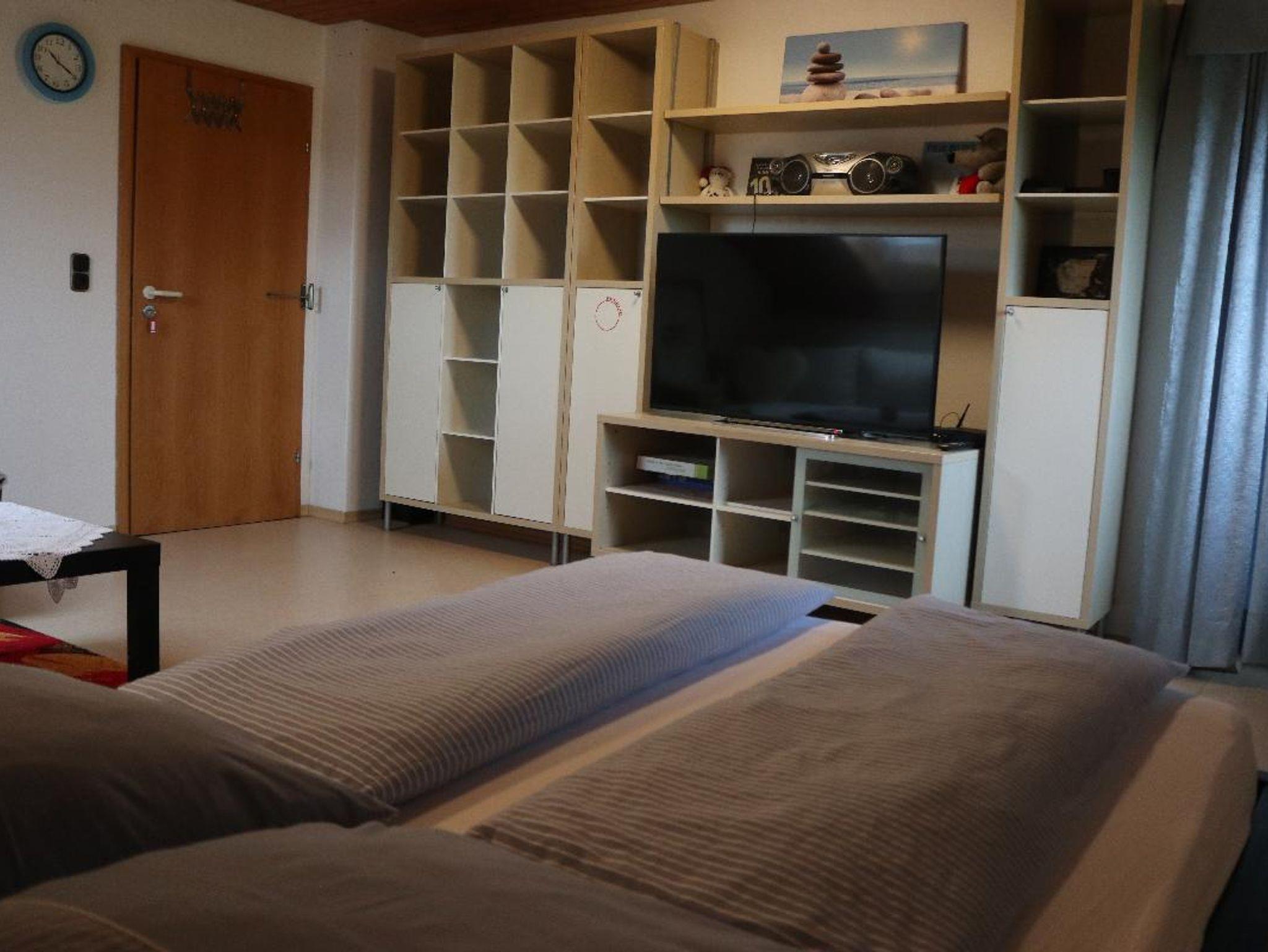 3 Schreibtische. Eine voll ausgestattete Küche mit Essbereich. Modernes Wohnzimmer mit Zugang zum Balkon . Es ist ein WC im Schlafbereich und nähe Wohnbereich ein WC mit Badewanne, Dusche und Waschmaschine..