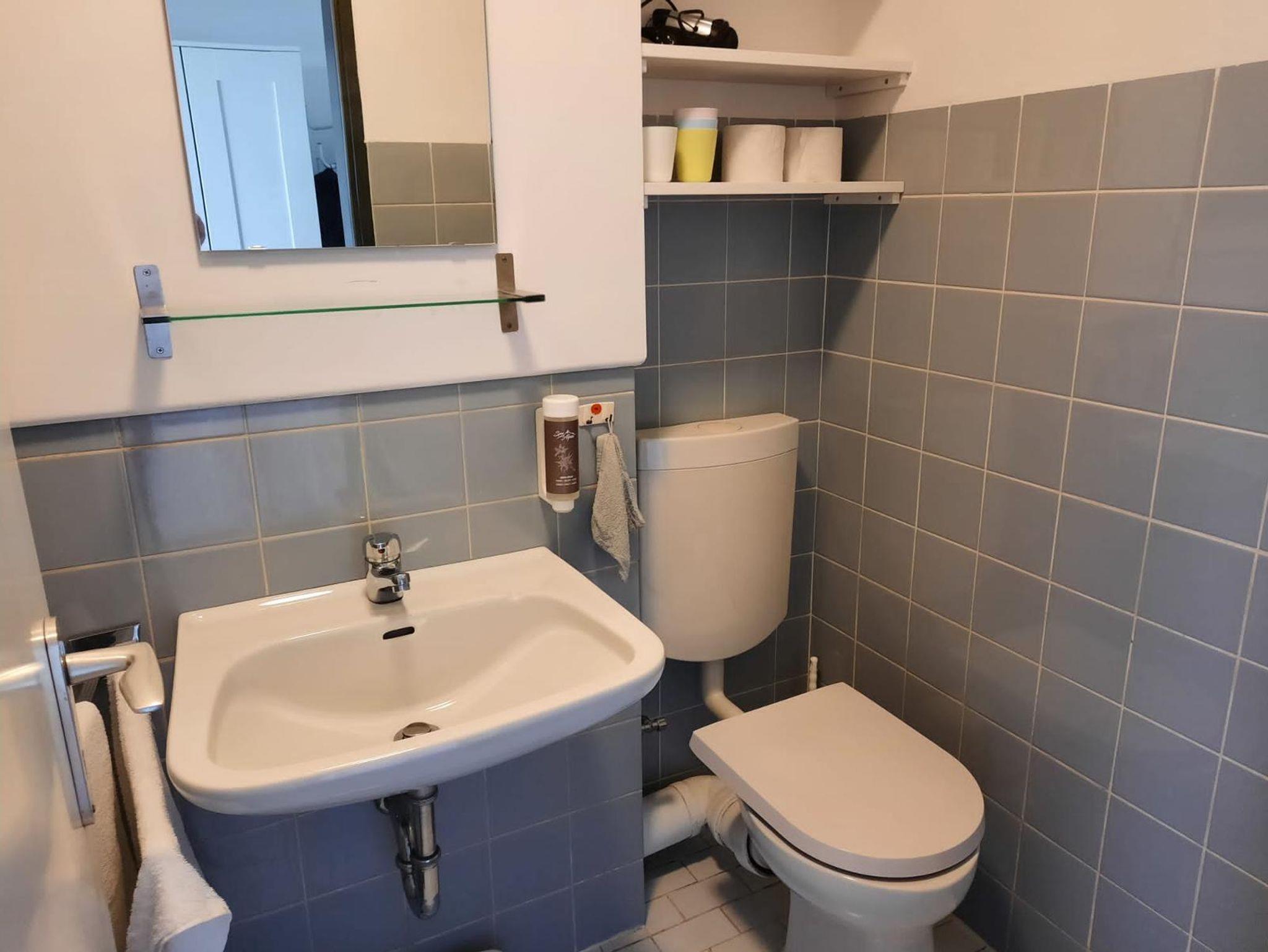 Im innenliegenden Bad befindet sich neben WC und Waschbecken auch die Dusche. Ein geräumiger Flur rundet das Apartment ab.