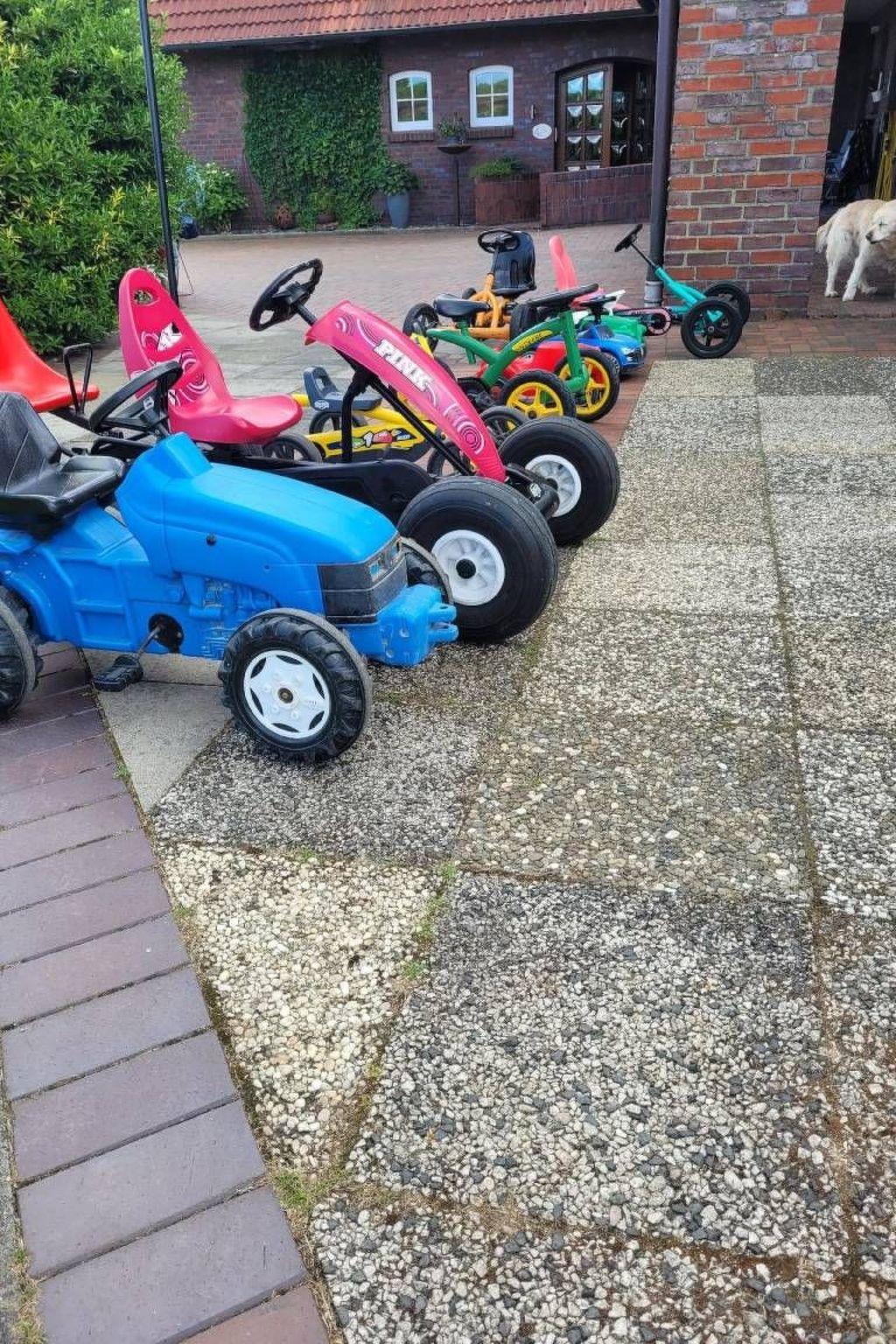 Playground with garden trampoline and pedal vehicles (go-karts, bobby cars etc.) for young and old.