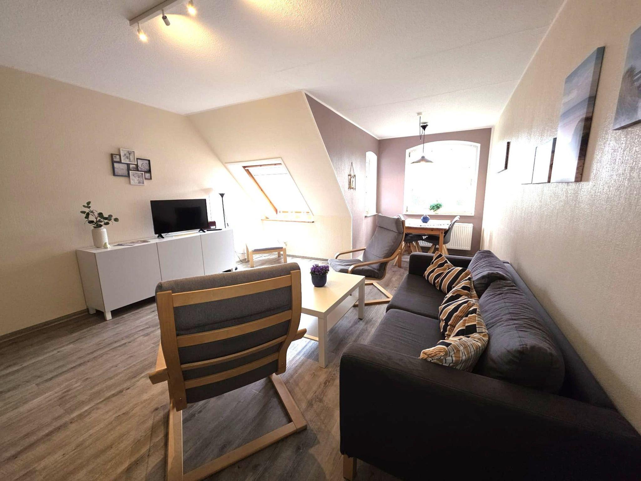 You will stay in a comfortably furnished, approx. 60 square metre, barrier-free 3-room holiday flat on the 1st floor. The centre of the flat is a spacious living area with an open-plan kitchen and dining area for four people. Here you will also find cable TV and a DVD player. Highchairs for children are available if required.
