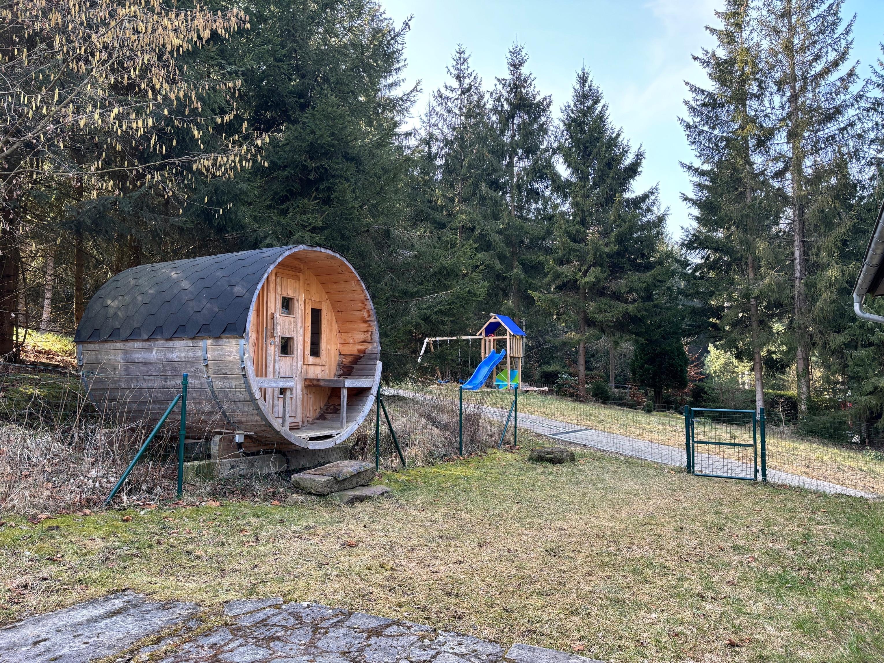 Eine Fasssauna (Elektro) steht zur alleinigen Nutzung, gegen eine Gebühr zur Verfügung.