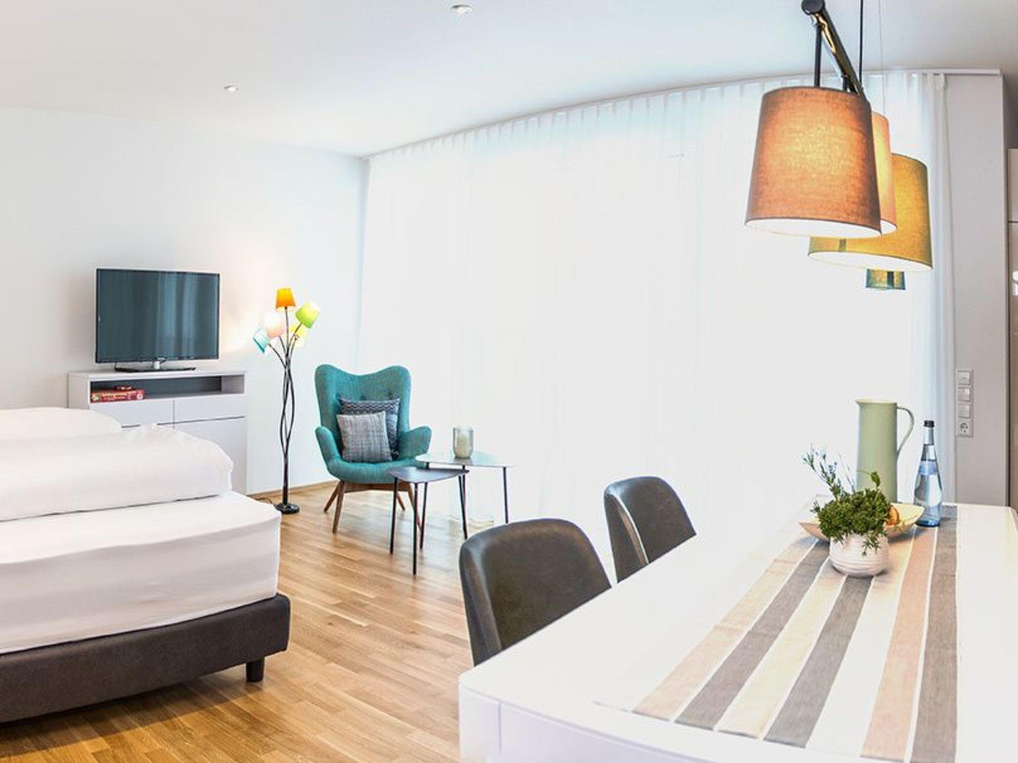 The studio flat with 45 m² is located on the 1st floor and can be reached directly by lift from the reserved underground parking space. The flat is furnished to a high standard and offers:
