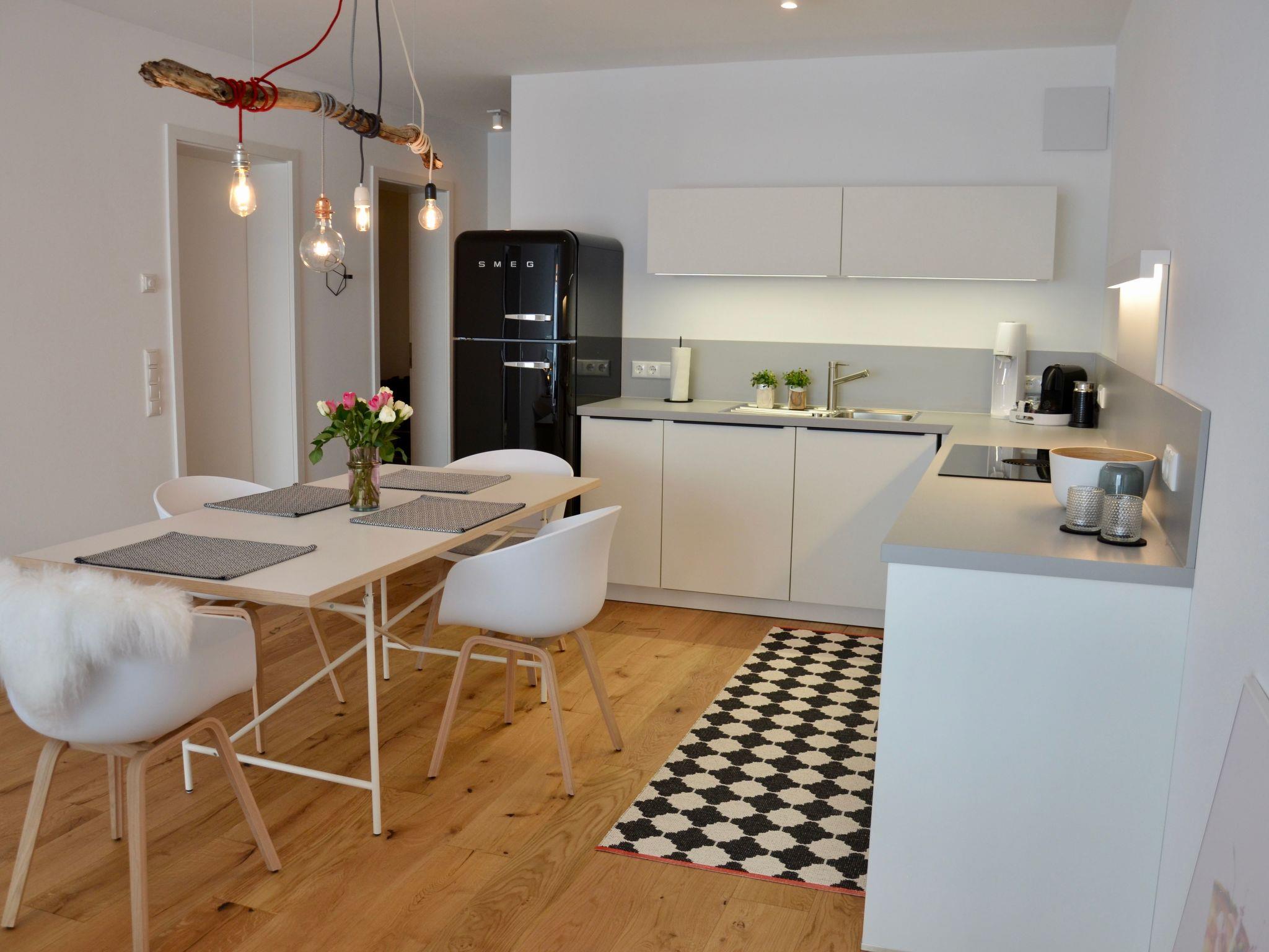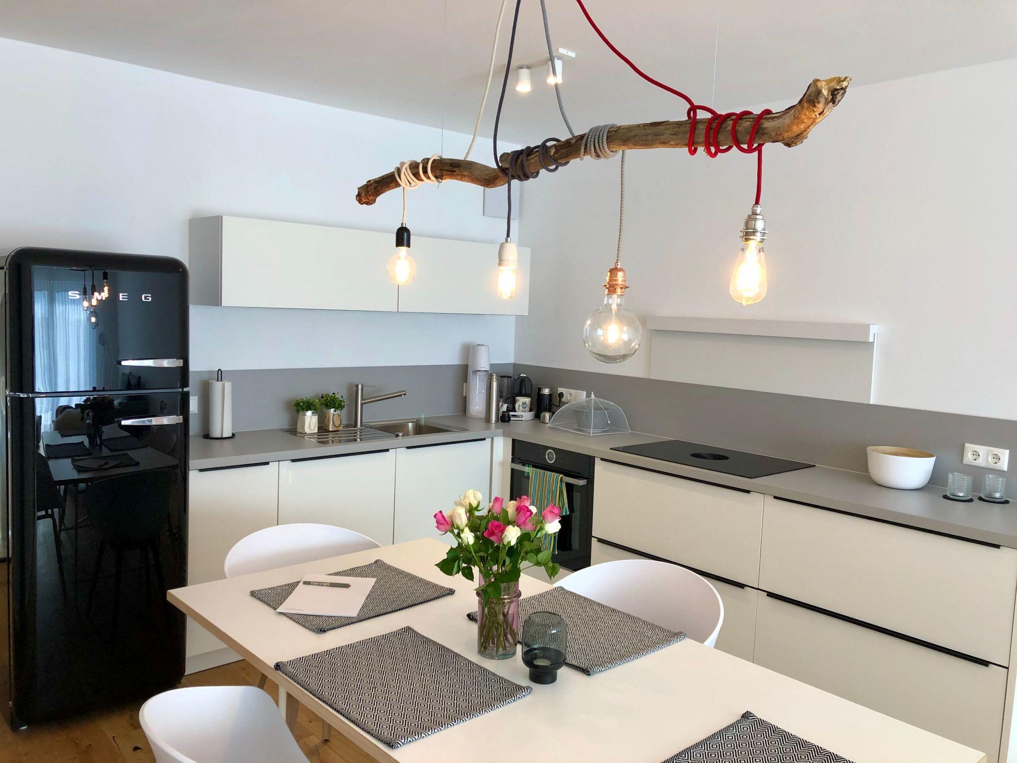 The holiday flat boasts an open-plan living, kitchen and dining area that leads directly onto the large south-facing terrace and into the garden. Extensive technical equipment such as a BORA induction hob with integrated extractor fan, a SMEG fridge-freezer, BOSCH oven and dishwasher as well as free WiFi and cable TV fulfil all the requirements of modern living. A comfortable bedroom offers direct access to the terrace and garden and is ideal for working with a desk. The spacious bathroom with walk-in shower and bathtub rounds off the high-quality living space.