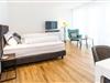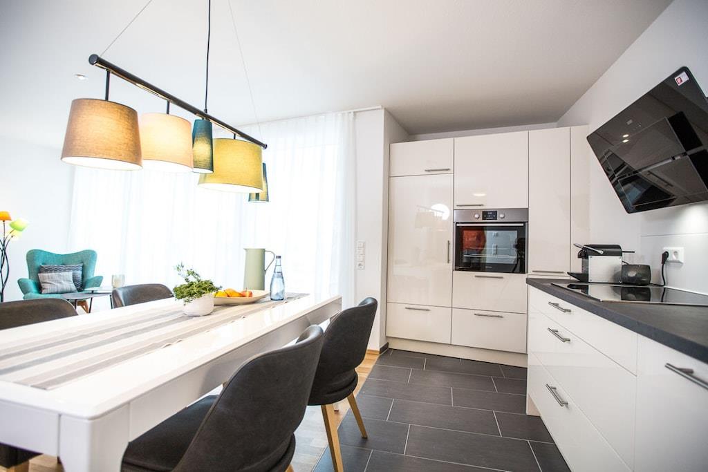 Die Ferienwohnung verfügt über eine gehobene Ausstattung und bietet Platz für 2 Erwachsene. Weitere Features: - 1 Doppelbett mit 2 x 90 er Boxspringbetten mit Komfortmatratze - großes Badezimmer mit Dusche und Toilette - separater Raum für Kleidung - offenes Wohn- und Esszimmer mit umfangreichem Küchenequipment, und einem Esstisch für 4 Personen - Nespresso Kaffeemaschine - Moderner Smart- TVs mit High-Speed W-LAN - großzügiger Balkon mit Platz für bis zu 4 Personen - eigener Tiefgaragenstellplatz und Fahrradkeller direkt im Haus. - Waschmöglichkeiten auf Anfrage, Bügelbrett etc. sind vorhanden. Alle Räume (bis auf das Bad) sind mit Eichenholzparkett und einer Fußbodenheizung ausgestattet