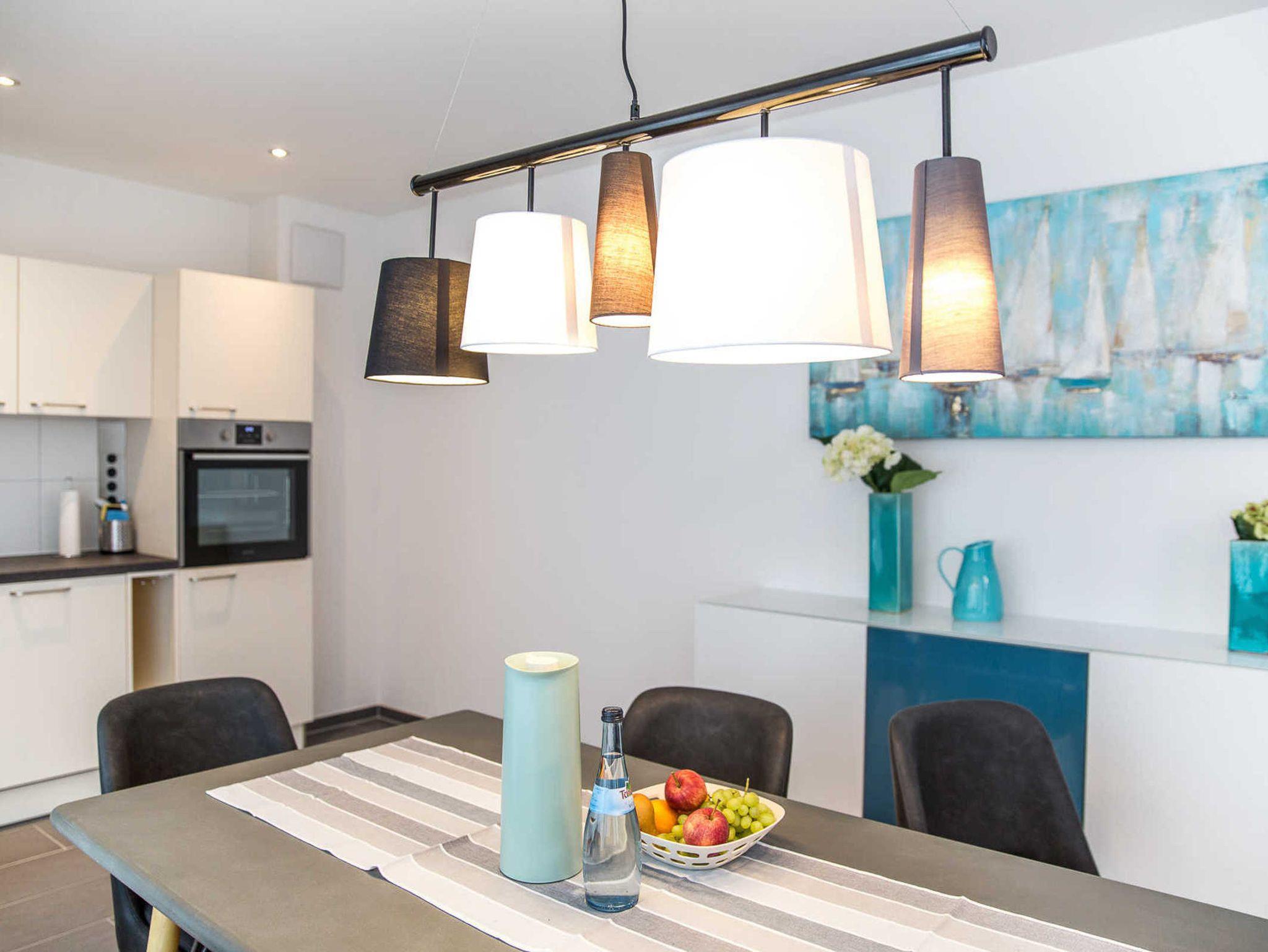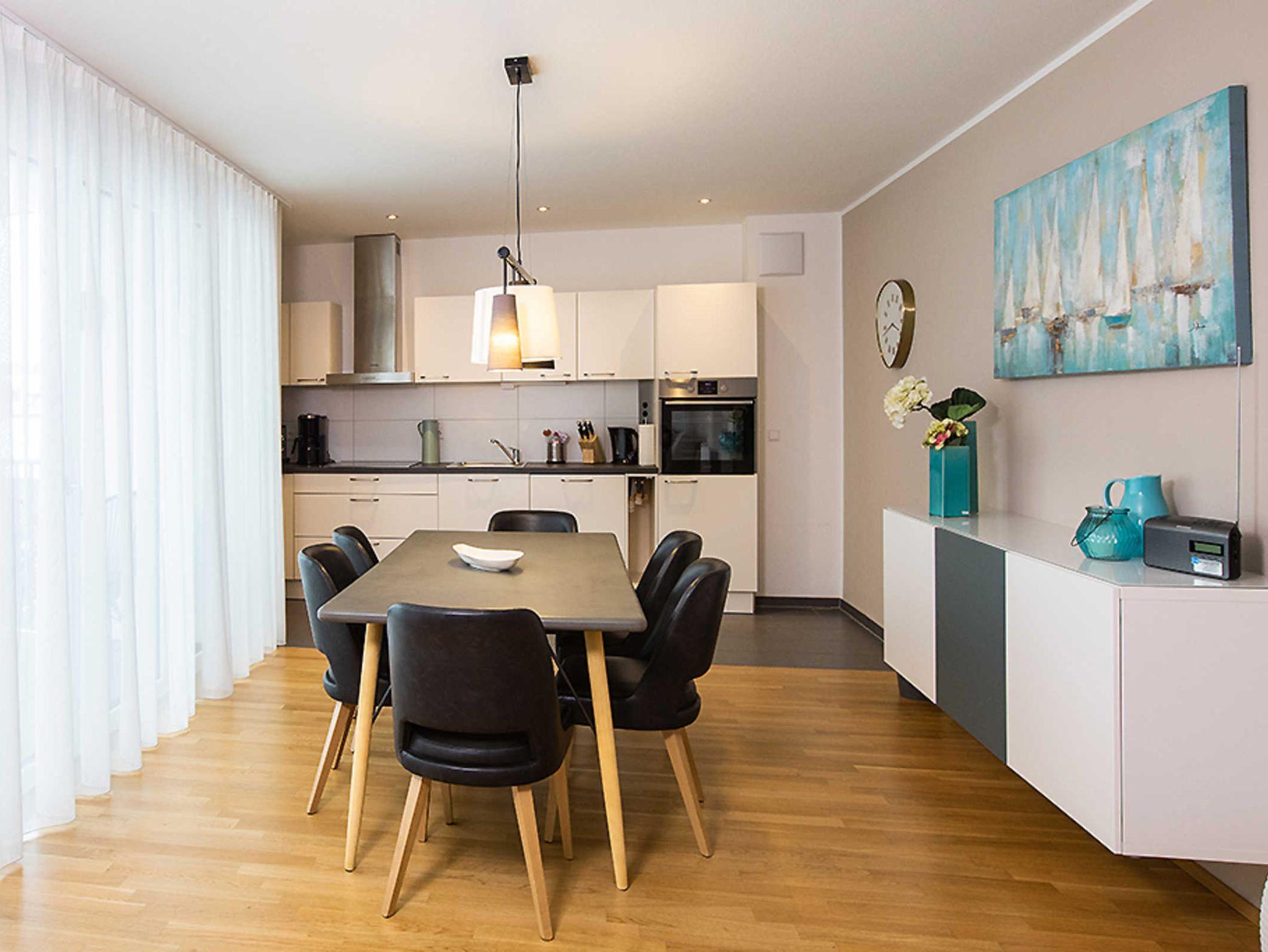Die Wohnung verfügt über eine gehobene Austattung für bis zu 4 Personen, großzügiger Balkon mit Platz für bis zu 4 Personen - eigener Tiefgaragenstellplatz und Fahrradkeller direkt im Haus. Alle Räume (bis auf das Bad) sind mit Eichenholzparkett und einer Fußbodenheizung ausgestattet.