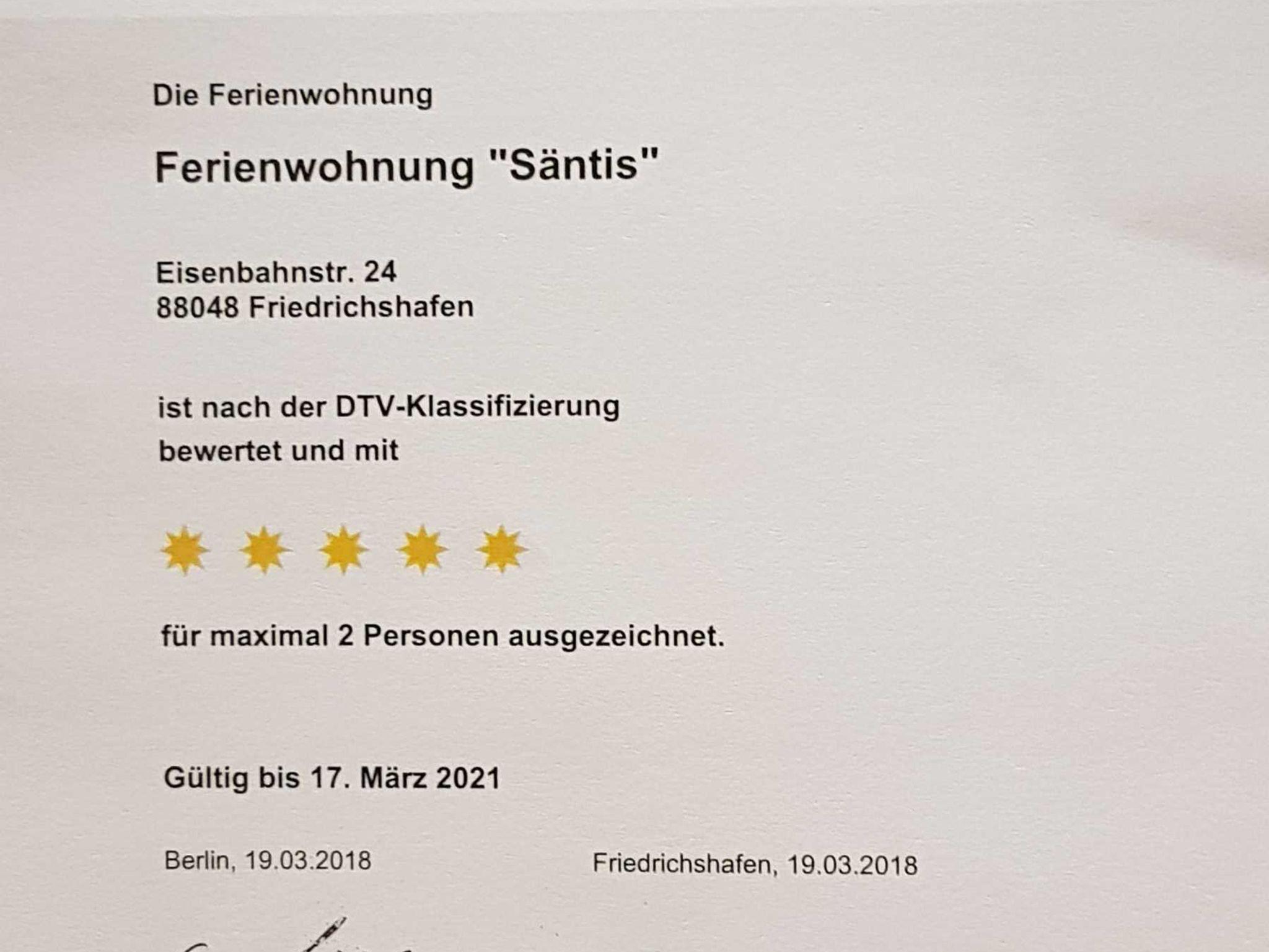 Die Ferienwohnung Säntis ist vom Deutschen Tourismus Verband mit 5 Sternen ausgezeichnet worden.