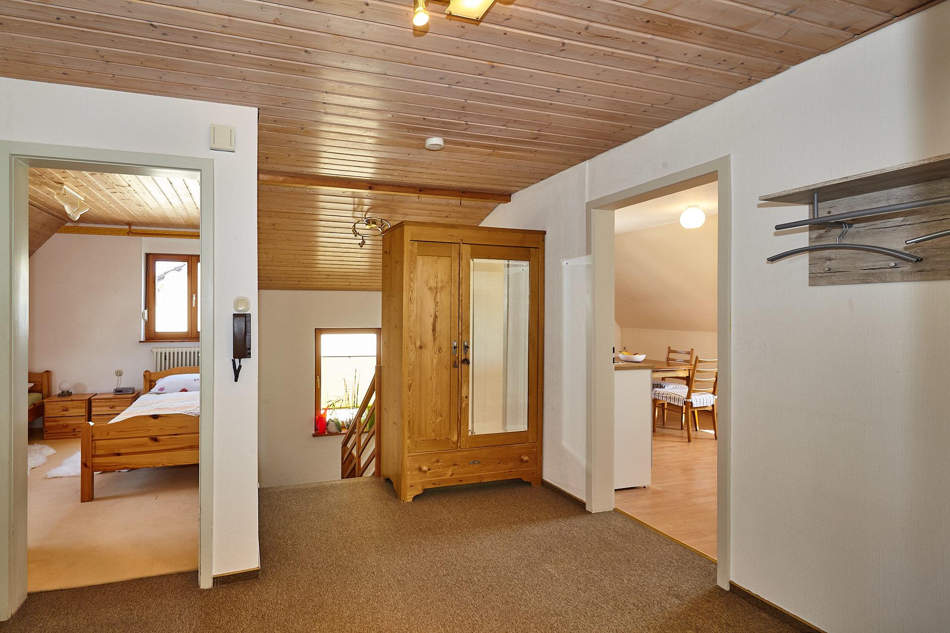 Alle Zimmer befinden sich auf einer Etage. Die abgebildete Treppe im Wohnzimmer führt in private Räume, die nicht genutzt werden und für einen späteren Ausbau der Wohnung gedacht sind.