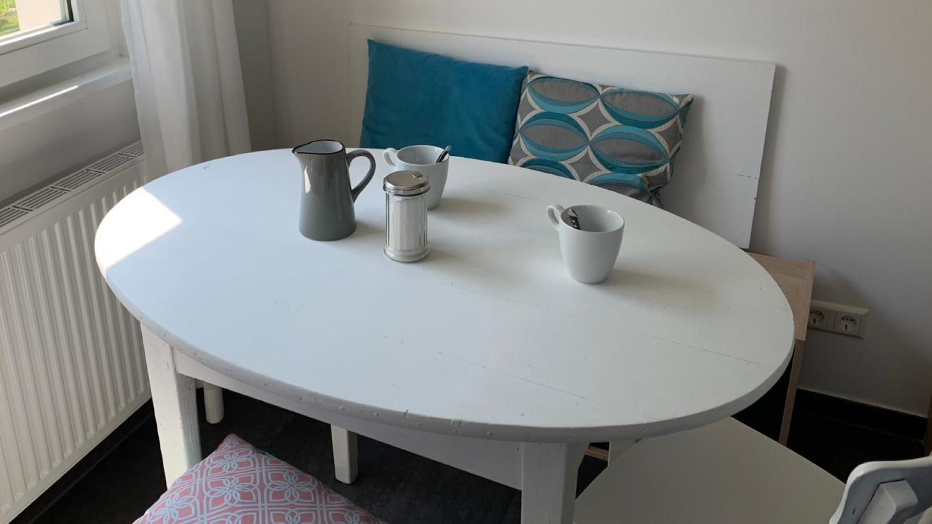 • Einbauküche mit Induktionsherd, Backofen, Kühlschrank mit Gefrierfach, Wasser-/Eierkocher, Kaffeemaschine und Toaster