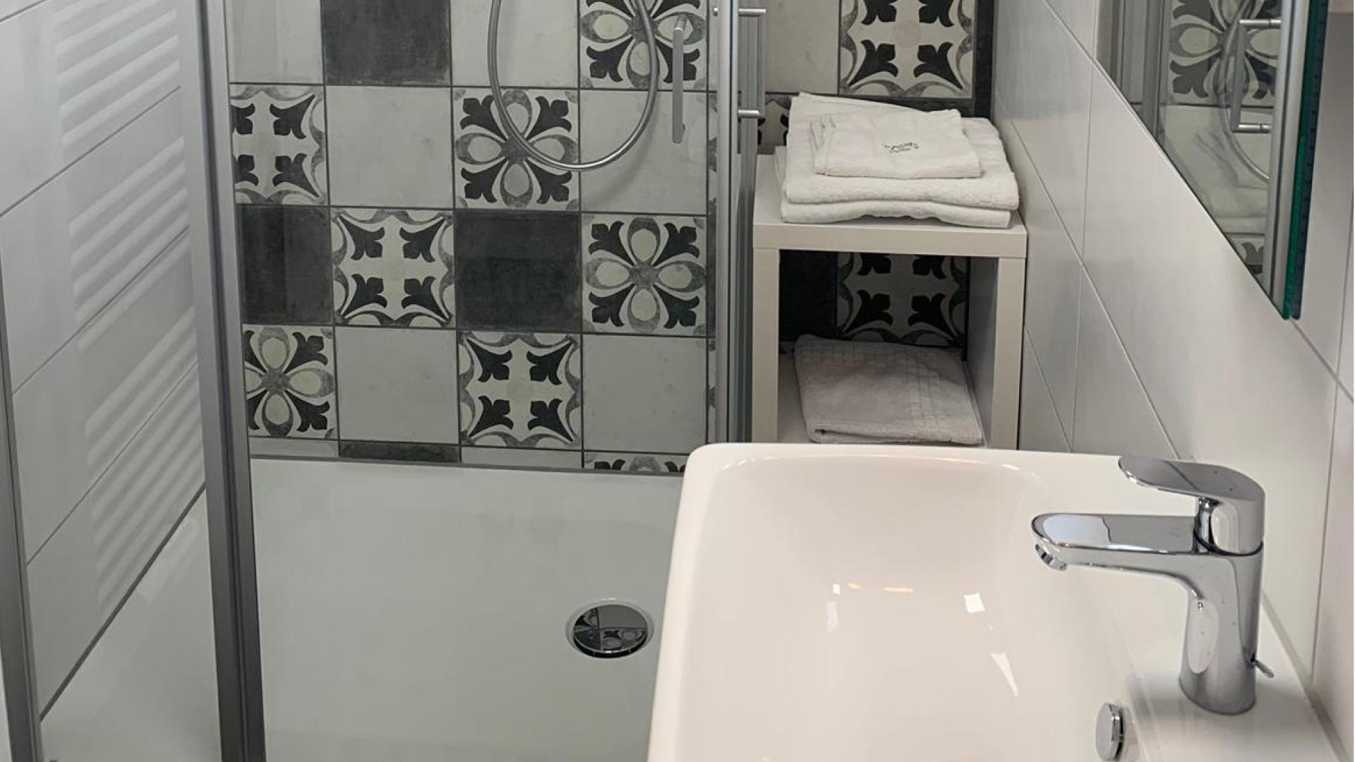 • Badezimmer mit Dusche, WC, Föhn, Handtuchwärmer und Kosmetikspiegel
