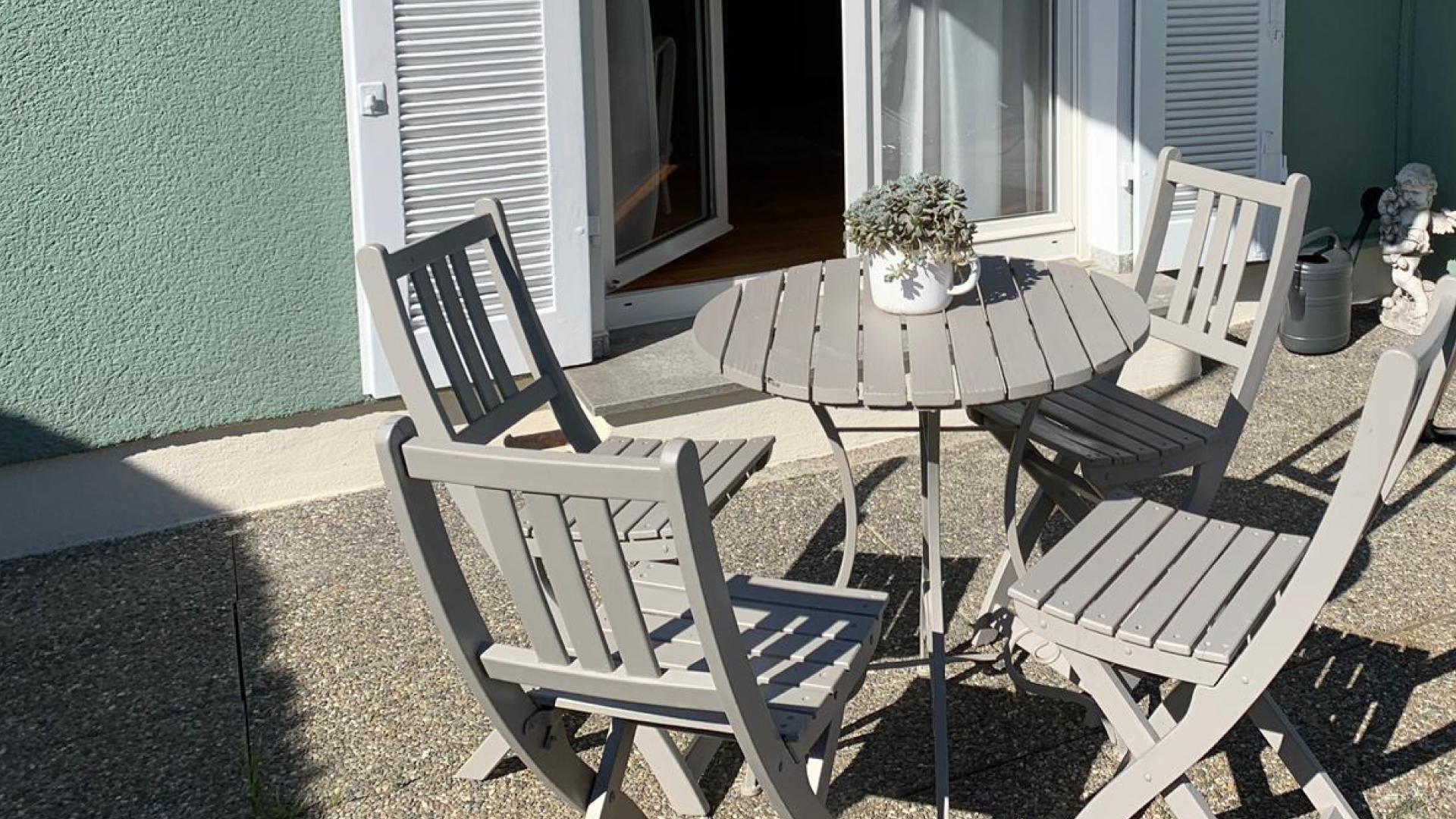 Liebevoll eingerichteter Wohn- und Schlafraum für 2 Personen mit großem Doppelbett und hochwertigem Schlafsofa, Badezimmer mit Dusche, WC, Föhn, Handtuchwärmer und Kosmetikspiegel, Einbauküche, Überdachte 20 m² Terrasse mit großzügigem Garten, Ausblick: in den Garten Fußweg direkt am See: nur 10 Min. zum Strandbad, zum Zentrum Friedrichshafen ca. 25 Minuten, Lage: EG