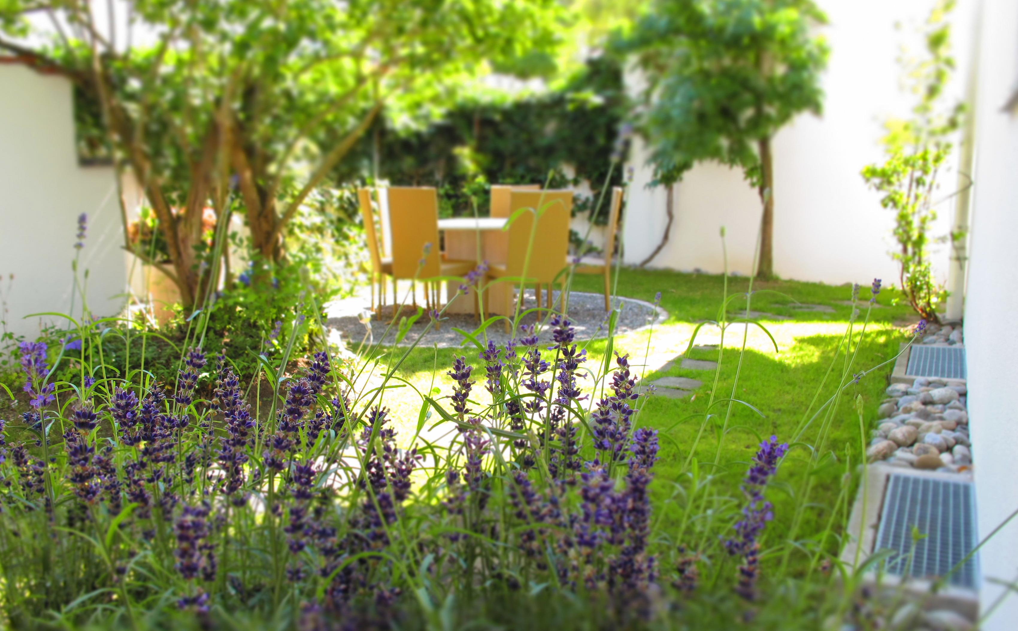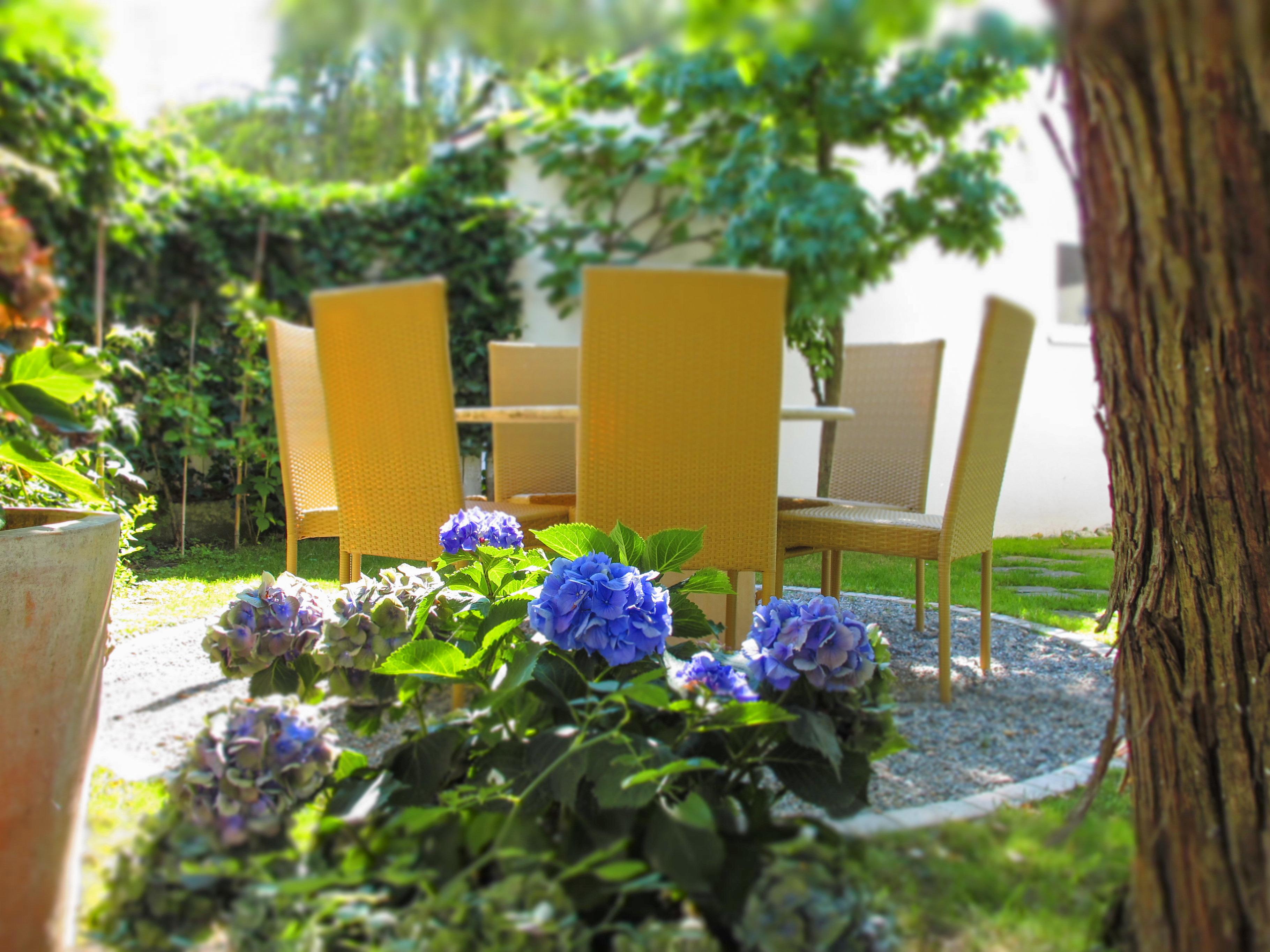 Der neu angelegte Garten mit mehreren Terrassen, Sitzplätzen, Liegewiesen sowie großem Teich mit Wasserfall lädt zum Verweilen, Entspannen und Grillen ein.
